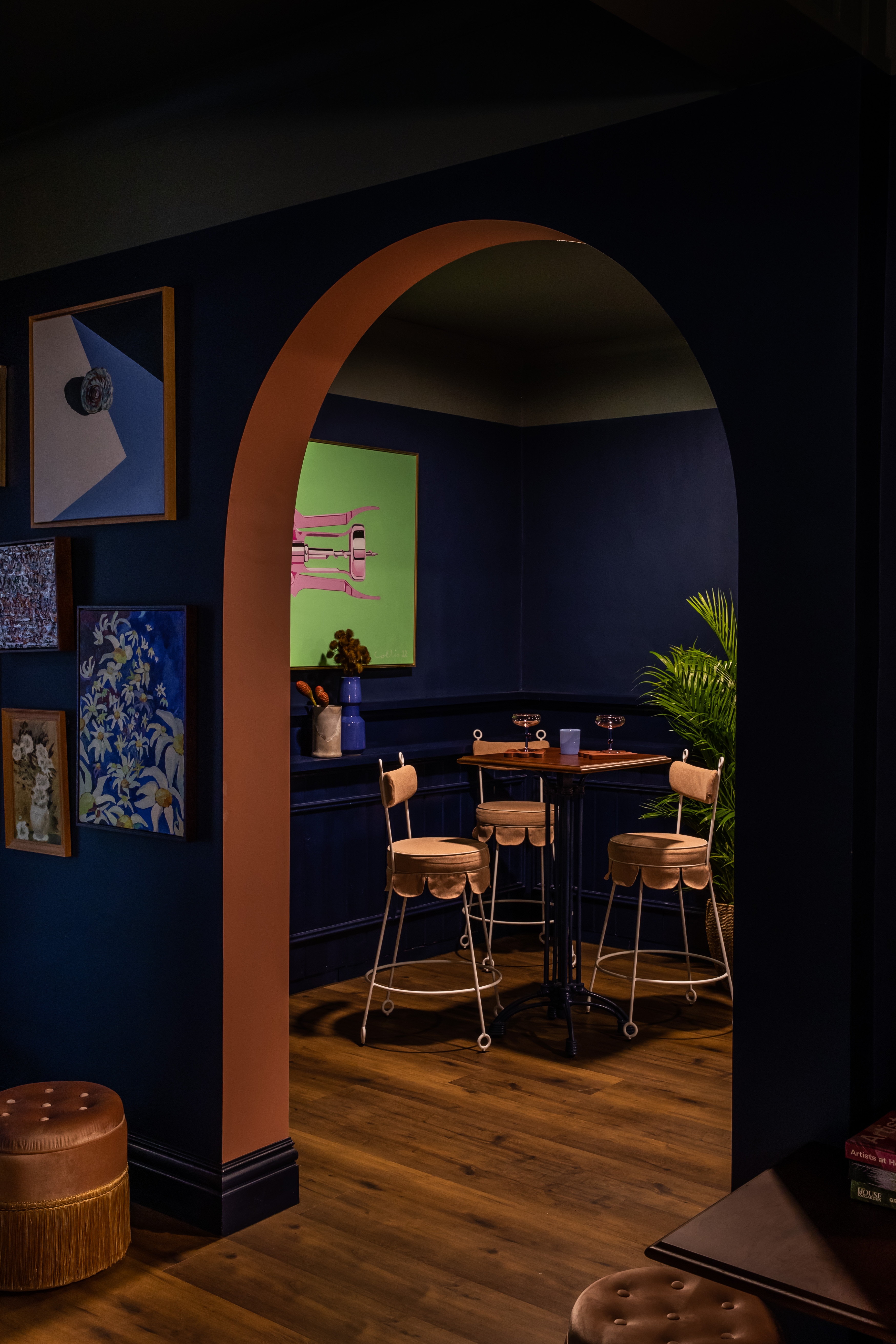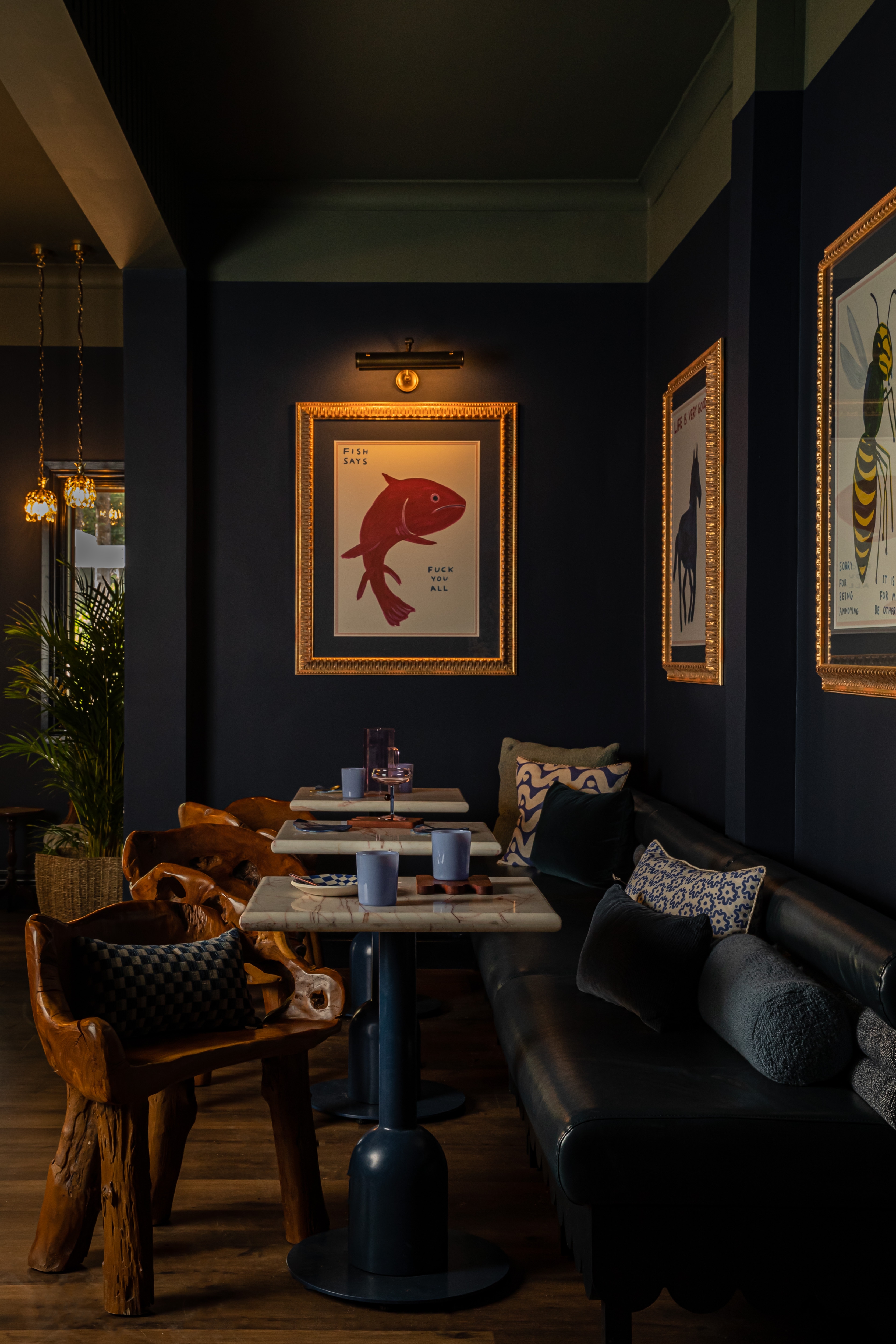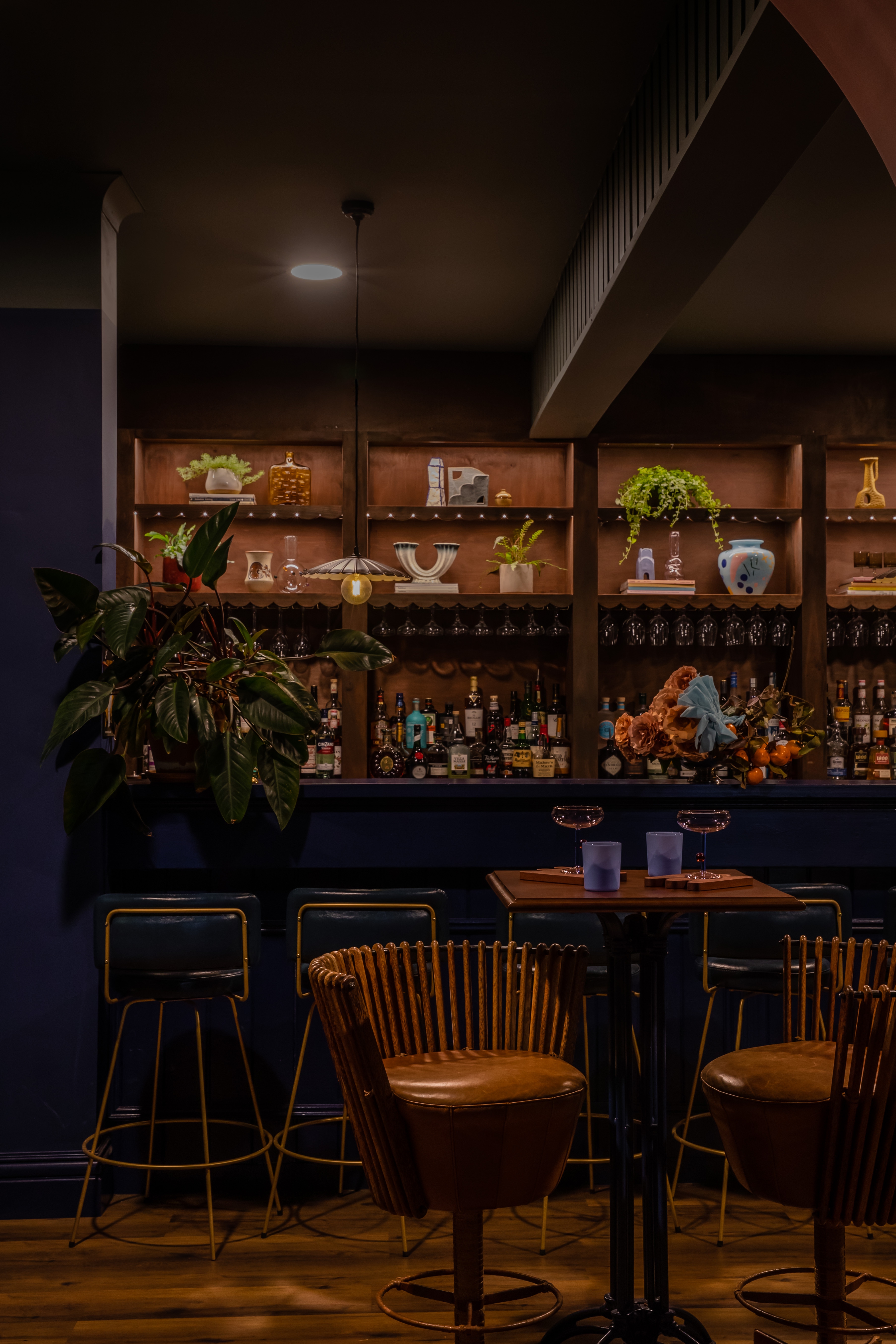 Through an arched corner of the dining room, you will find a cosy spot to spend the night, the moody cousin to Lulu's restaurant at the Lodge, a mesmerizing haven of mystery and eclectic charm. Here the dark blue velvety tone of the walls creates an atmosphere of depth and allure, reminiscent of the night sky itself, tempting you to get lost in the evening.