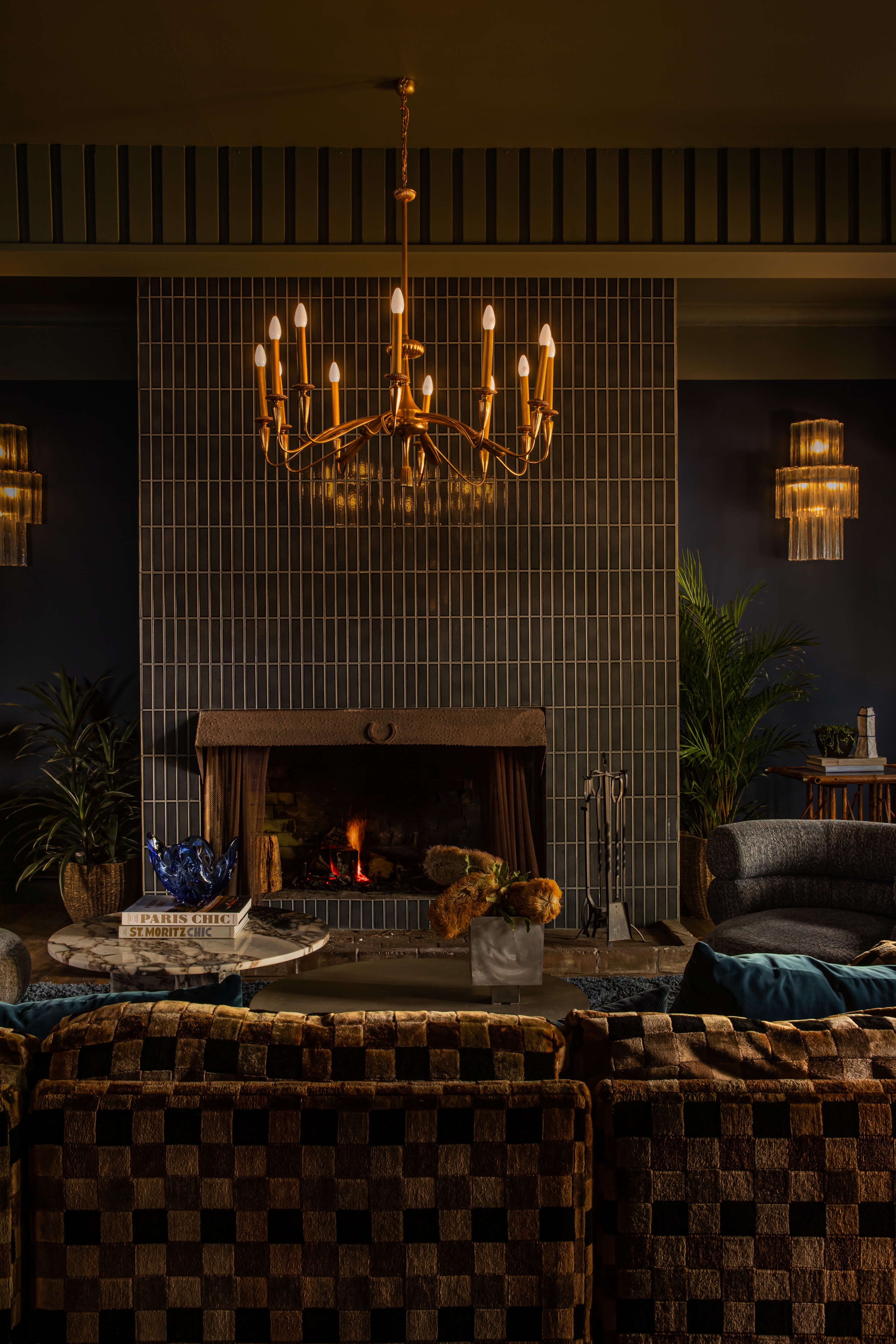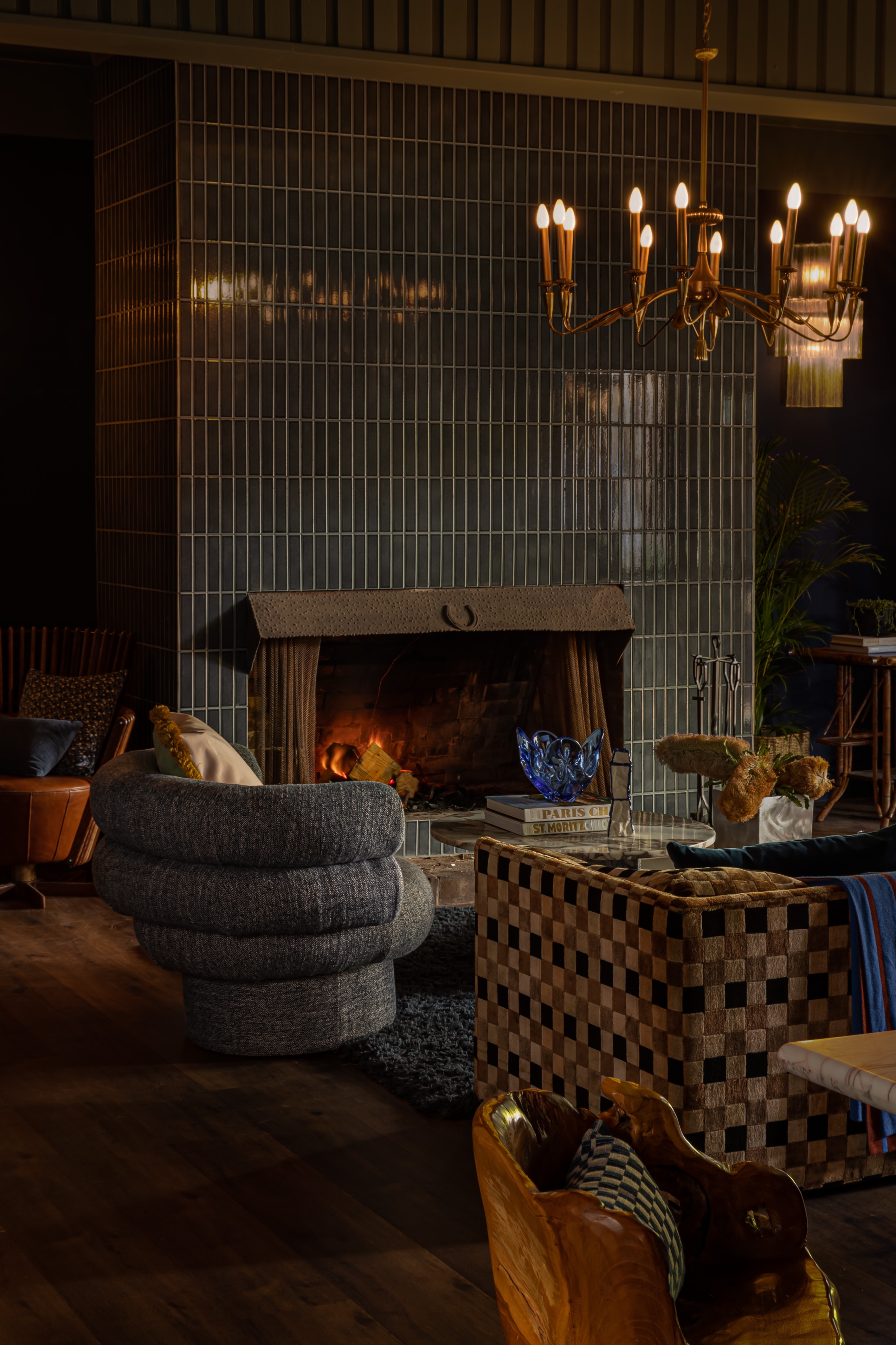 In this inky, murky setting, unexpected bursts of pink emerge, teasing the eye and adding a touch of the whimsical, flamboyant. The space invites you to settle in and relax, embarking on a nocturnal journey, lounging around the fireplace, sipping on cocktails, perched at the bar, and relishing the company of friends and family.