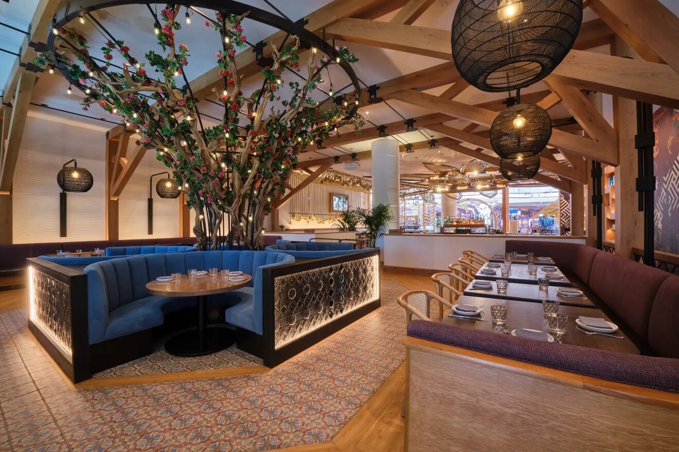 As guests arrive at the indoor promenade patio, the dynamic and lively seating area pulls the feel of an outdoor taqueria right to the front of the restaurant. Wooden arches welcome guests and create a vignette for an unexpected sight: the entry's large 'exploding flower' infinity mirror.