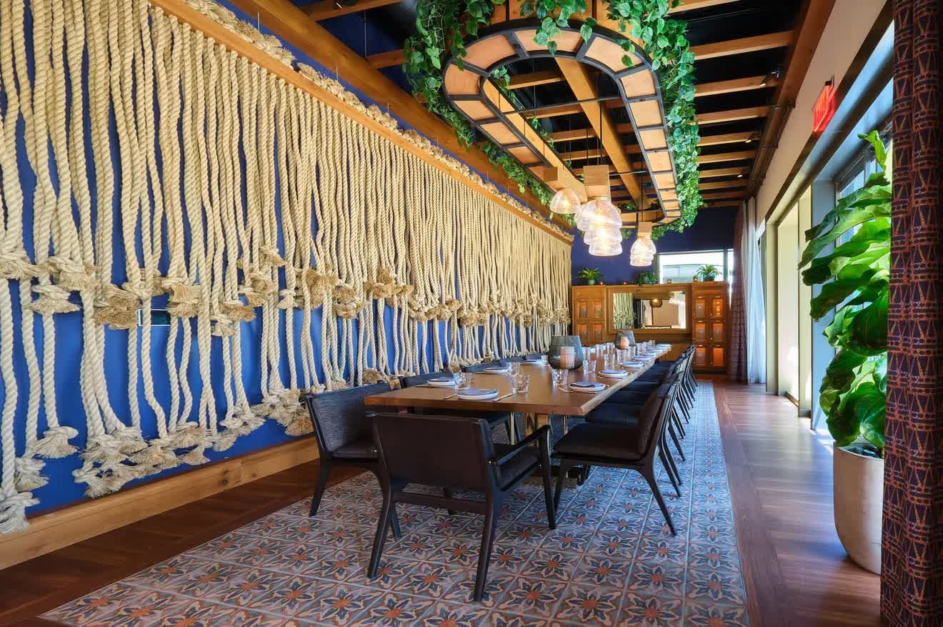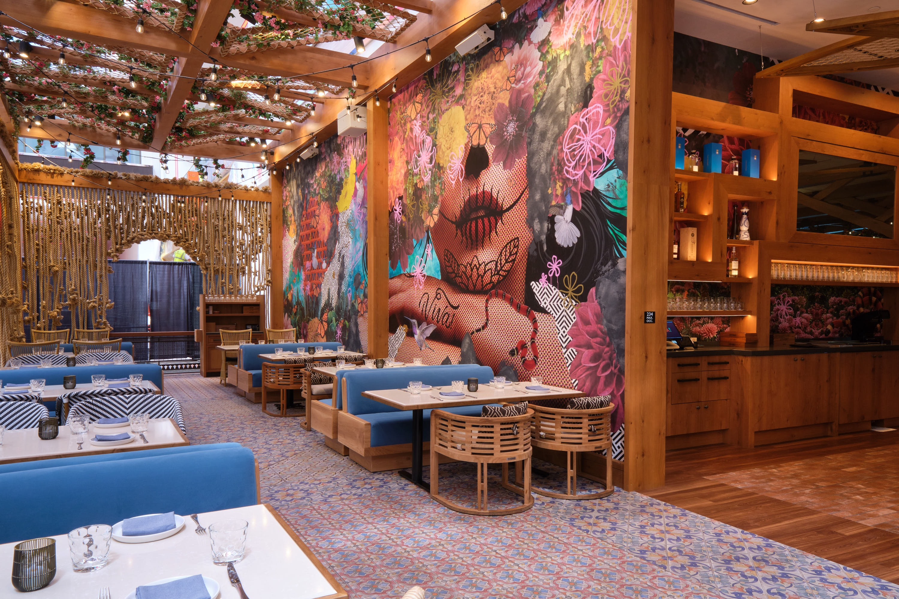 Once inside, the design is all about tequila. The mural from the promenade patio wraps into the bar area and serves as the backdrop for the stair-step style display of tequila bottles; the modern display is inspired by the architecture of ancient ruins around Mexico. The influence of tequila continues with the bar's main design feature: a massive wood-and-rattan piece suspended over the bar that's inspired by the blue agave plant.