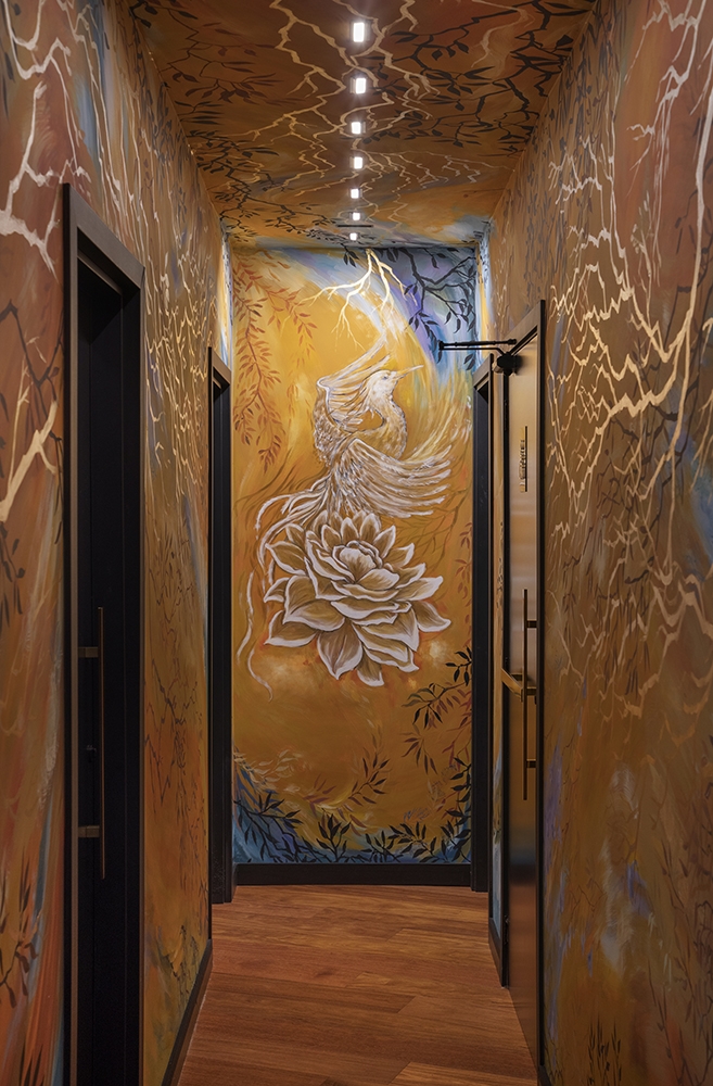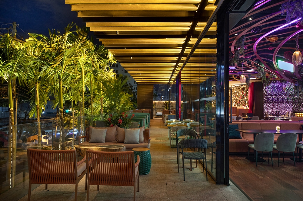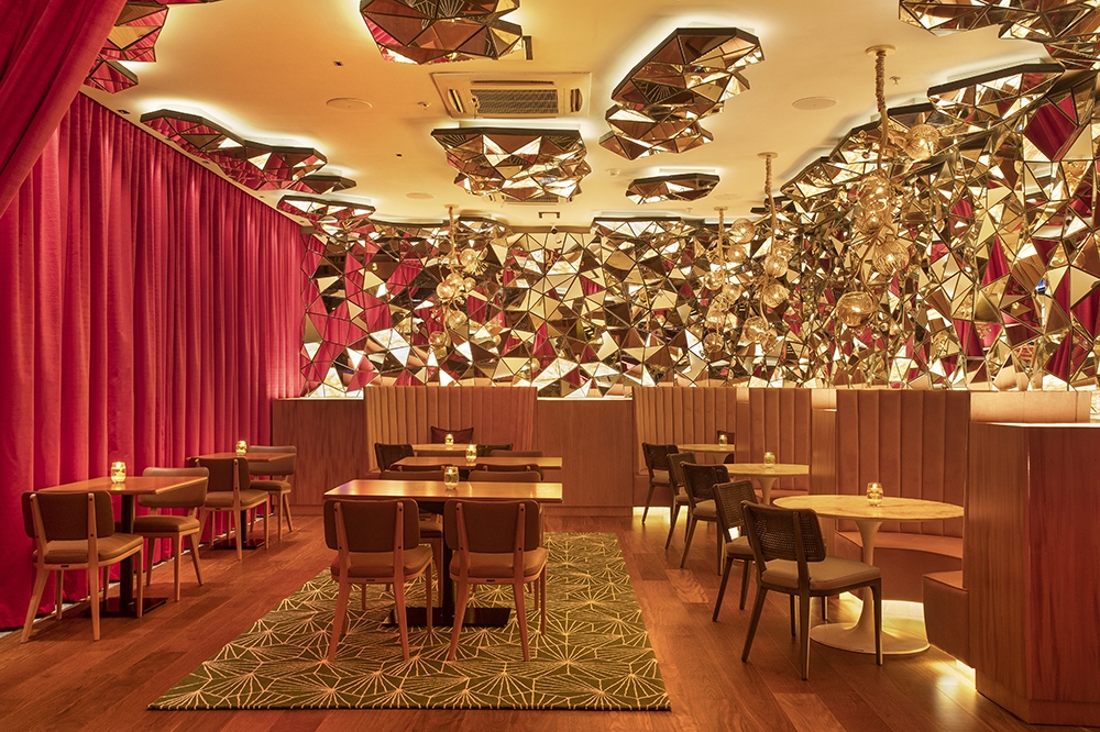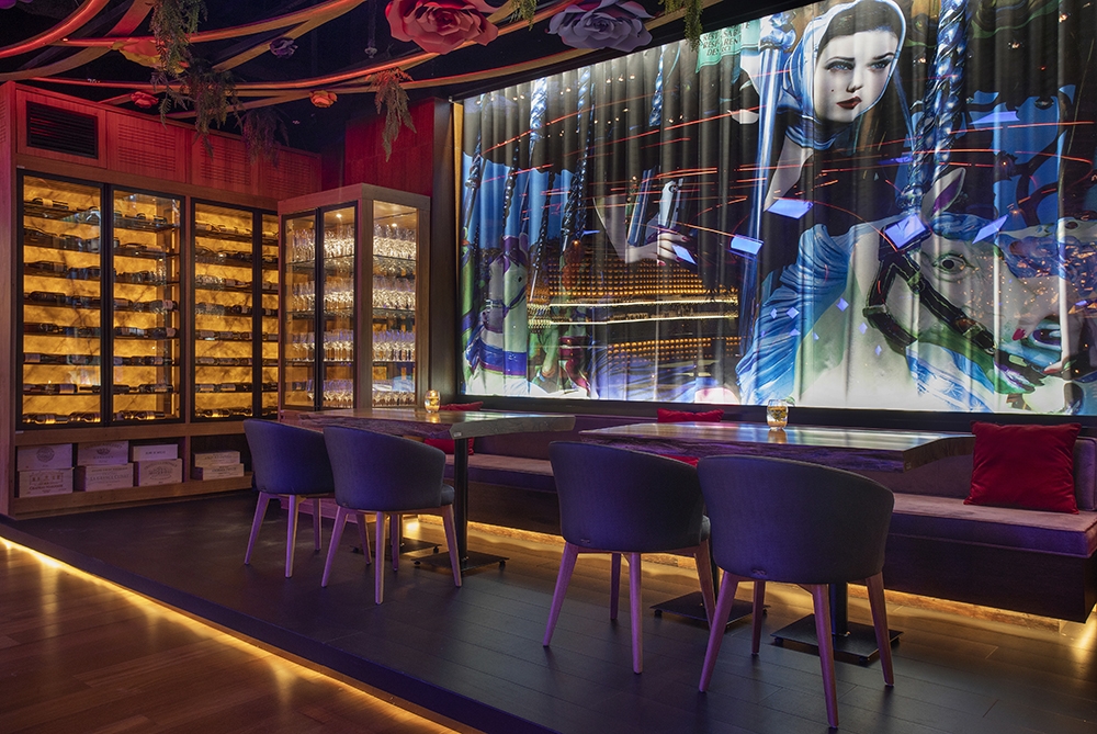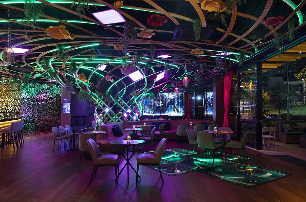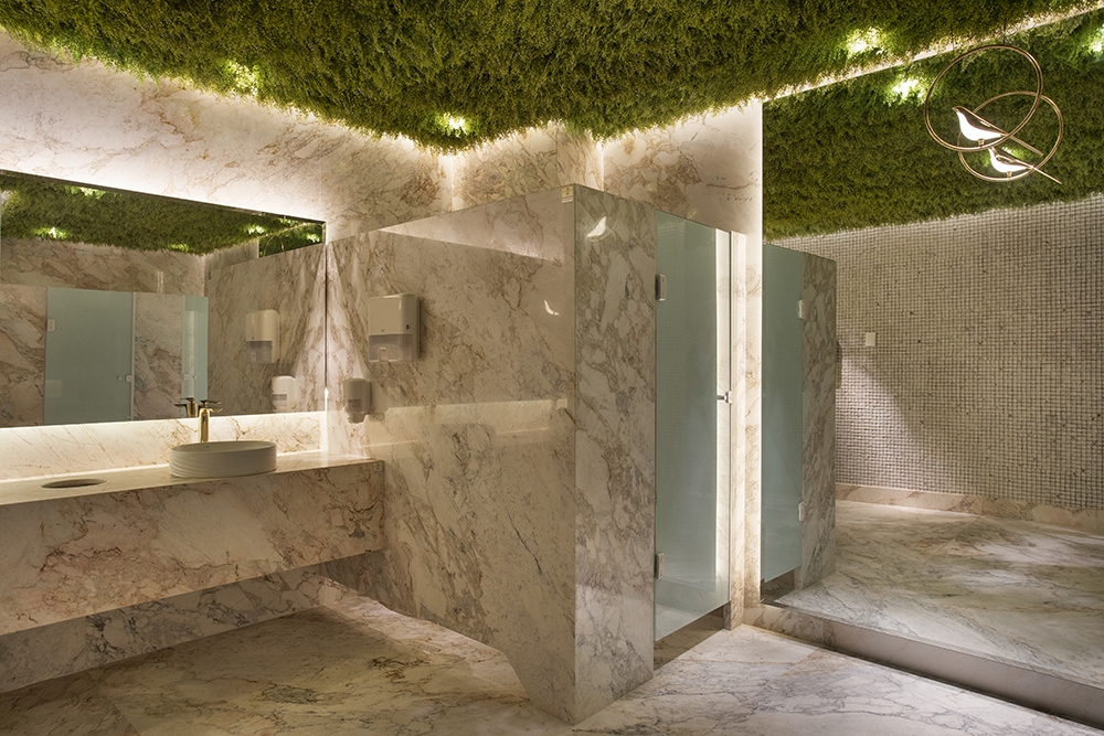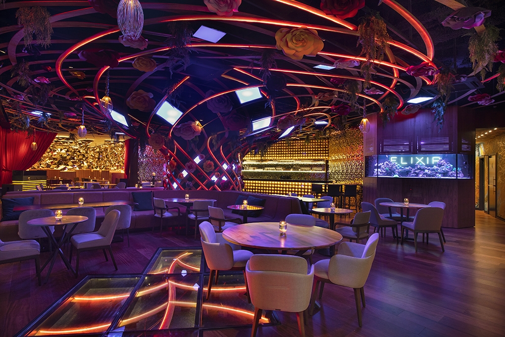 Other high points are: the hall of mirrors, and the golden bar which contrasts with dozens of out-of-waste coconut shells. Also, there is a salt-water aquarium representing the Mediterranean Sea. A hand painted artwork decorates the hall of Its lavatories, which are made out of a combination of marble and coconut-made panels. Elixir, a contrast between natural and sophisticated elements bringing balance and comfort to its
