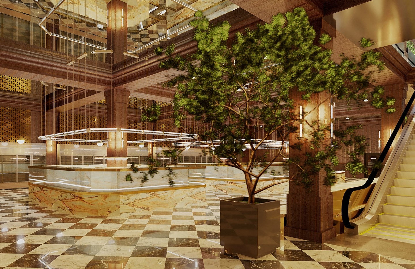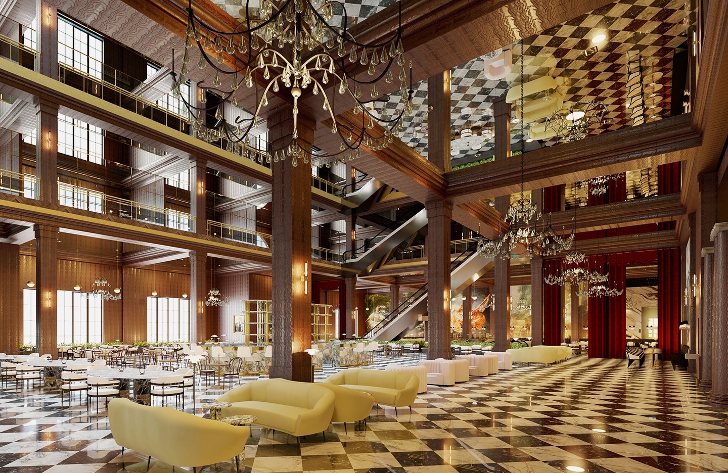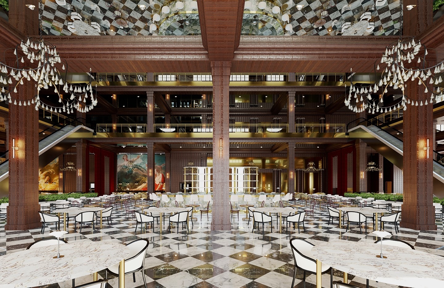 The department store industry is constantly evolving its business model. Nonetheless, the number of physical department stores is decreasing despite the luxury industry's growth. To stay relevant, department stores need to cater to the changing needs of their customers and communities, necessitating a new approach to enhance customer experience by integrating services and spaces for socialization, accommodation, relaxation, and nutrition, transforming department stores into destinations. Rich’s is rooted in a distinctive business model that draws inspiration from European precedents and integrates the quality of timelessness as an additional source of value. Adhering to the ‘Luxury for Revitalization’ framework, the concept and design revolve around history, location, meta-luxury, authenticity, identity, space, and aesthetics holistically. Guests are welcomed in the grand room, which houses a central bar and lounge seating for guests; the Magnolia Room is positioned to the west; the lower level houses a fine grocery complete with a bakery, cafe, meat and seafood sections, select items, spirits and wine, coffee bar, confectionary, oyster bar, champagne and caviar bar, and meat bar.