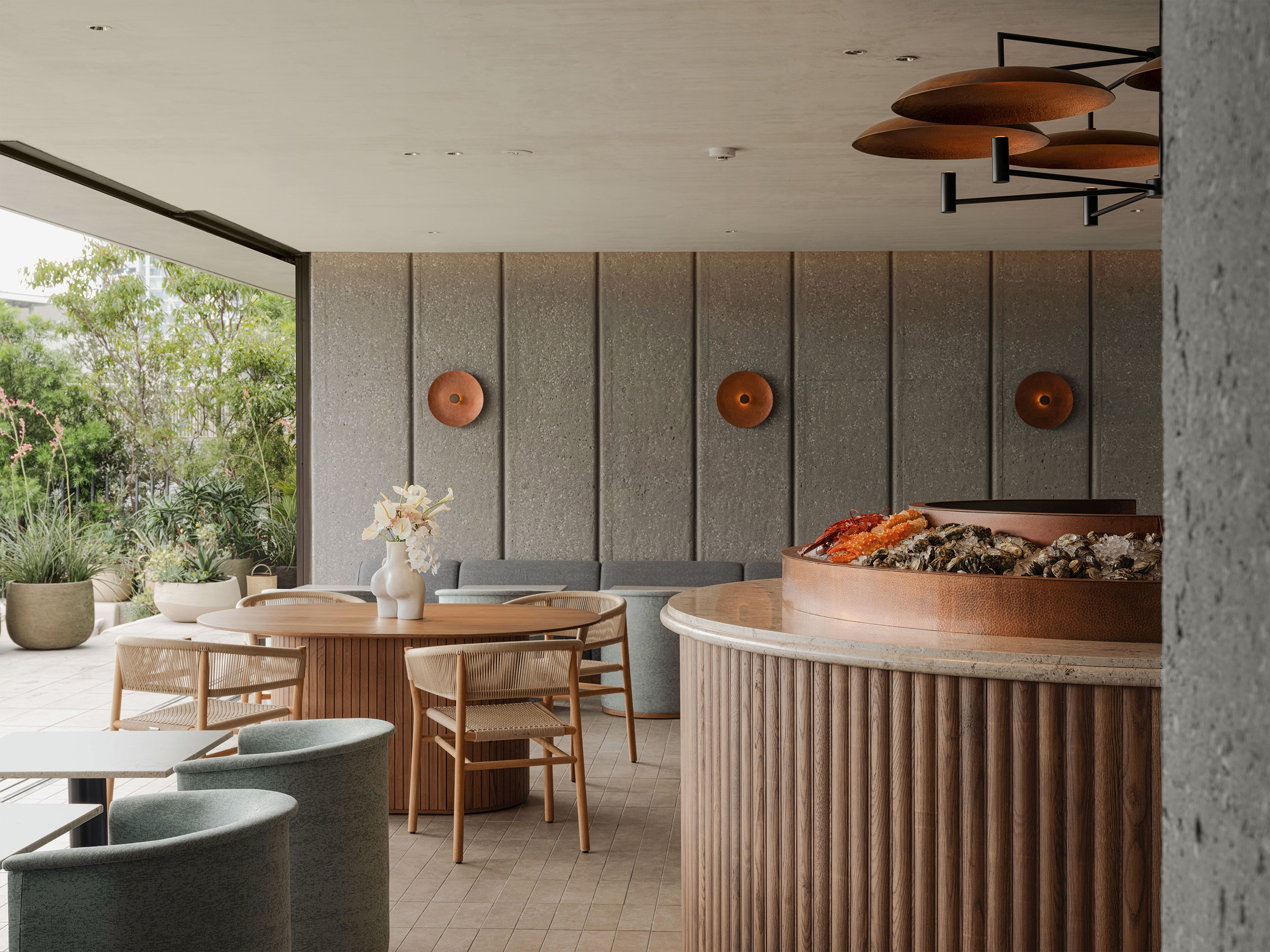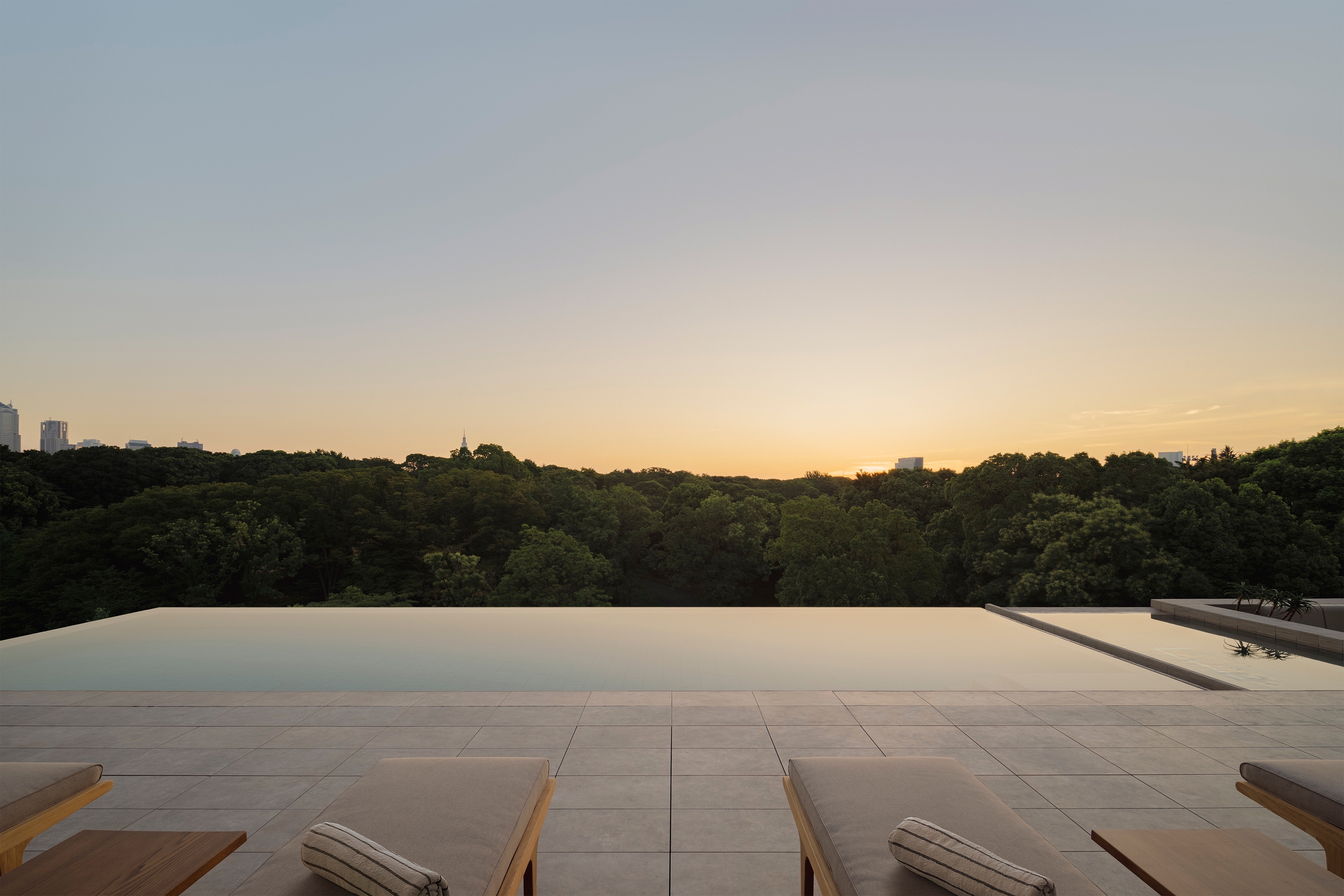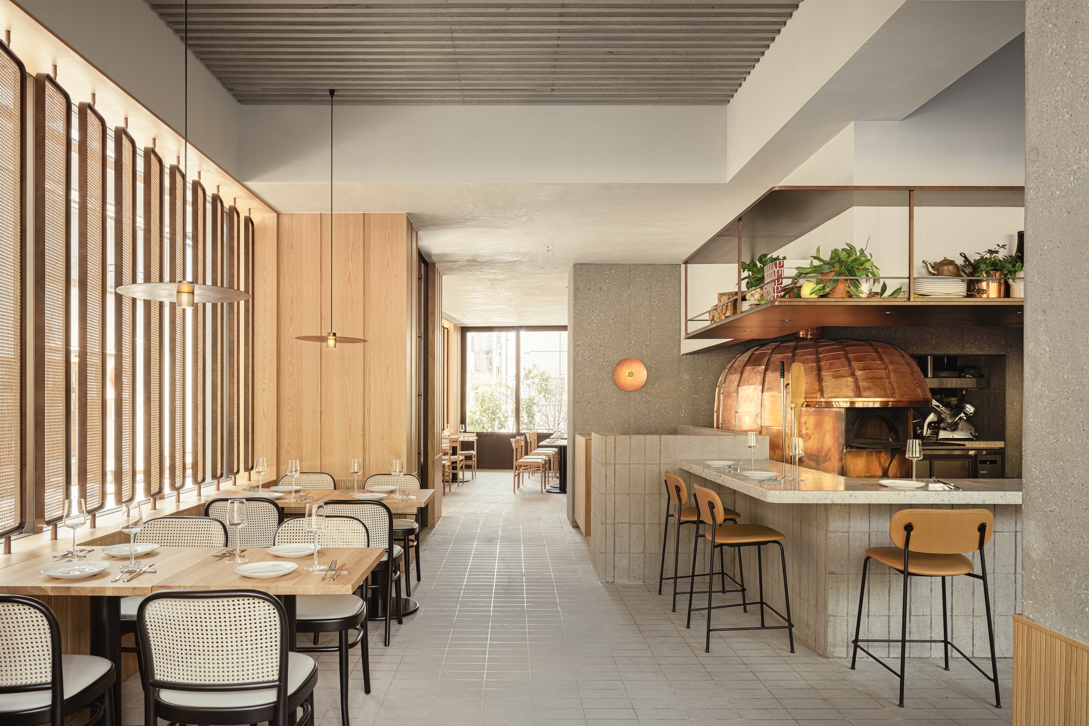 Design and colour inspiration for the project was found in the contrasting, yet balanced, aspects of Tokyo. The result presents a synthesis of Yoyogi Park (one of the city’s largest green spaces) its surrounding city blocks, and nearby Shibuya Crossing (the world’s busiest intersection); modern and traditional lifestyles; the interplay of raw and refined; and the Japanese and European craft traditions of the team. The design of the building plays upon this balance and contrast with a simple, almost brutalist structure, featuring exposed raw concrete (a result of