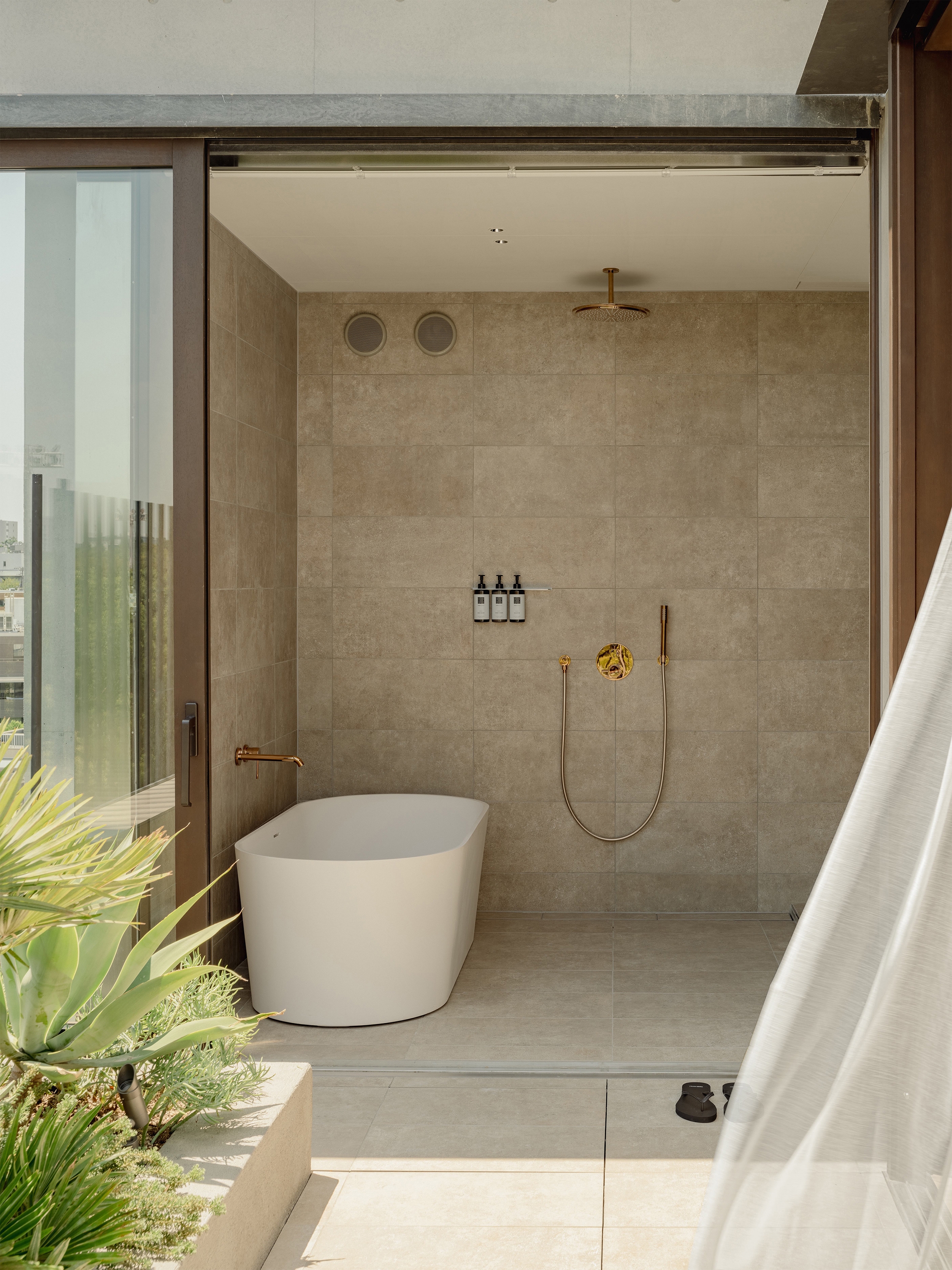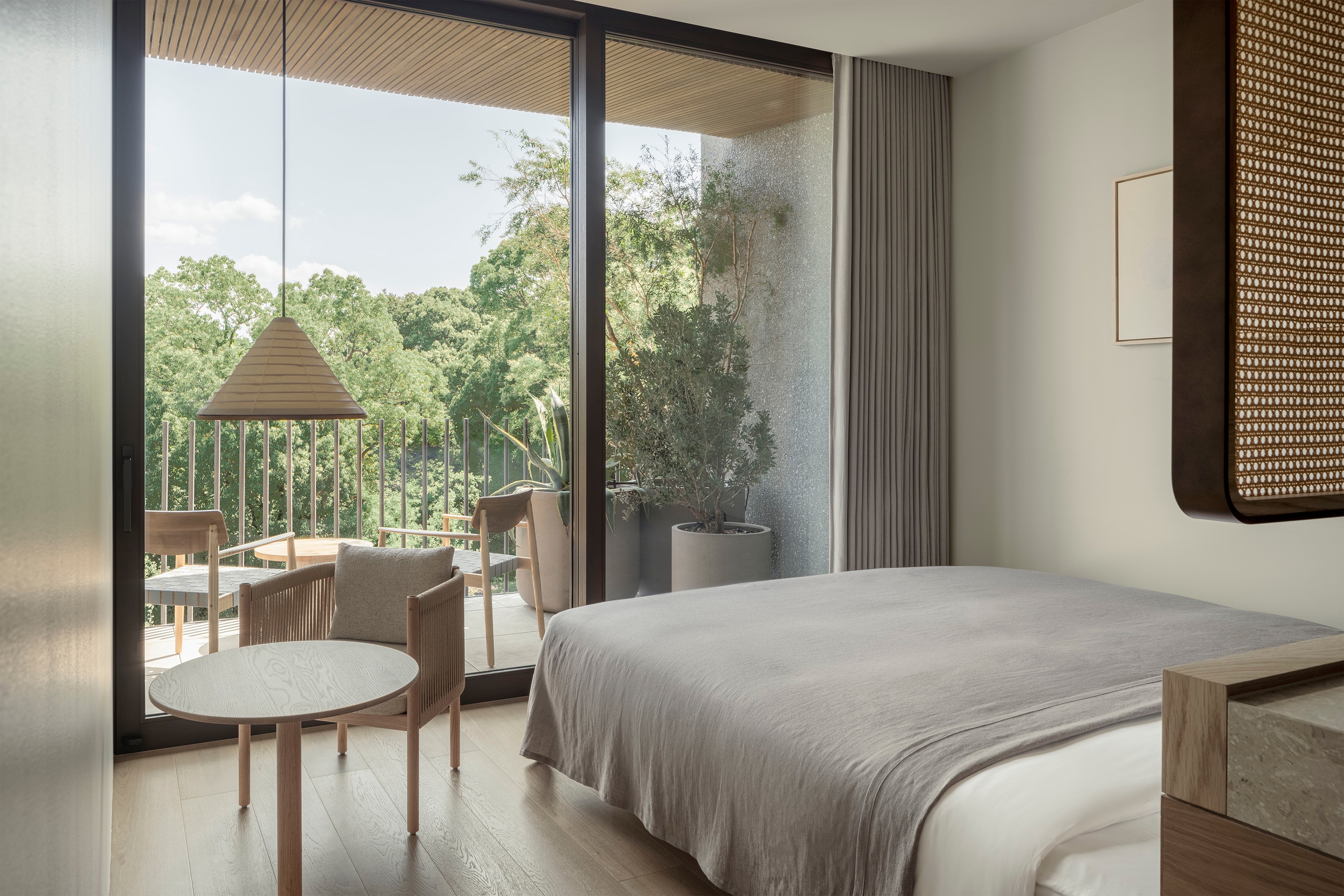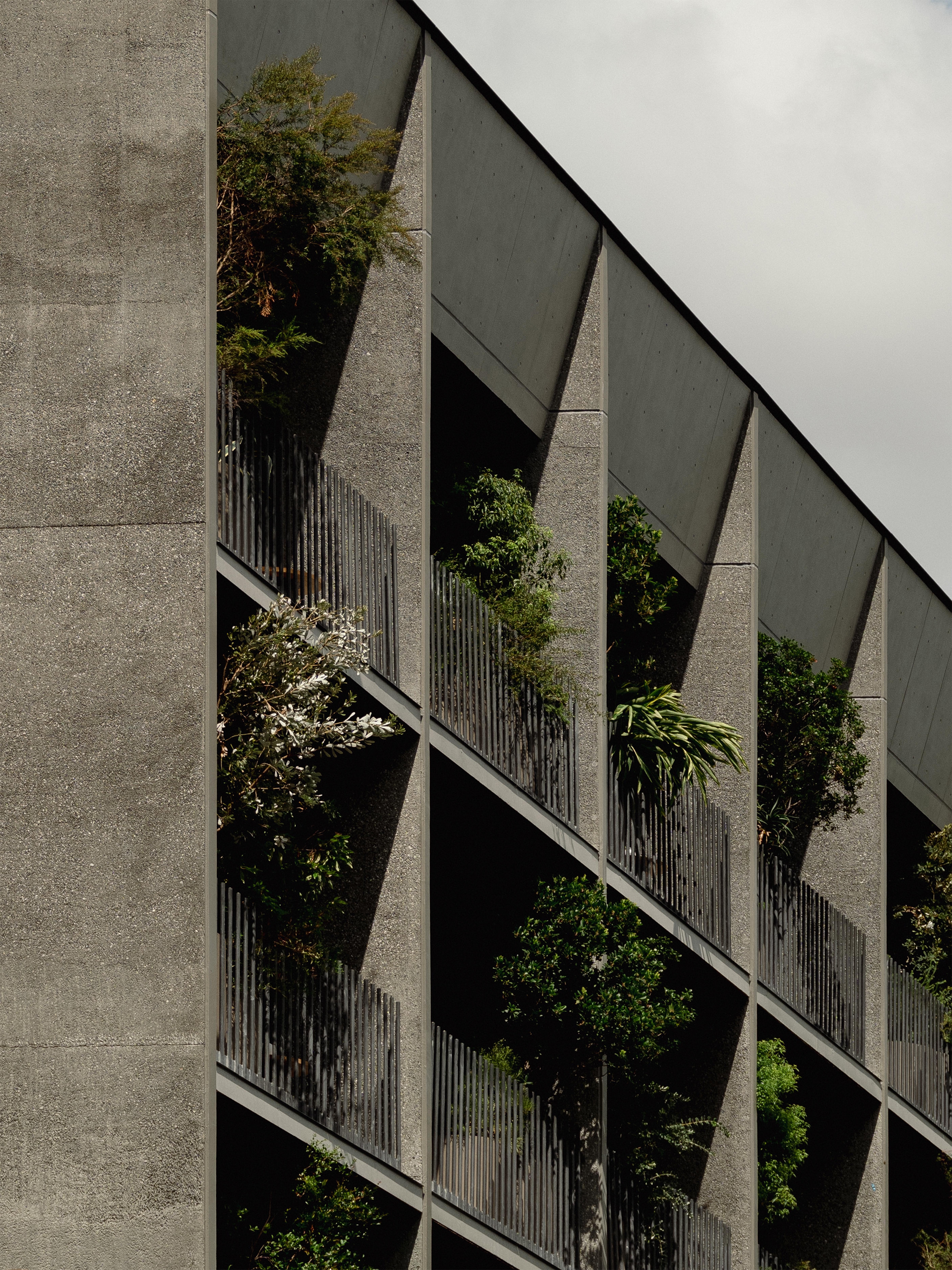 unique Japanese architectural construction techniques), juxtaposed with elegant wooden louvres across the balconies, and delicate, softening greenery.