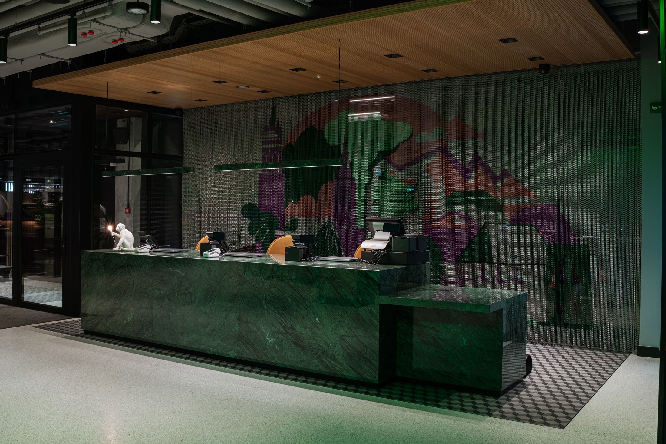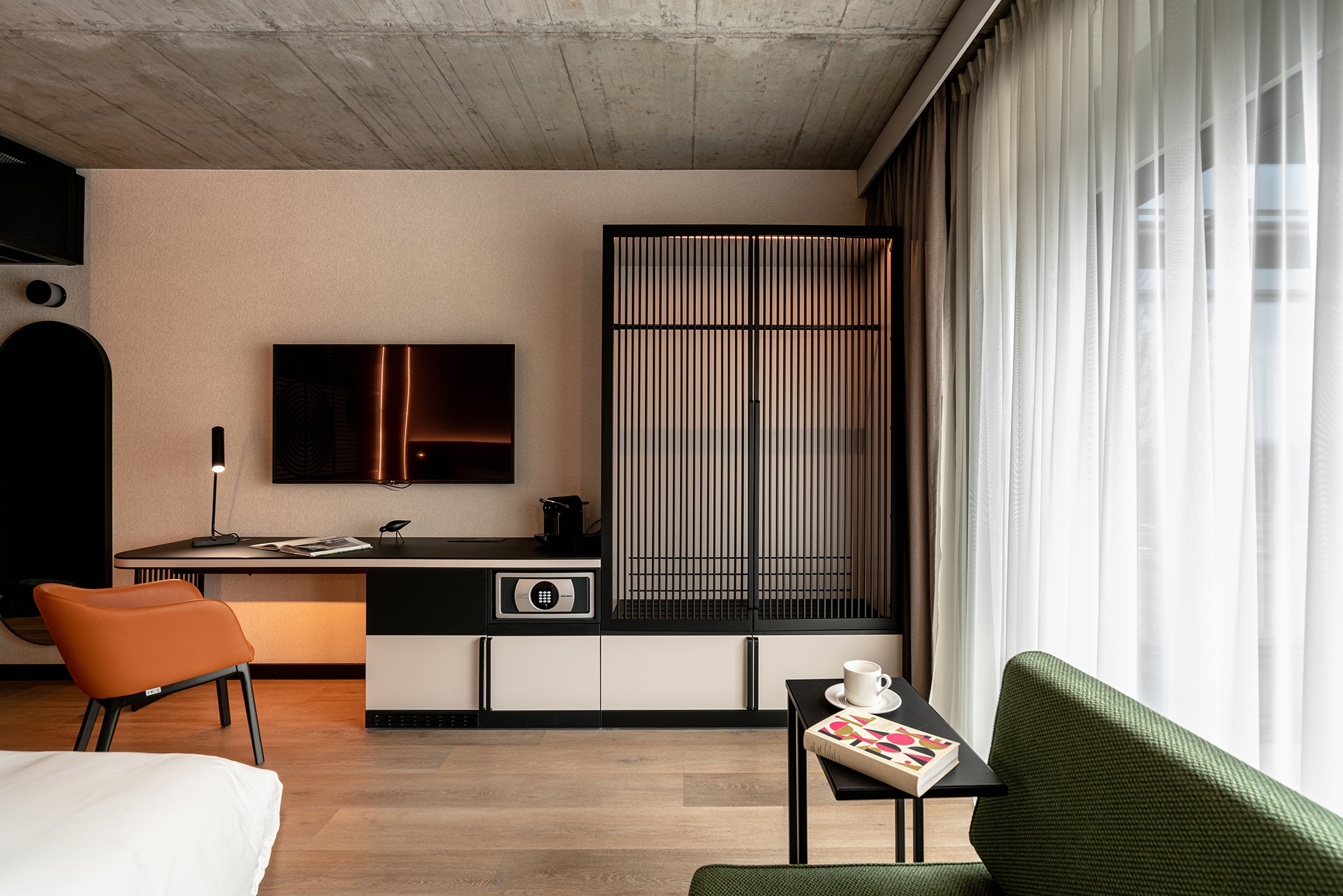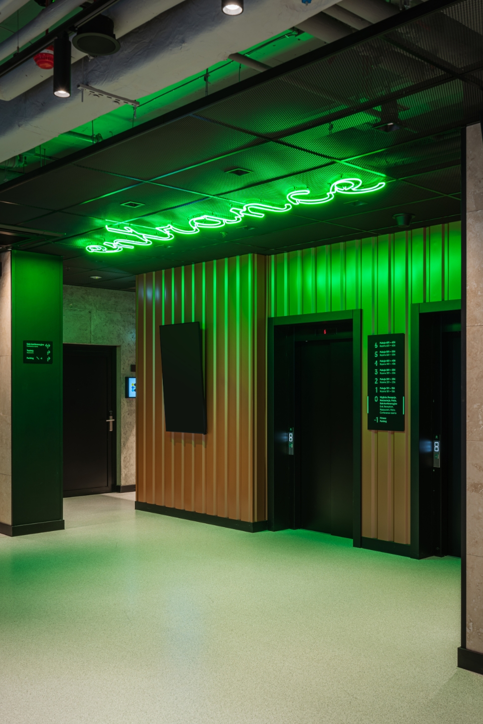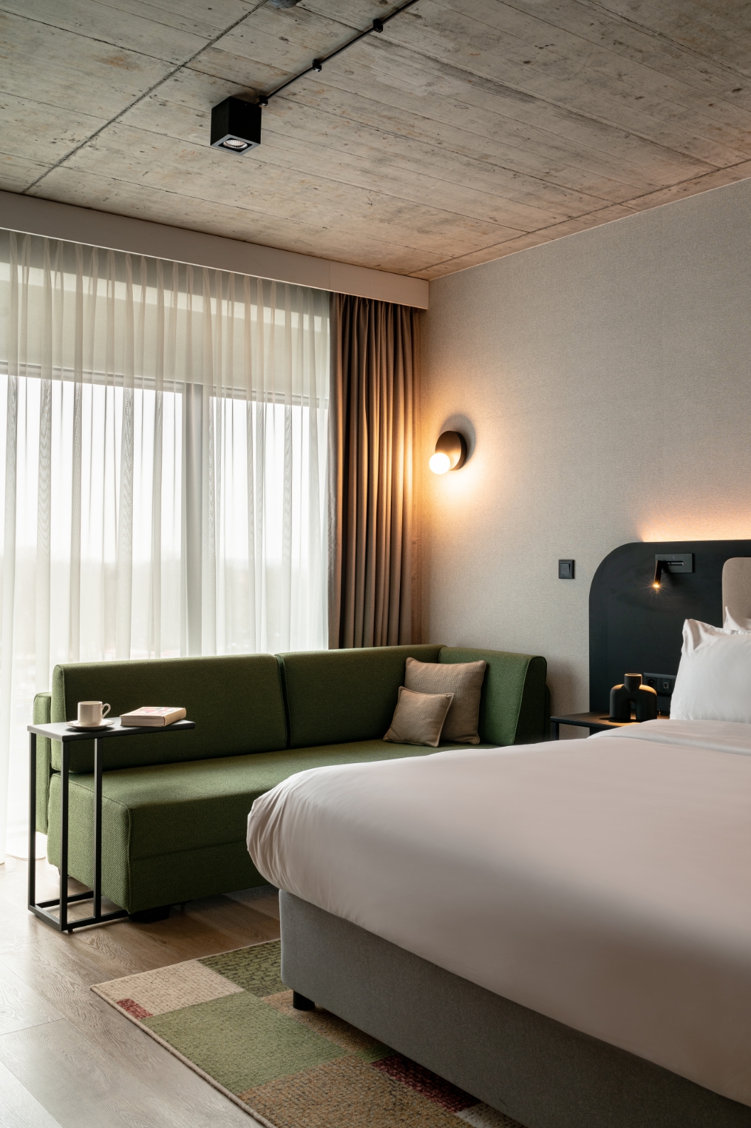 The interior design of Hyatt Place Kraków is built on many expressive contrasts. On the one hand, we have the urban, industrial rawness of architectural concrete, resin, corten, metal mesh, and pressed sheet metal. On the other - elegant walnut wood, sandstone, travertine, and marble, soft fabrics. Energetic, varied, colorful common areas differ strongly from subdued and relaxing rooms. The rooms, although much "calmed down" in comparison to the bar, restaurant, or lobby, continue the thread of the discussion between the big city and coziness, they are consistent with the entire interior of the hotel We have comfortable beds, sofas, upholstered headboards, carpets, and above all a bare concrete ceiling and exposed electrical wiring. In hotel rooms and bathrooms, we can find a large amount of one of the leading colors in the design of the entire hotel - green taken from the Hyatt Place brand book. In this color, there are e.g. upholstery and ceramic tiles in bathrooms. This is not an accidental choice because green has long been known for its relaxing effect on people.