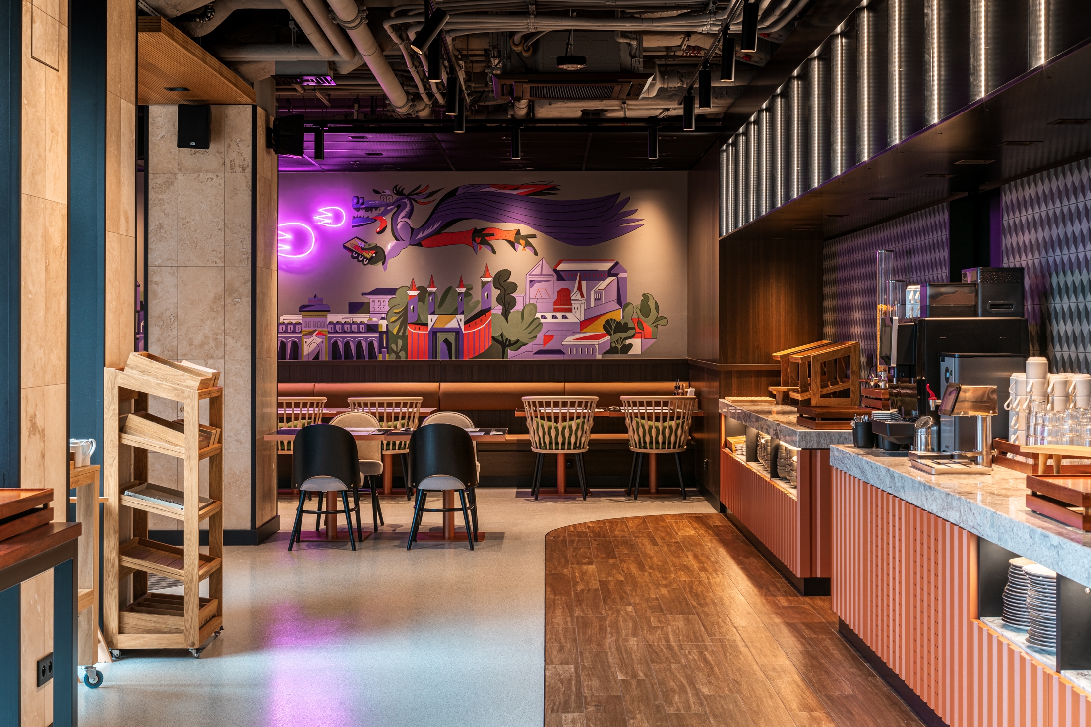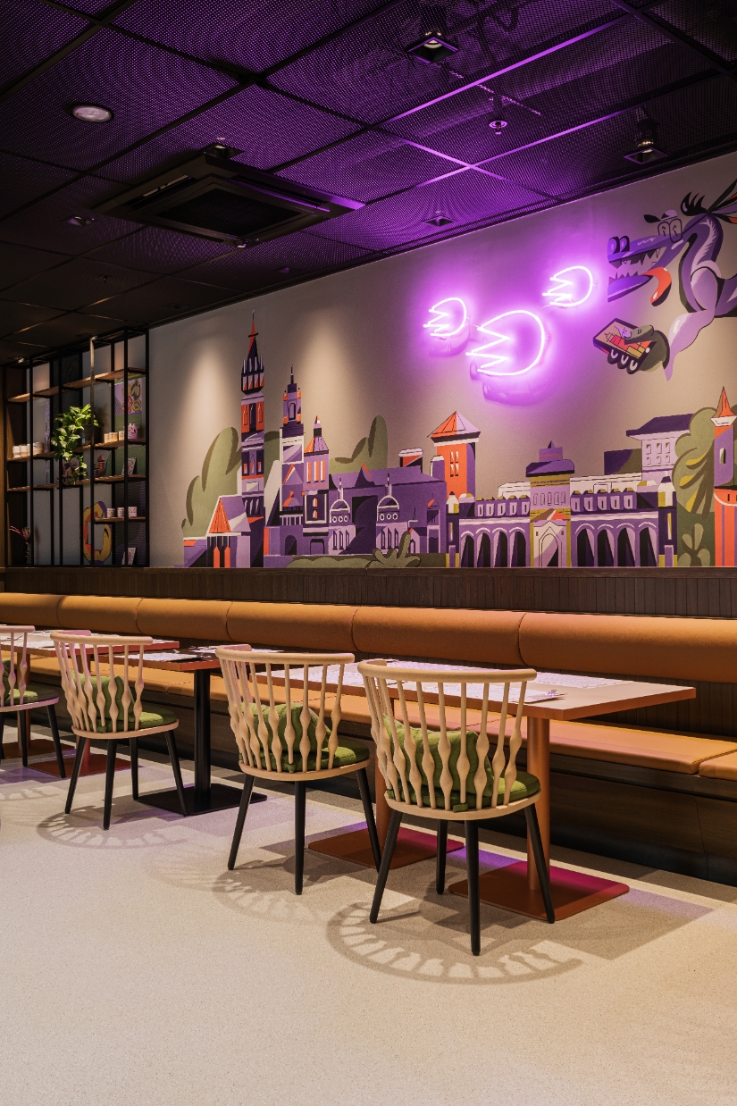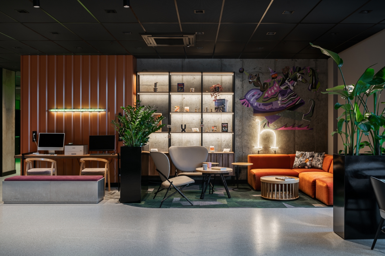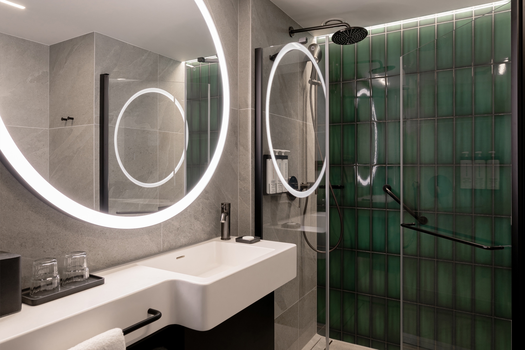 The interior design of Hyatt Place Kraków is built on many expressive contrasts. On the one hand, we have the urban, industrial rawness of architectural concrete, resin, corten, metal mesh, and pressed sheet metal. On the other - elegant walnut wood, sandstone, travertine, and marble, soft fabrics. Energetic, varied, colorful common areas differ strongly from subdued and relaxing rooms. The rooms, although much "calmed down" in comparison to the bar, restaurant, or lobby, continue the thread of the discussion between the big city and coziness, they are consistent with the entire interior of the hotel We have comfortable beds, sofas, upholstered headboards, carpets, and above all a bare concrete ceiling and exposed electrical wiring. In hotel rooms and bathrooms, we can find a large amount of one of the leading colors in the design of the entire hotel - green taken from the Hyatt Place brand book. In this color, there are e.g. upholstery and ceramic tiles in bathrooms. This is not an accidental choice because green has long been known for its relaxing effect on people.