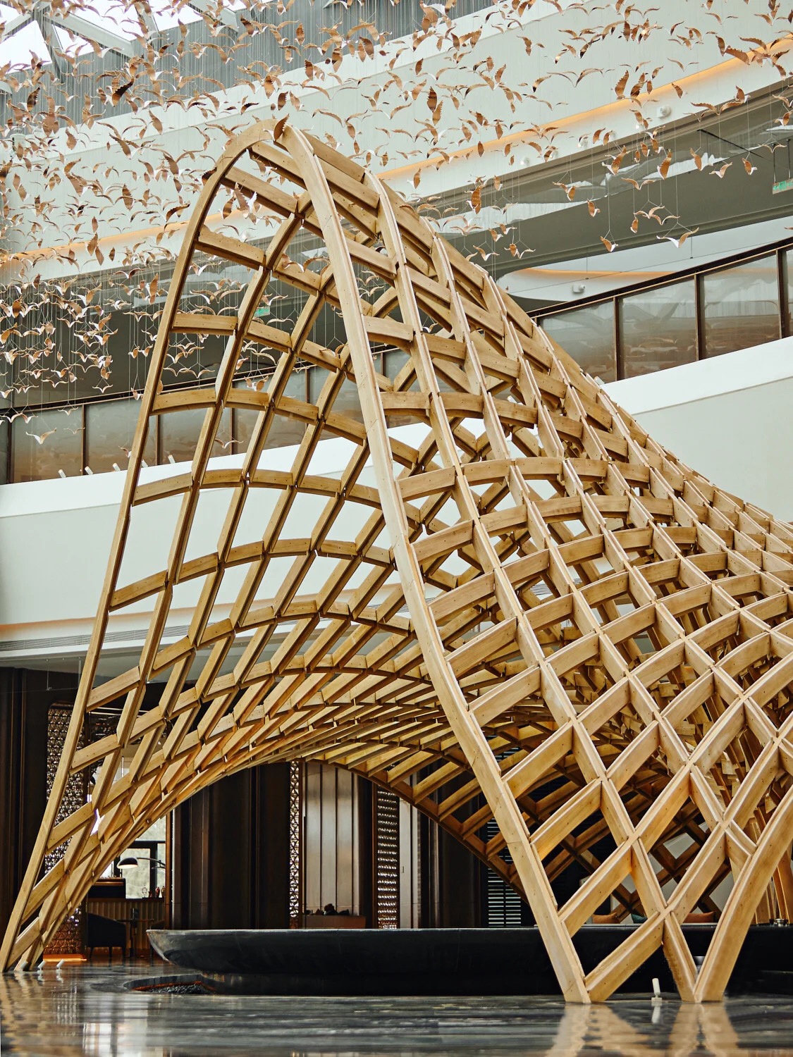 Entering the lobby, the design conveys the ancient charm with exquisite and detailed imagery, the materials are based on natural stone and wood decoration, the natural lighting at the top combined with water feature plants creates the atmosphere of the indoor courtyard, the jade-like water feature combines with lush national locust trees and the art pavilion evolved from the Taihang Mountains.