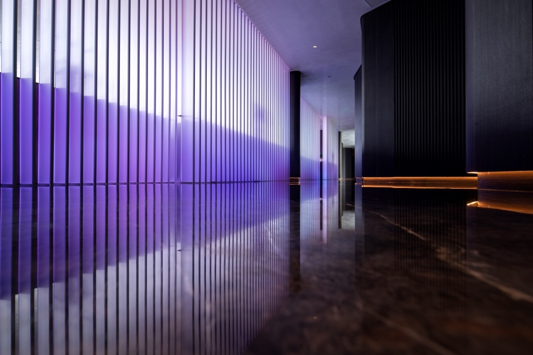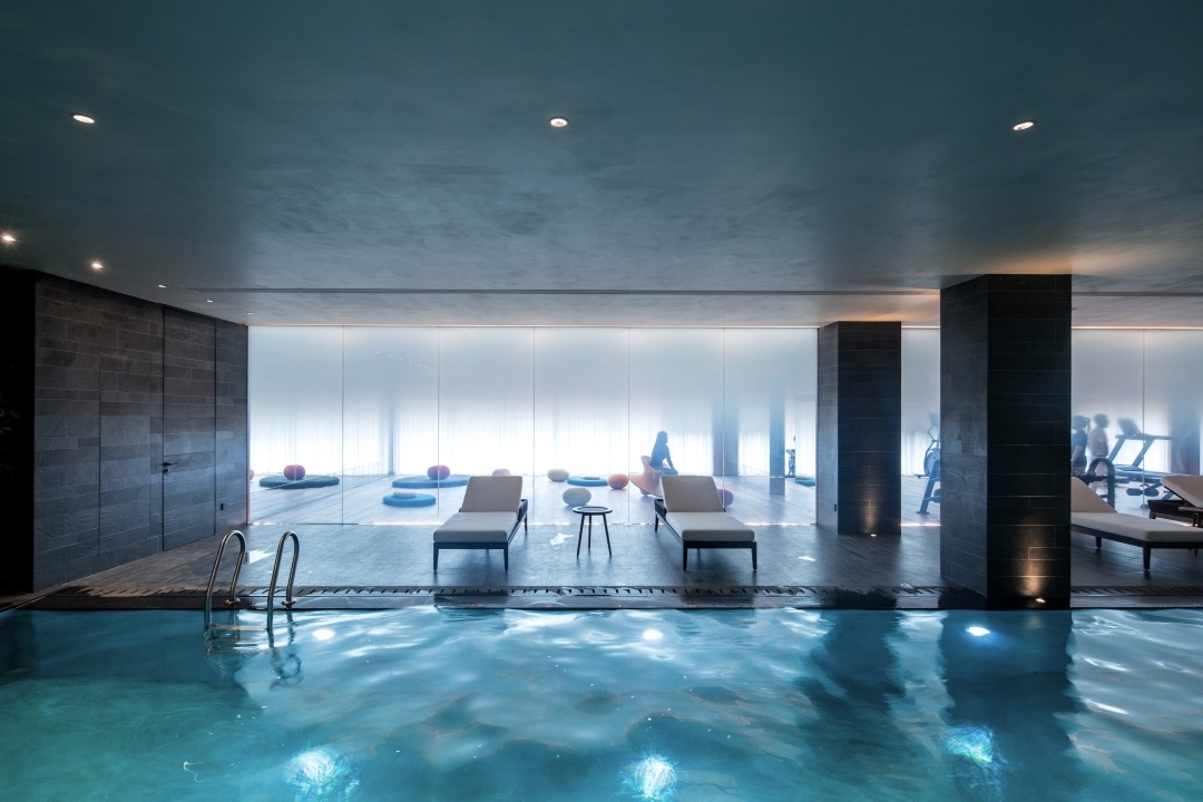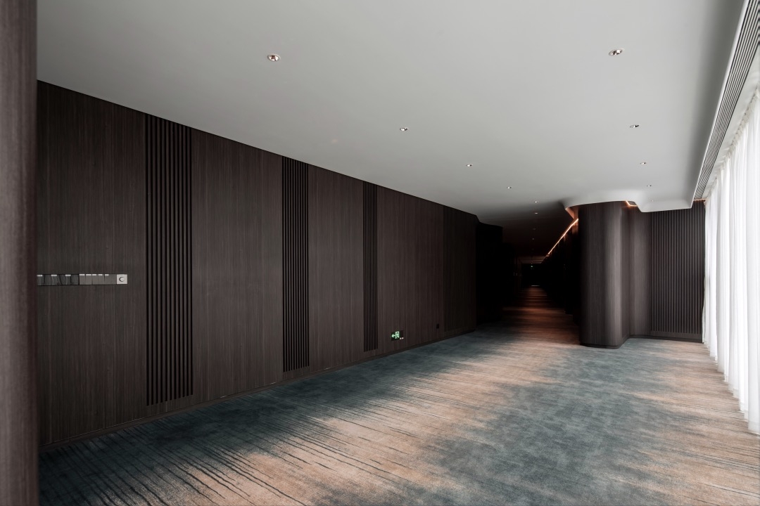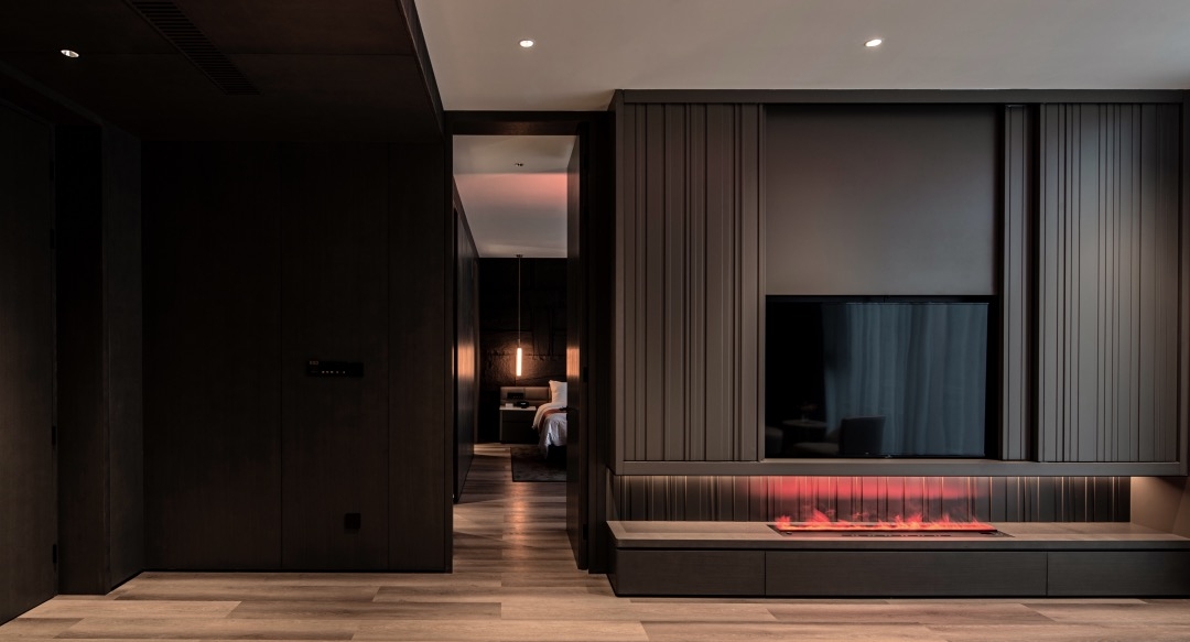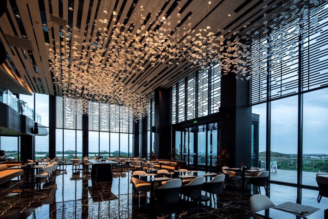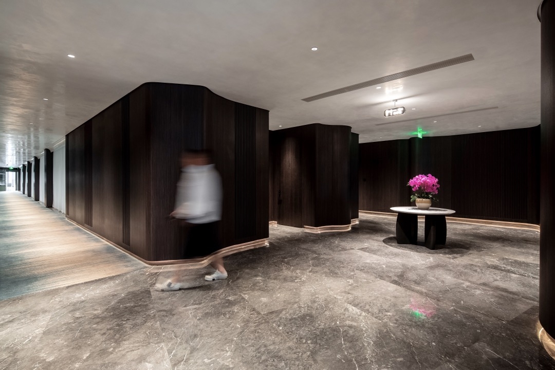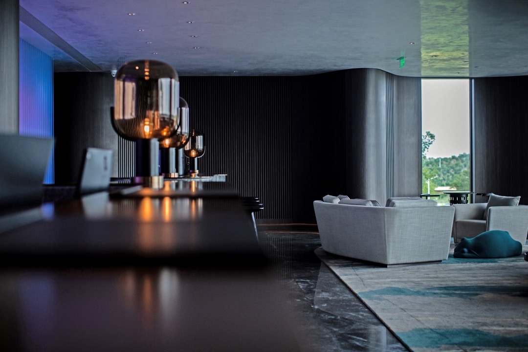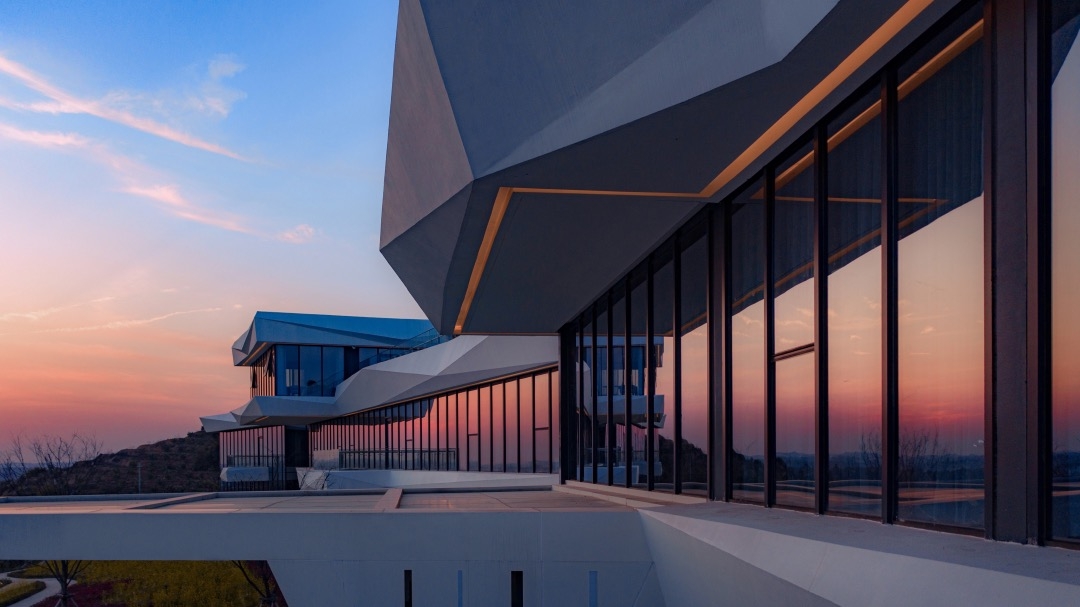 The light and airy building, with glass and irregularly cut white GRC, echoes the mountainous terrain. The interior combines Eastern aesthetics with a homely experience, using curved elements to break the rigid one-dimensional structure. A touch of color dances in the deep space, providing guests with a unique vacation experience.
