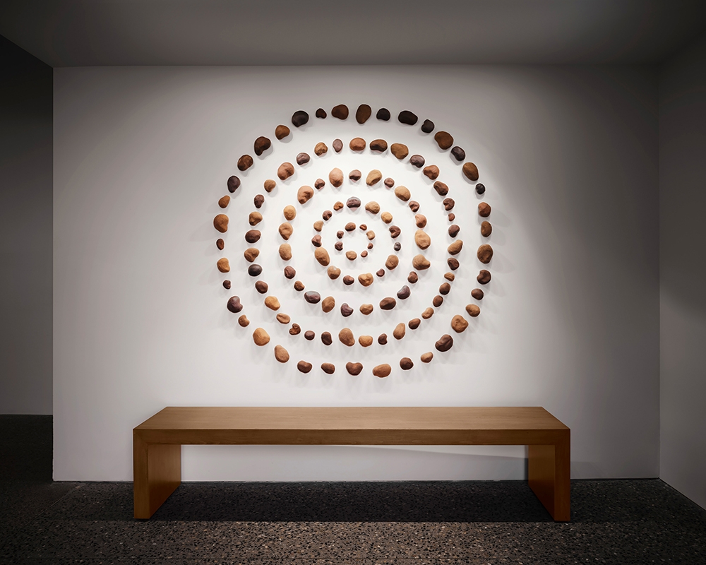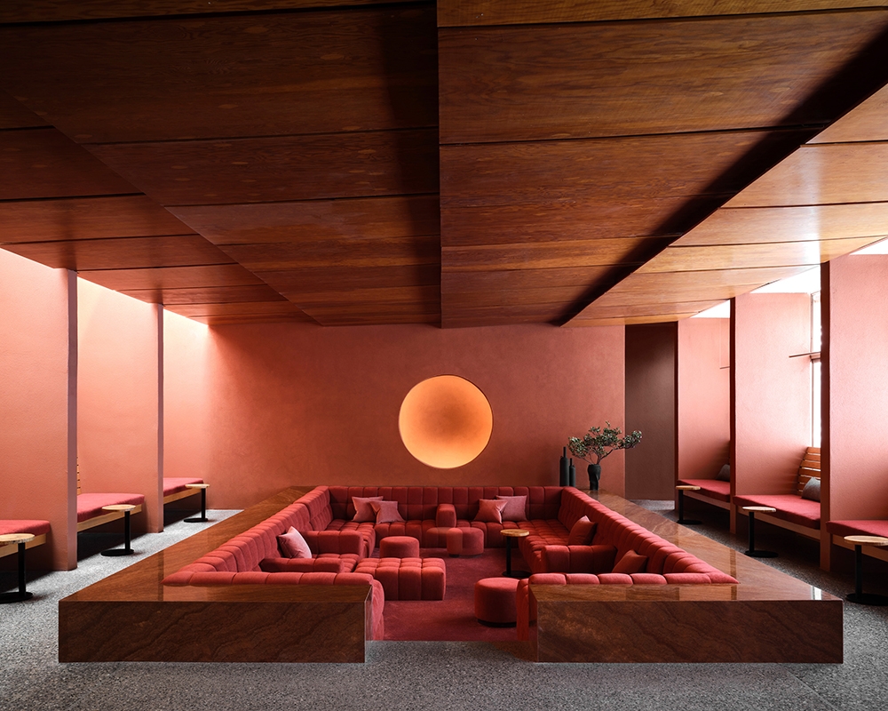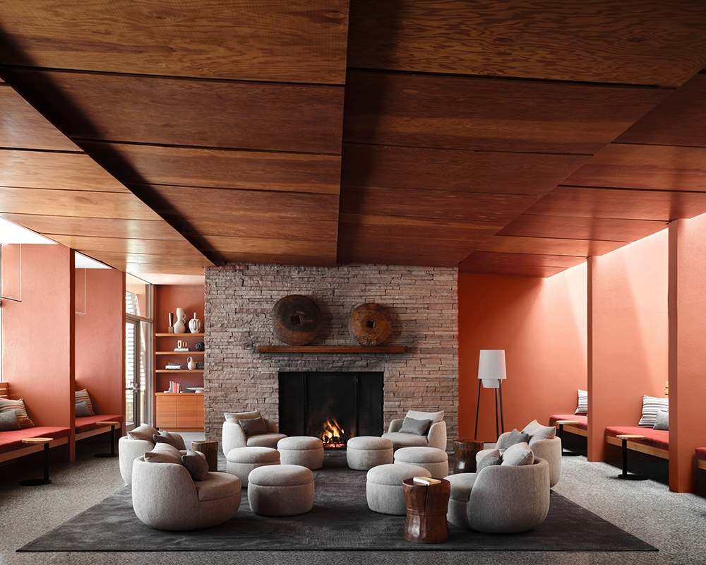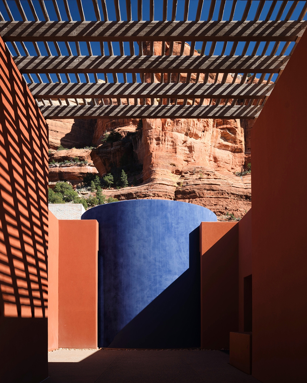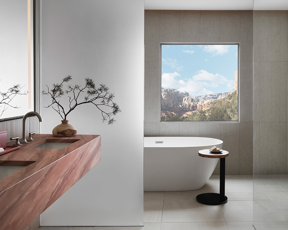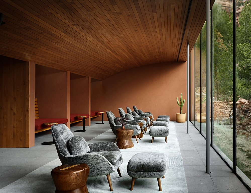 The design frames the natural surroundings and offers a counterpoint with simple forms and a vivid, earthy palette. Decoration is artfully restrained. Organic materials and textures dialogue with the canyon’s red rocks and soft green hues.