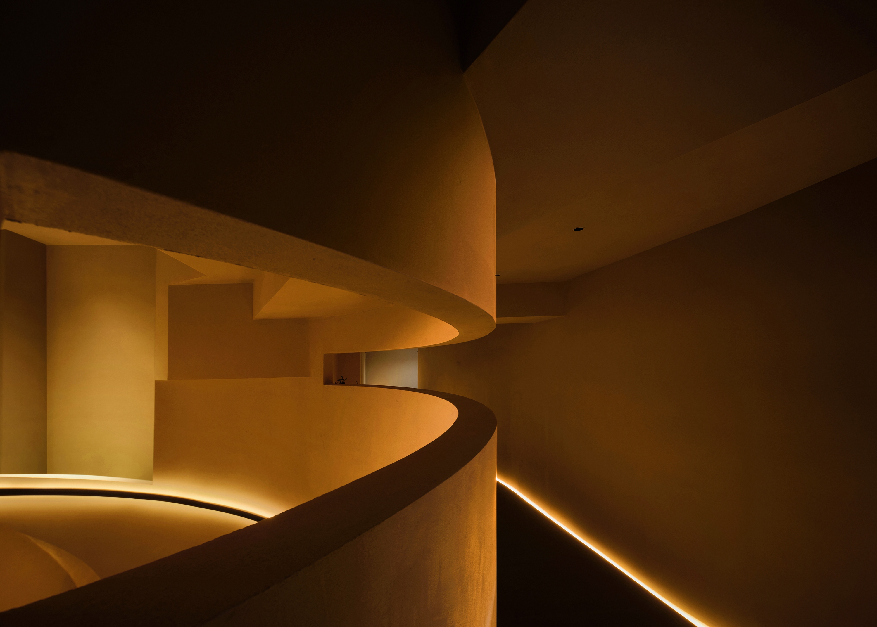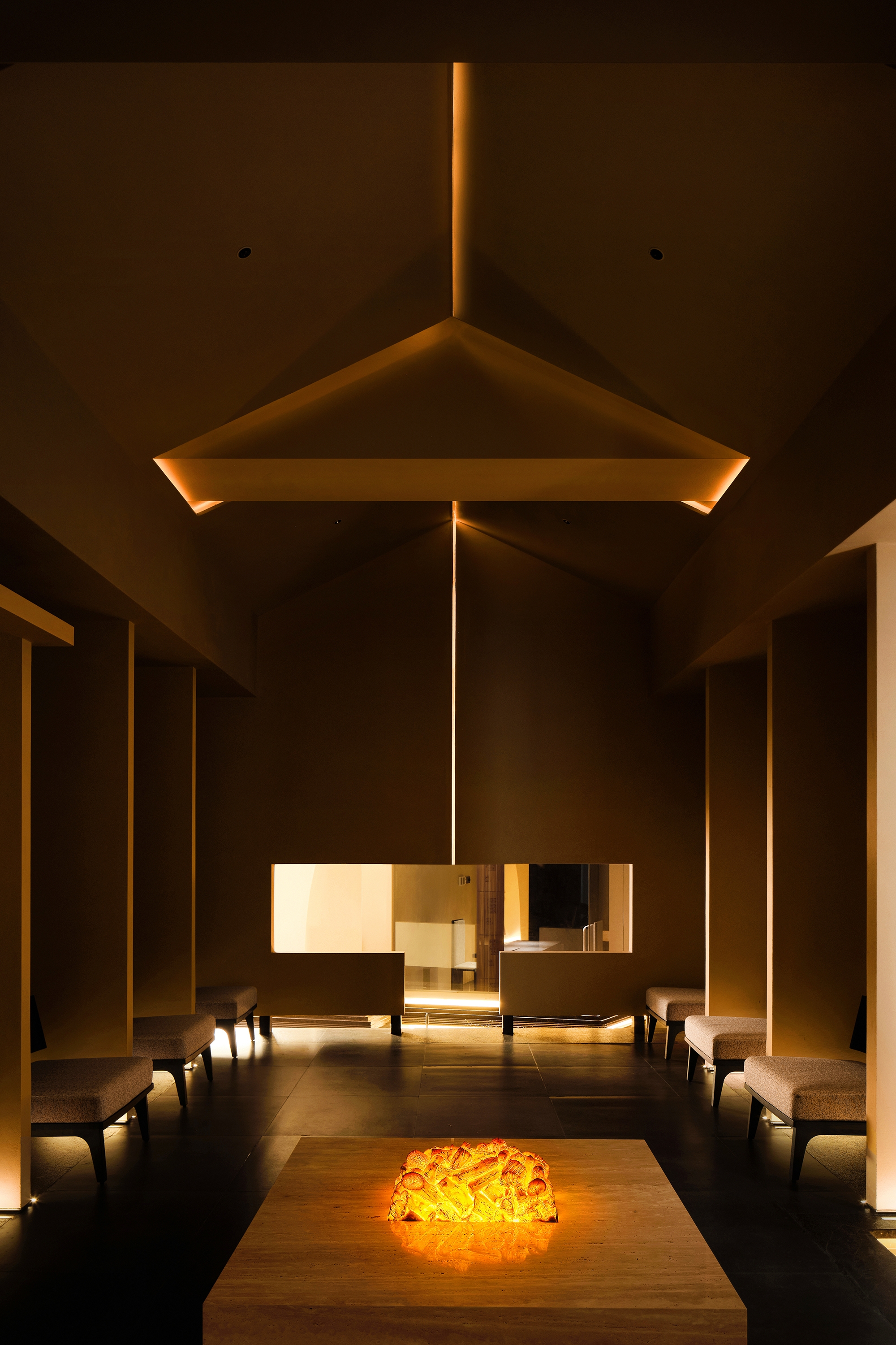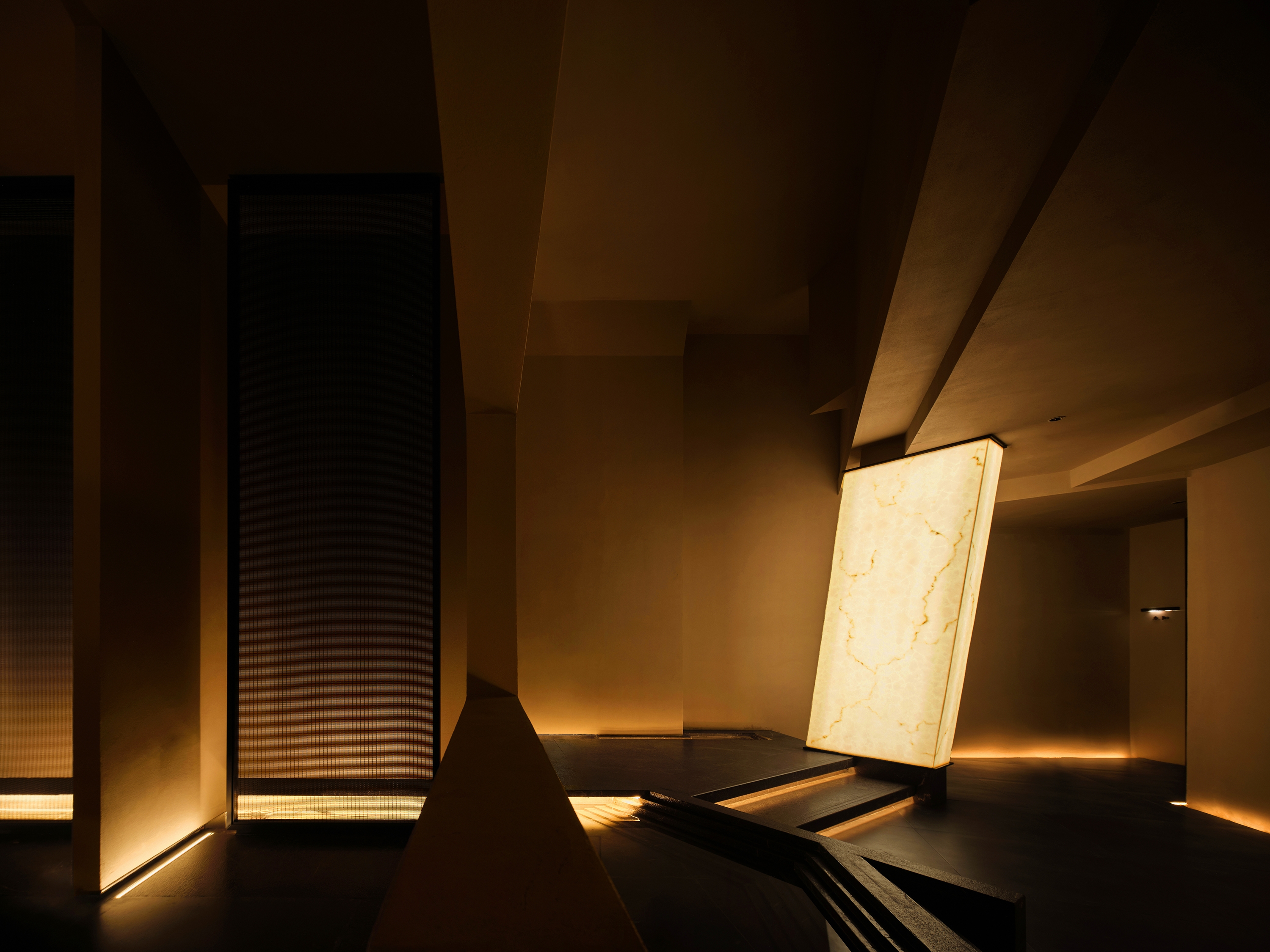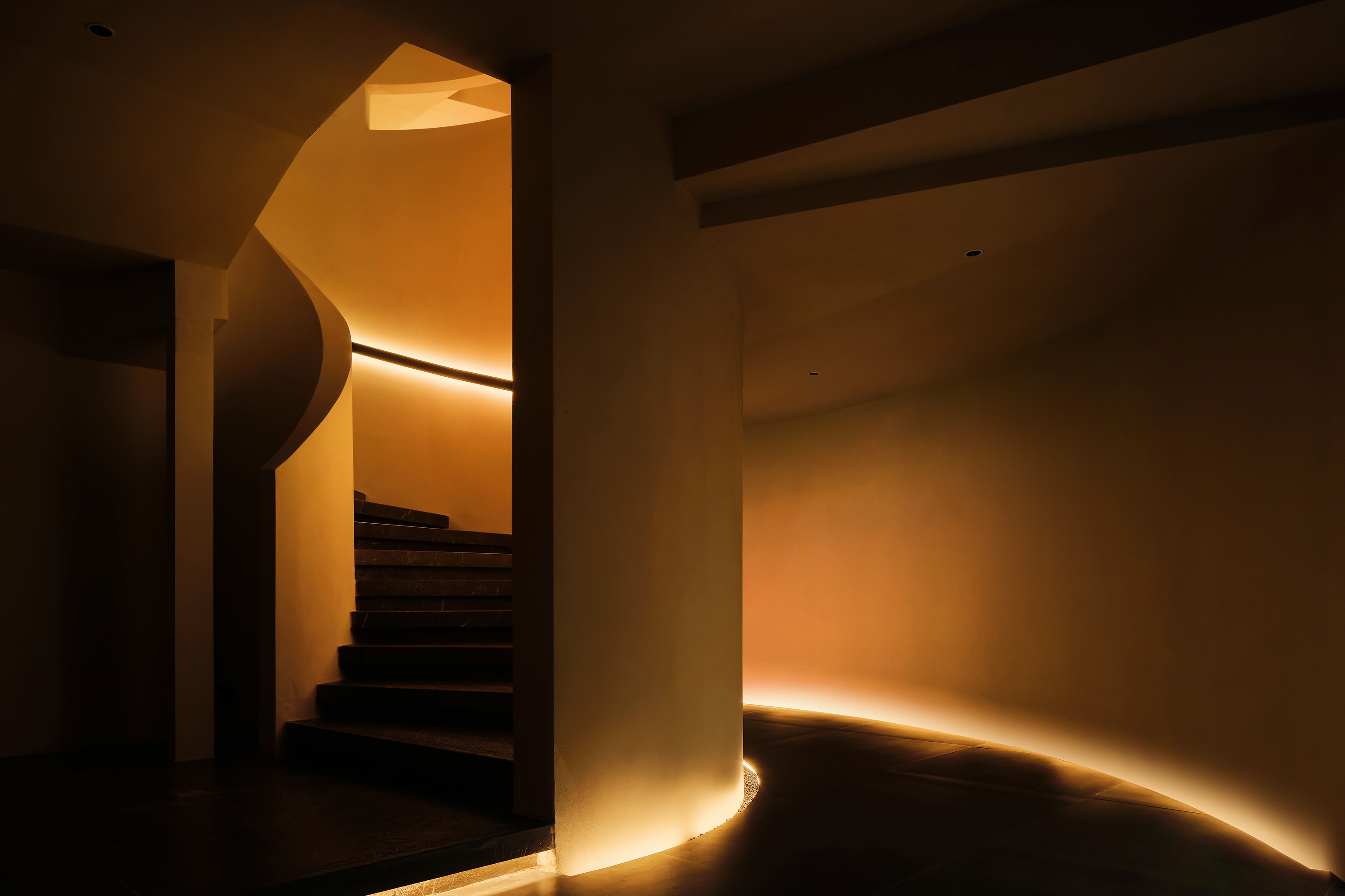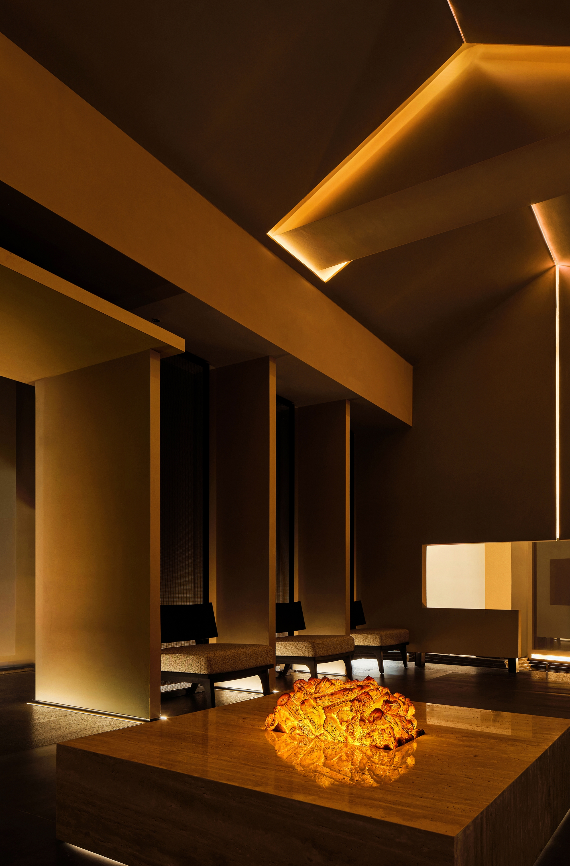 How light and shadow interact with the building and how blocks and structure work together is the key design logic. The area gives an air of elegance, purity and implicit shock. From the pure fair-faced concrete, wooden materials, orderly seating, to the flamed wood installation, each element is a key point. Besides, arched doors and curve staircase collide with the building’s original straight lines, enriching the layers with a slow transition and vitality.