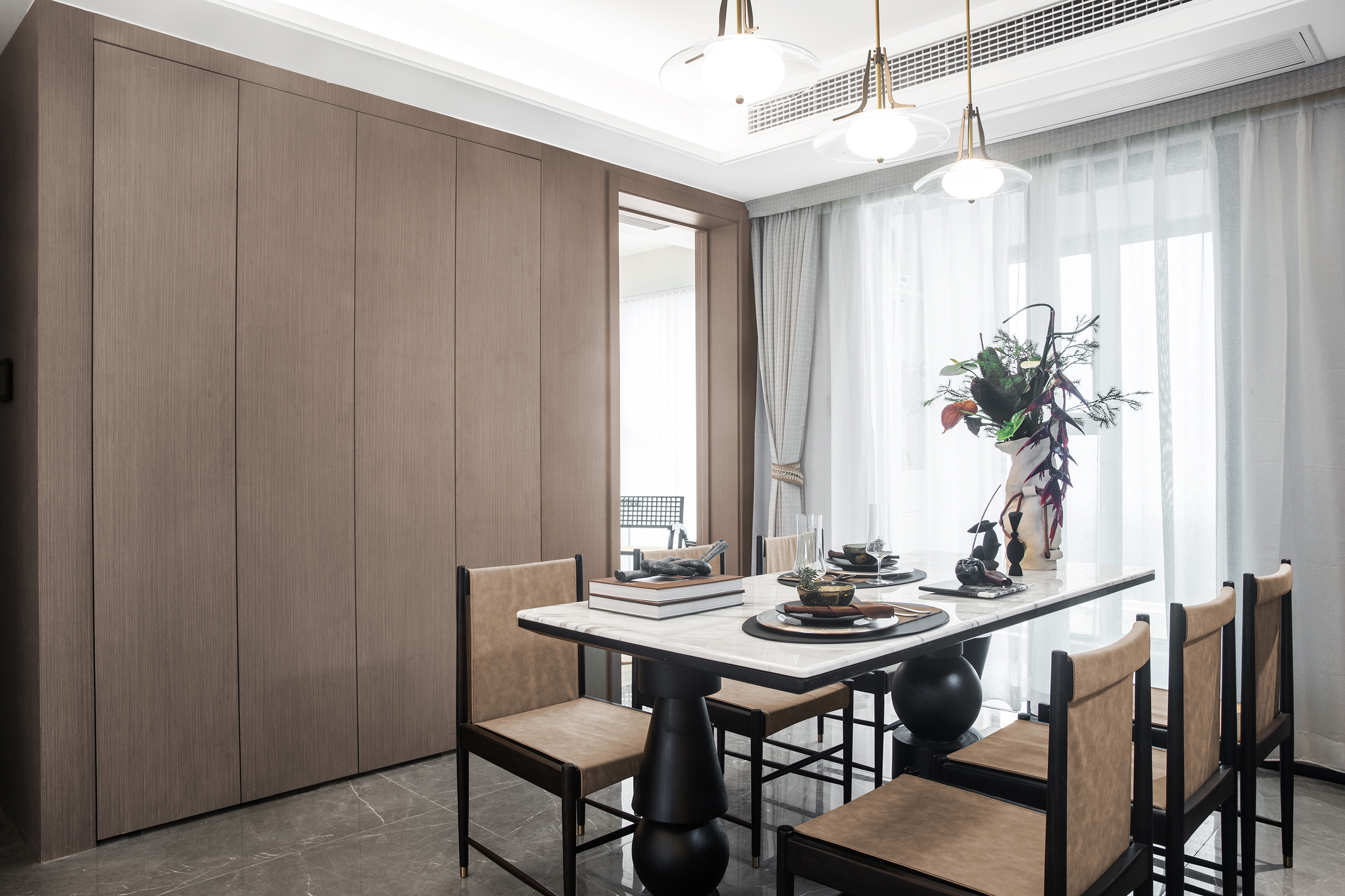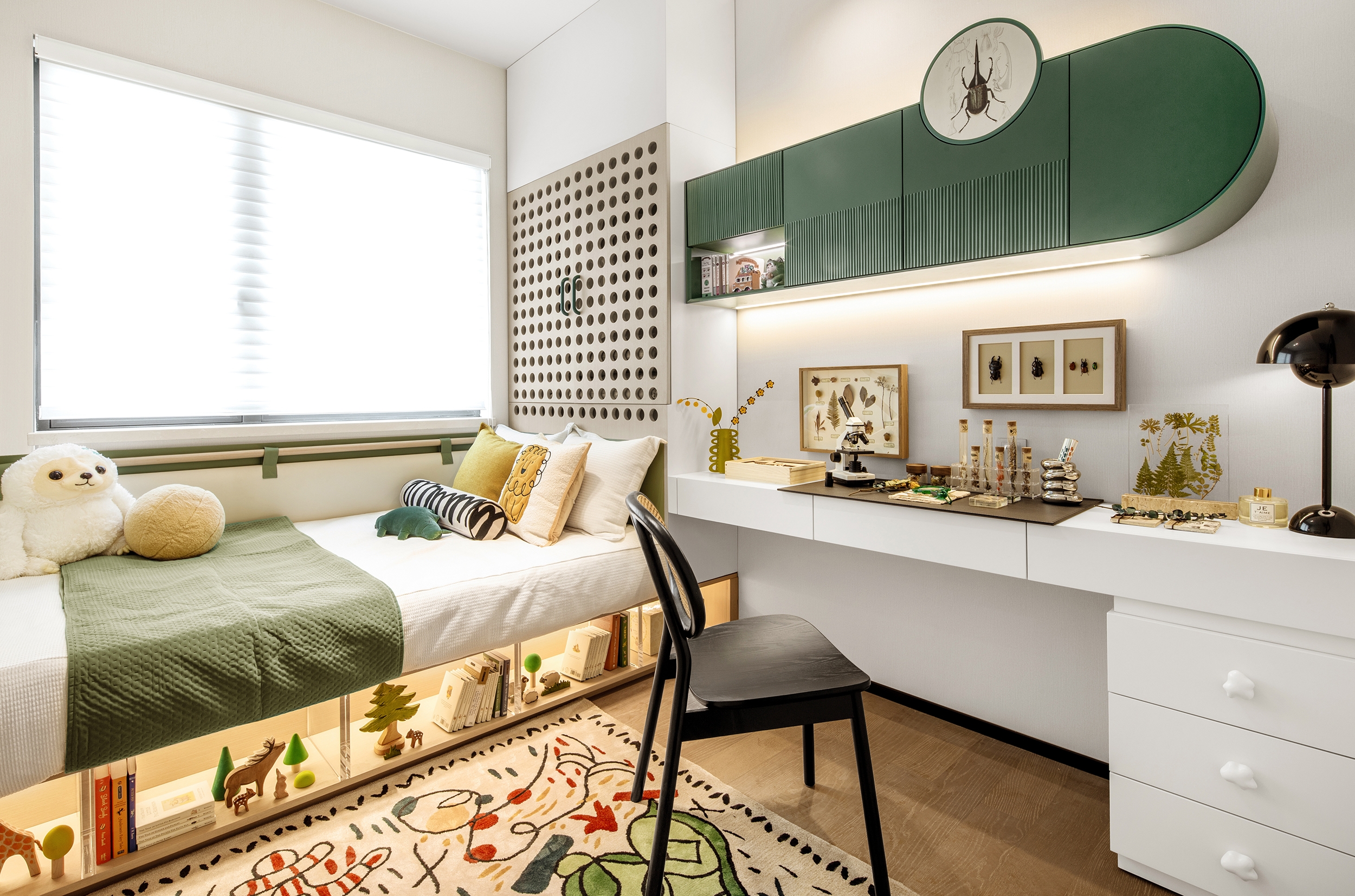 The dining area with a clear pattern that can be opened and closed help residents’ life more organized. The study is like a natural lab, filled with specimens of plants and minerals on the walls, table piled with books and research notes.