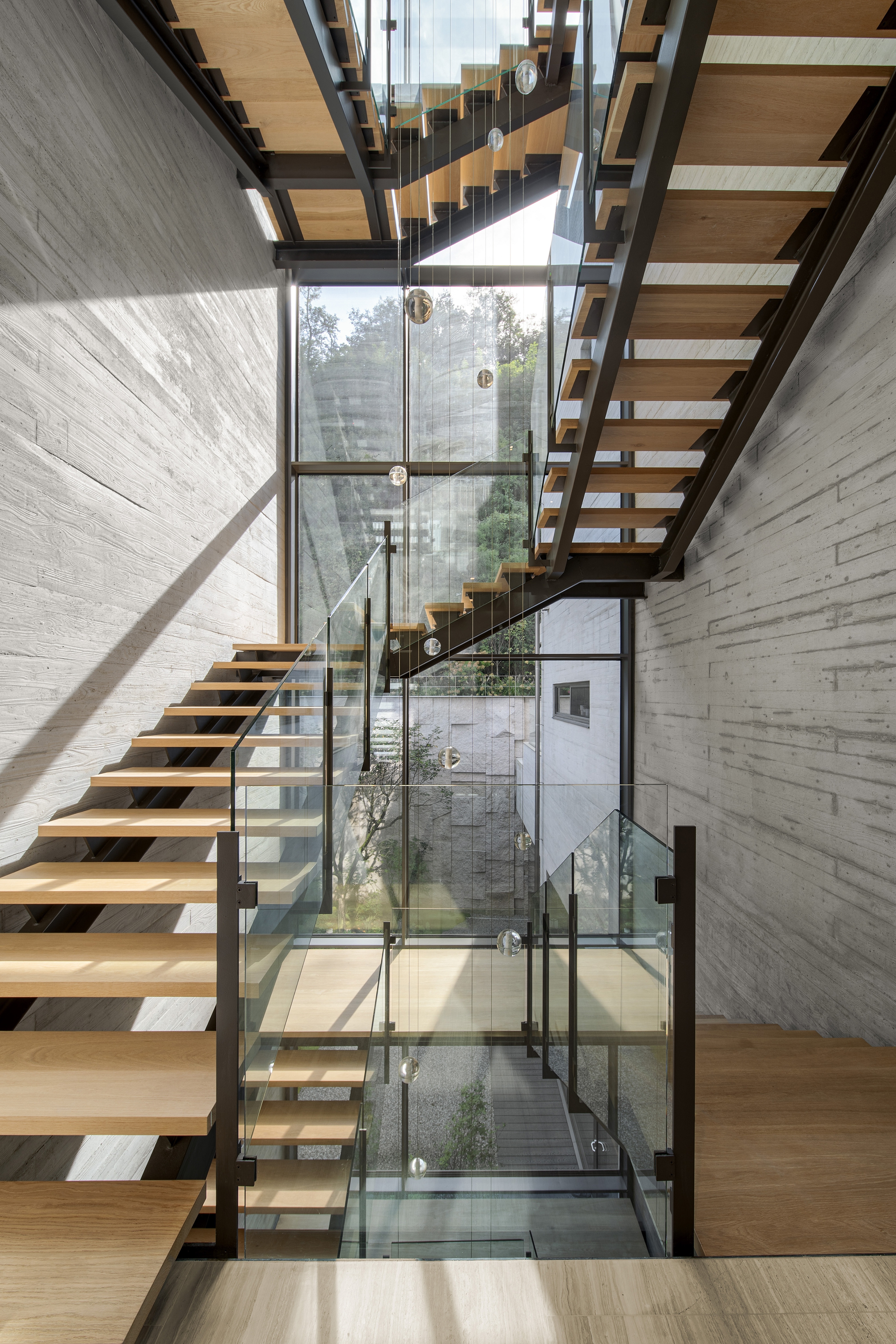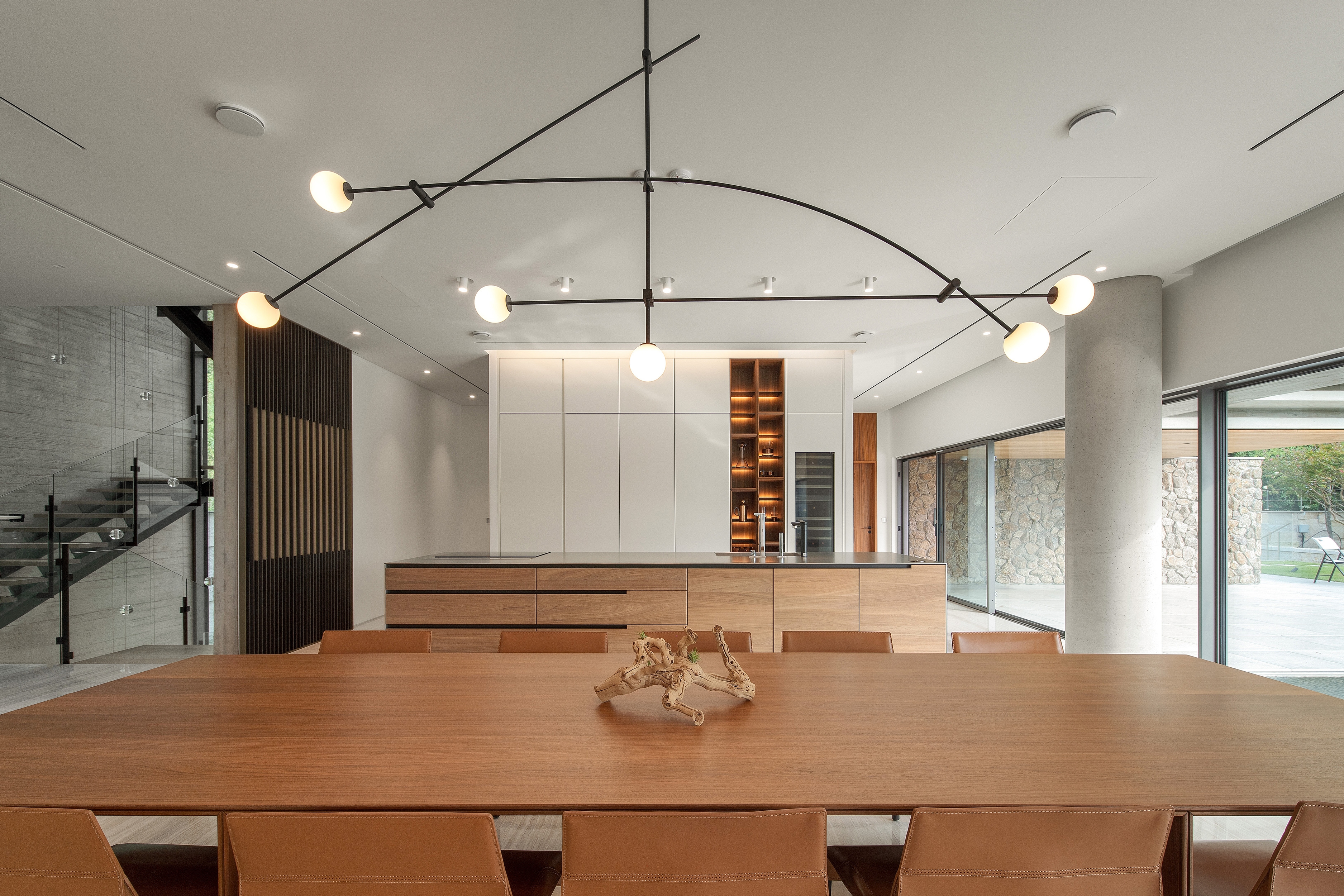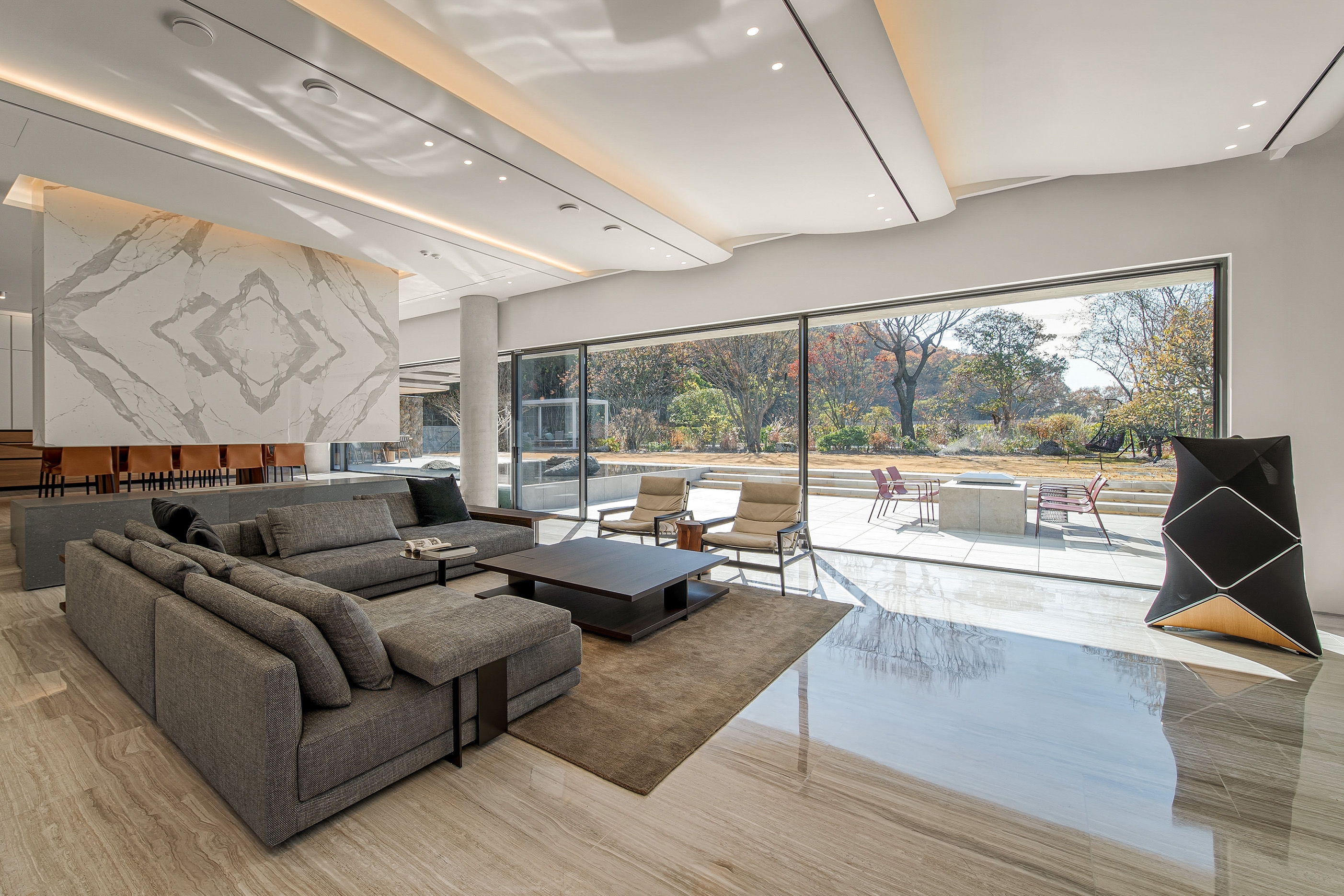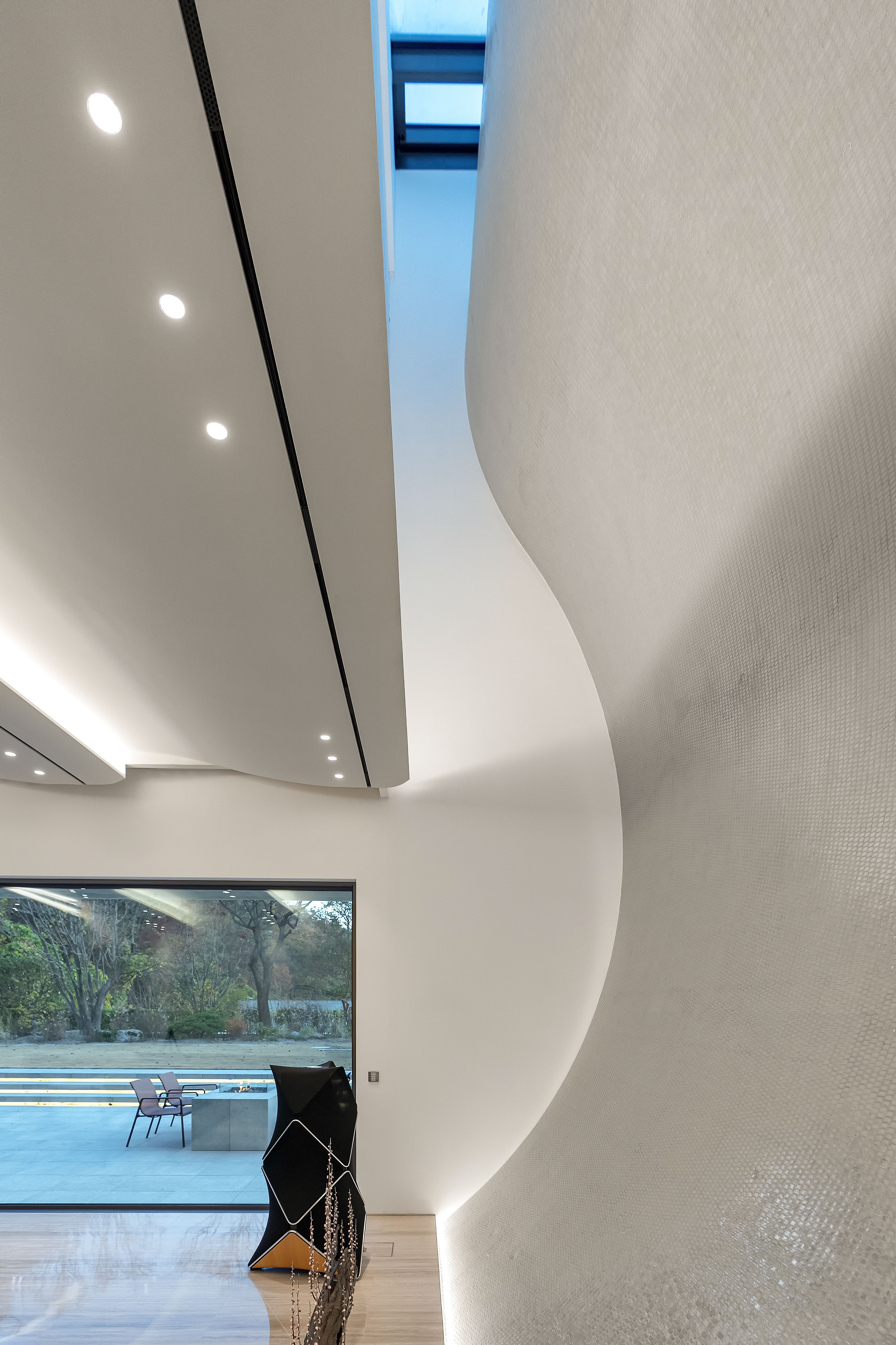 ‘Wave House’ is a single-detached dwelling embracing the natural landscape drawn from the surrounding environment. The project focused on the elements that comprise the everyday experience of the users. In particular, the living area and bar were designed as fused spaces to facilitate a solitary and communal space for entertainment, and the bathroom in a guest room on the basement floor is enhanced by the presence of skylights placed along the sun’s trajectory to capture its natural light. The curved facade of the architecture was incorporated into the interior to manifest its design motif of the ceiling unfolding toward the inside and creating a distinct sculptural feature of an ethereal wavy ceiling. The main objective of the project is to offer the living experience inherent to a single-detached dwelling. The house presents general yet unique, and visceral interaction with nature. The uninterrupted mutual fusion of the landscape inside the house is especially emphasized, and the outdoor layout involves unacquainted elements amidst urban complex housings such as the front yard and pond. The project concept focuses on the space in the landscape.