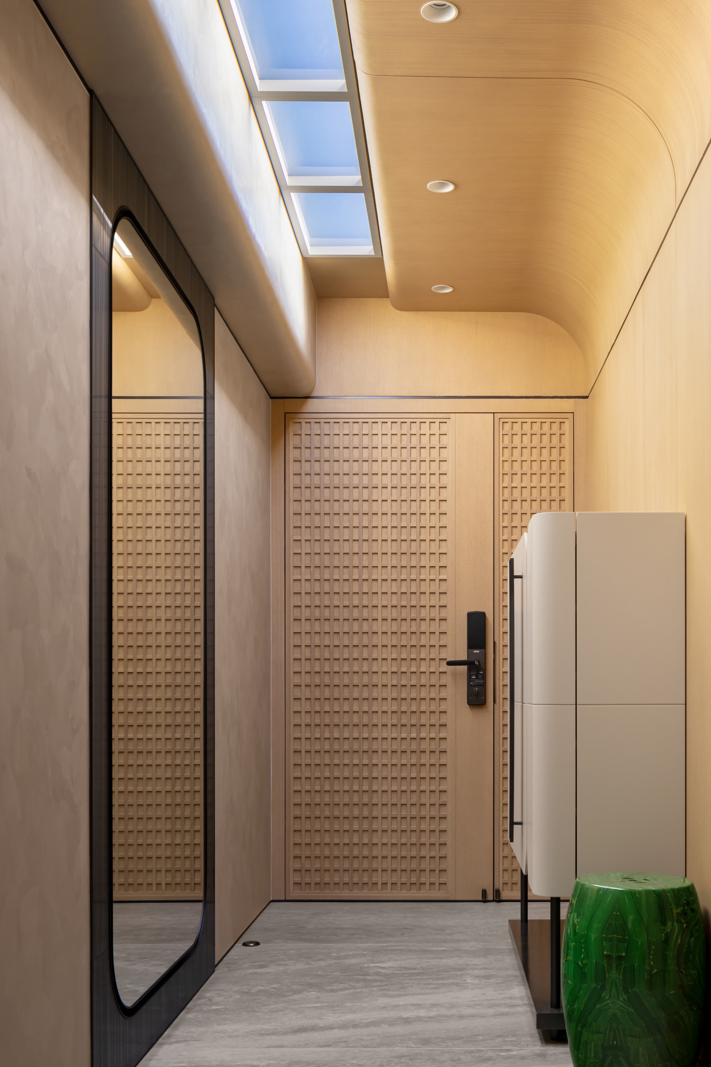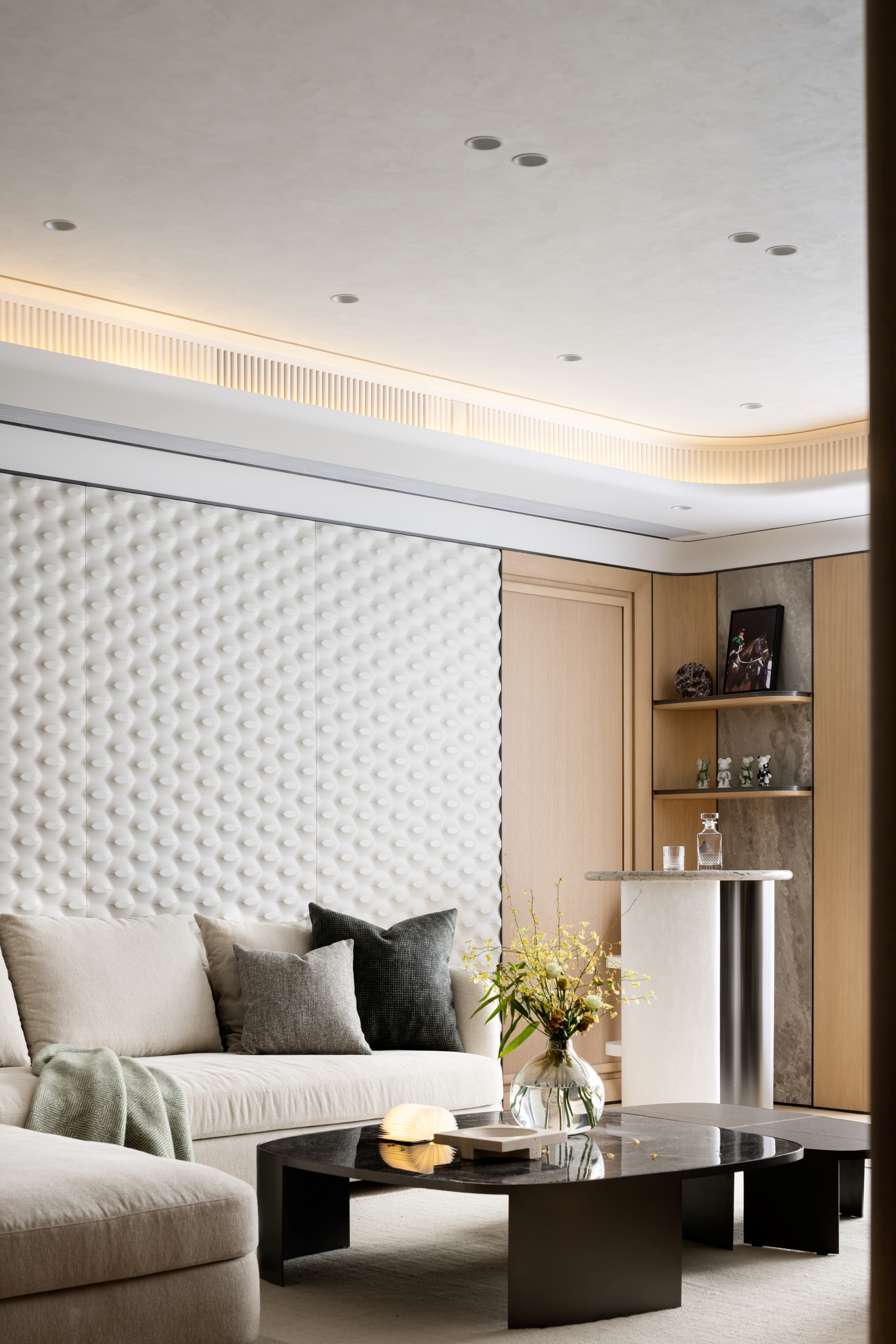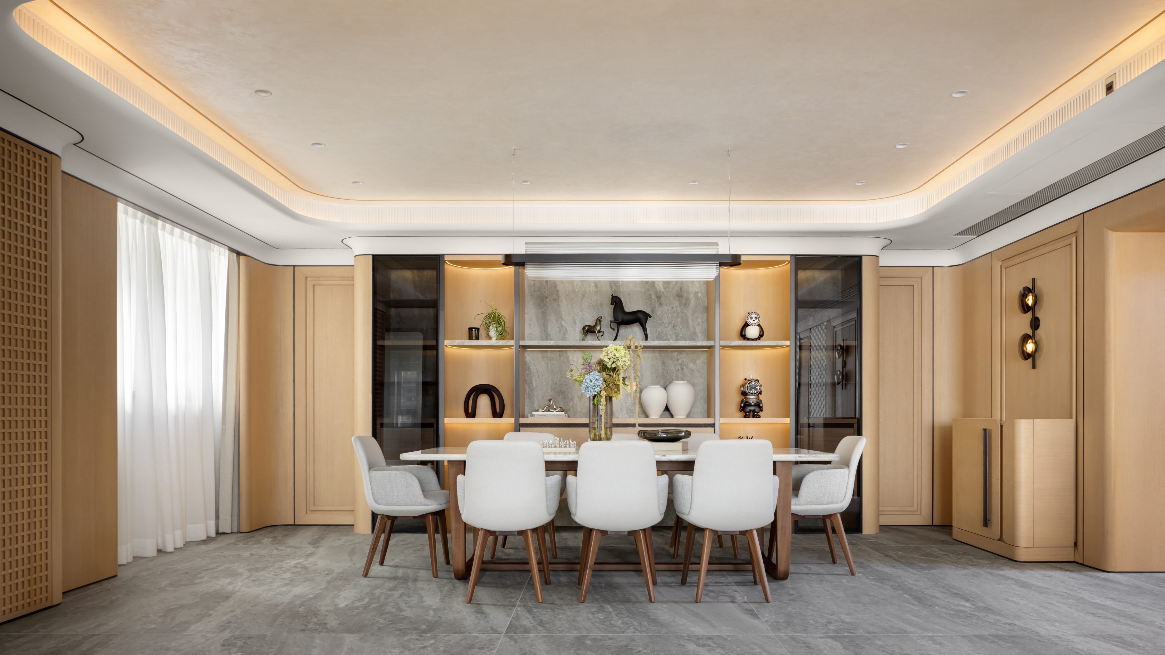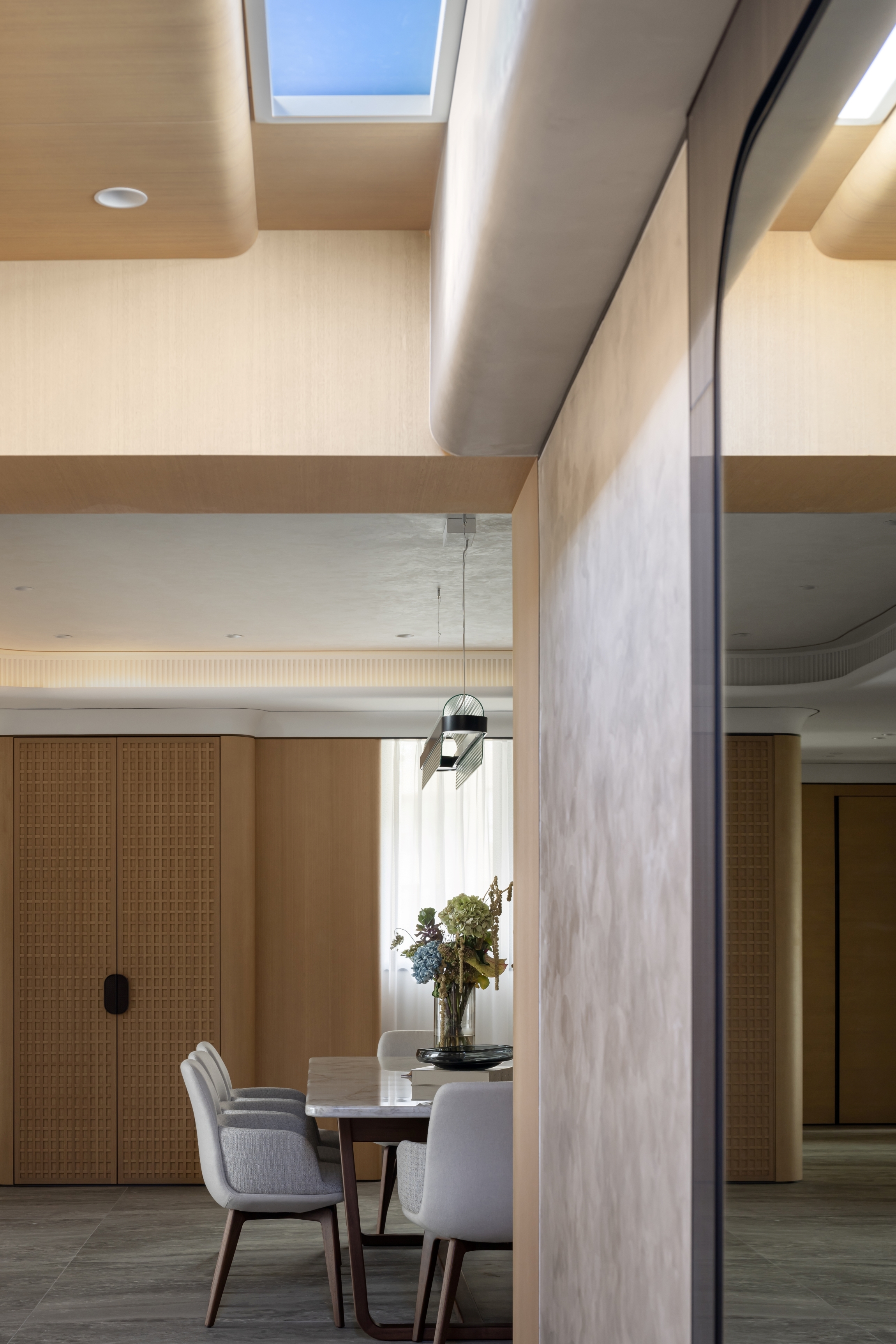 Our client seeks a family home that embodies a harmonious blend of modern aesthetics and cozy elegance. A major design highlight would be the artificial skylight in the foyer, which allows the family to enjoy natural lighting across different times of the day, starting from the abode’s entrance. The careful choice of warm gray hues as the primary color palette, complemented by light oak wood tones, establishes a cozy and inviting environment that envelops residents and guests with a sense of comfort and relaxation. While the pops of muted colors like emerald and tan inject visual variety to inject an understated vibrancy. Layered materials, such as textured wallpapers, patterned fabrics, bespoke glass, metals, and artistic paints, add depth and intricacy to the design, elevating its overall elegance. Sleek lines play a pivotal role in creating a modern aesthetic that exudes sophistication, contributing to the project's contemporary flair. Cozy and comfortable elements such as plush seating and soft textiles in the versatile gathering spaces provide a family-friendly environment that exudes serenity, without compromising on aesthetics.