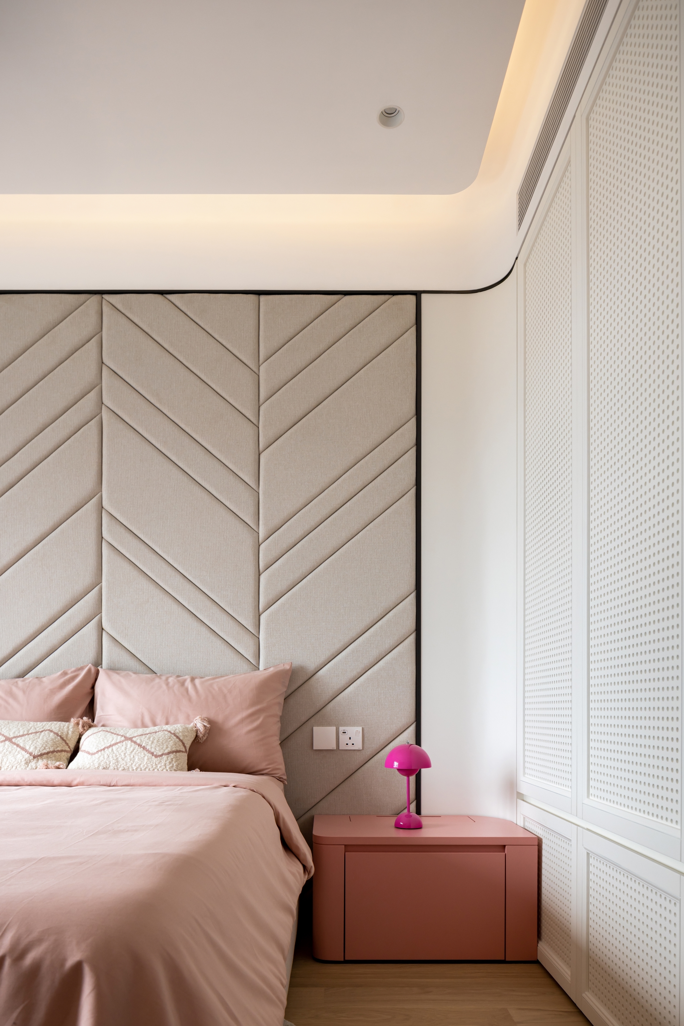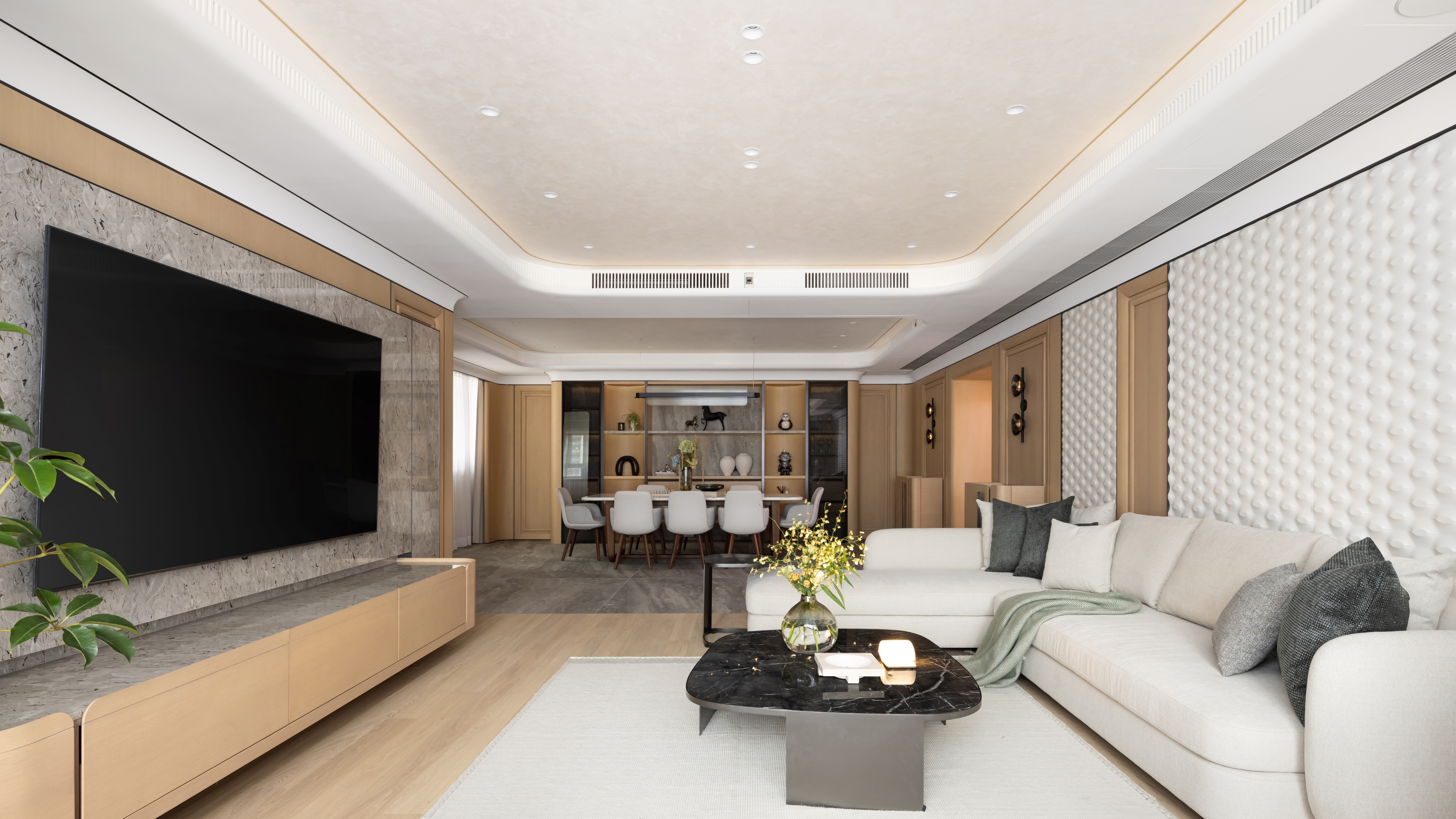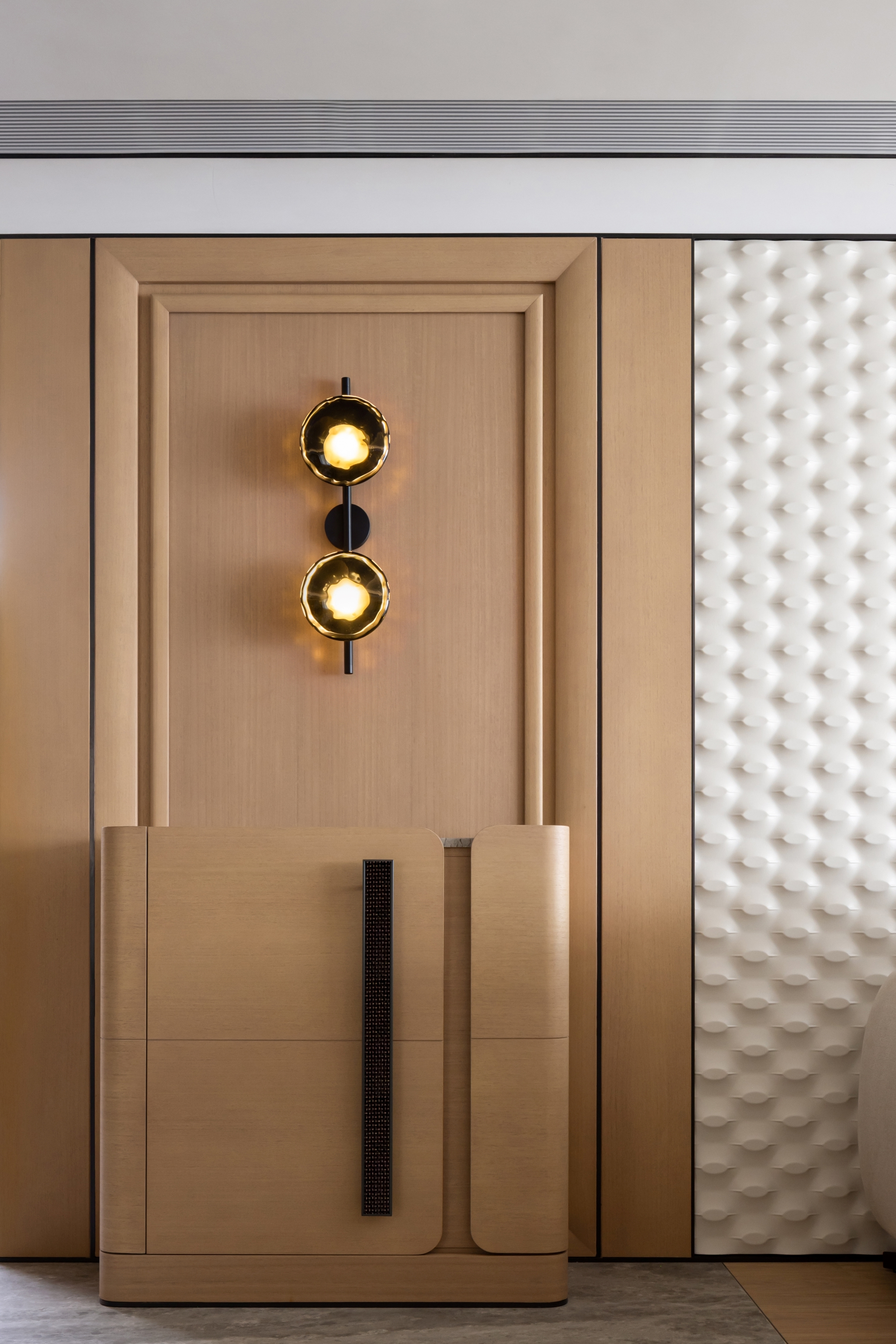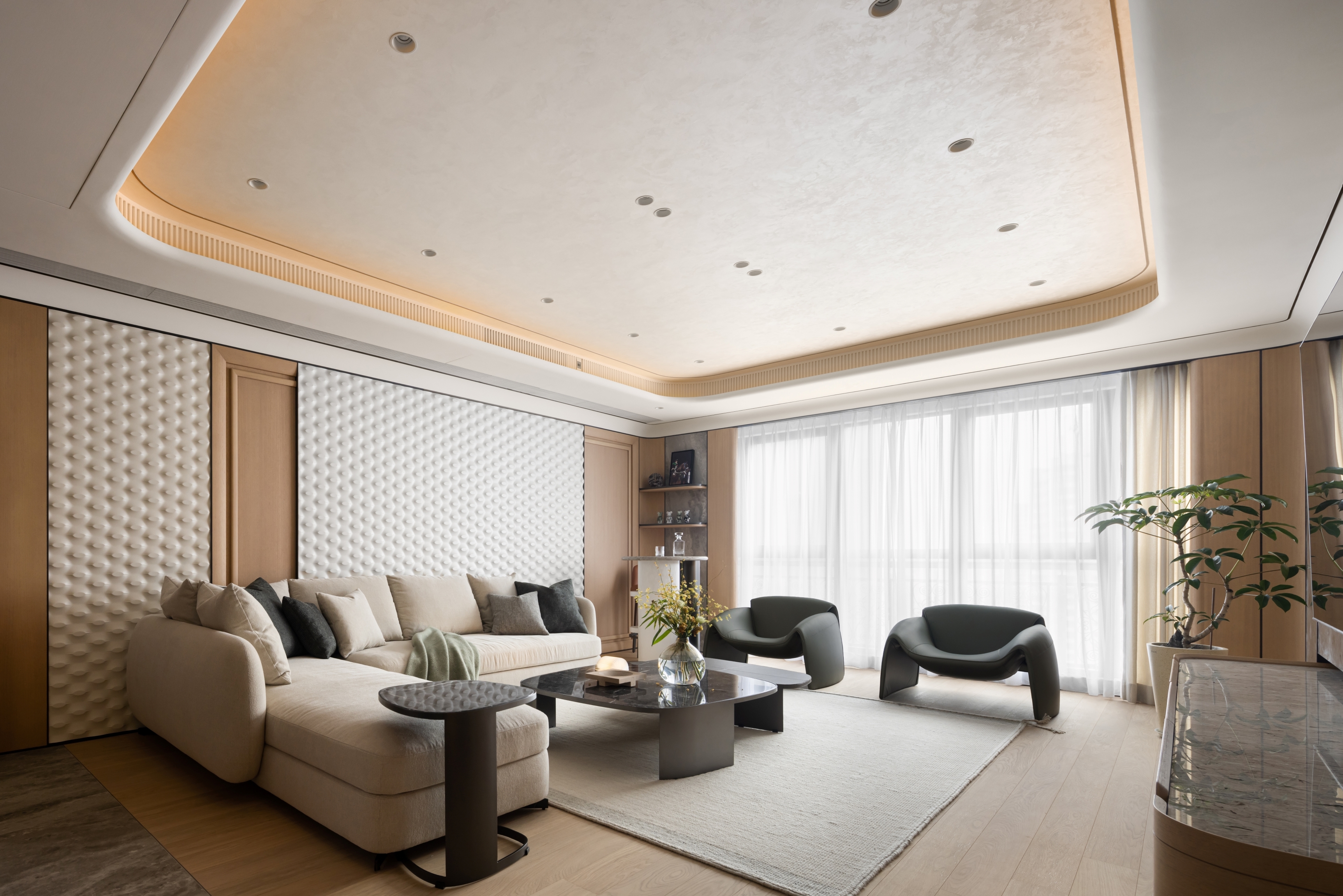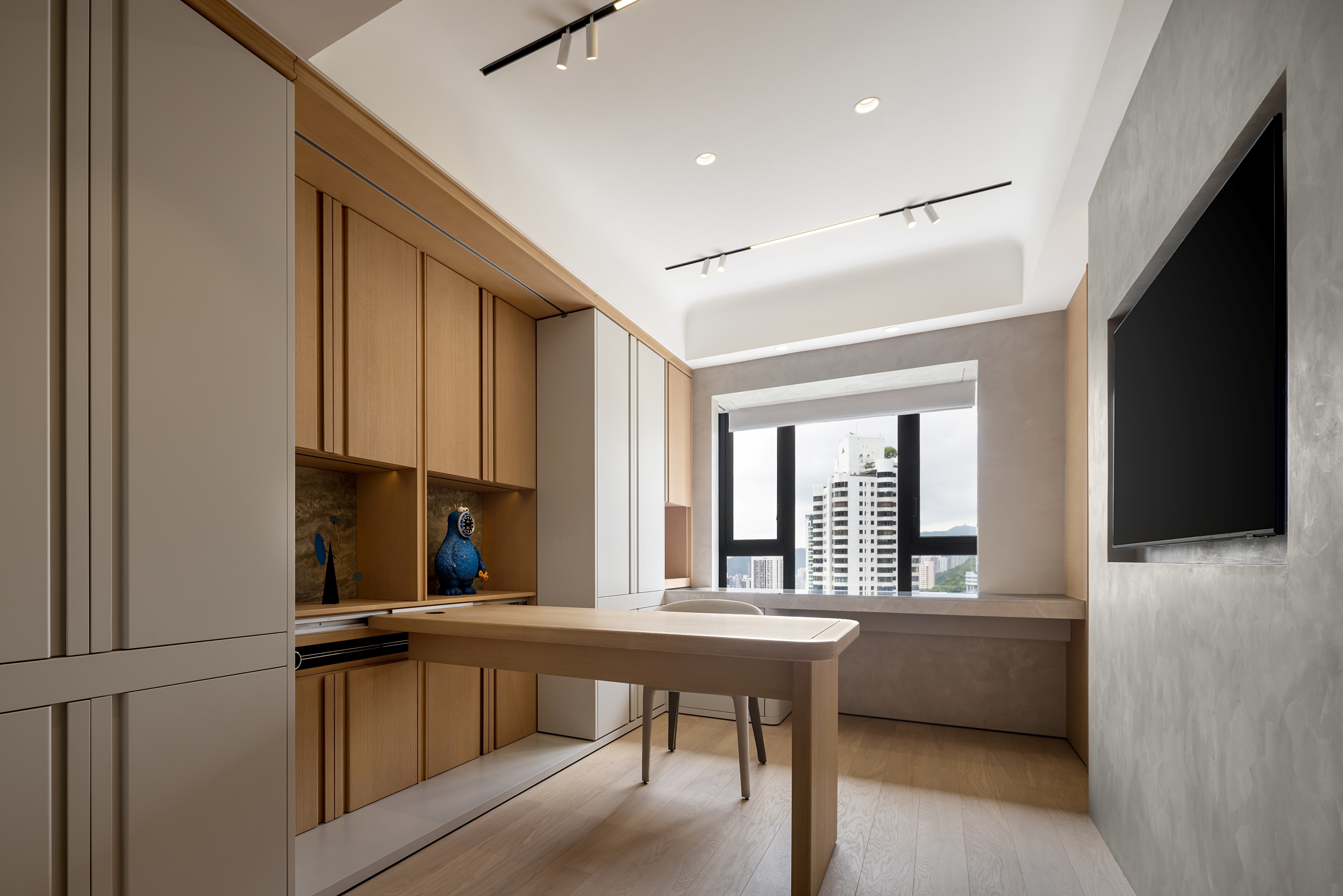 Our client seeks a family home that embodies a harmonious blend of modern aesthetics and cozy elegance. A major design highlight would be the artificial skylight in the foyer, which allows the family to enjoy natural lighting across different times of the day, starting from the abode’s entrance. The careful choice of warm gray hues as the primary color palette, complemented by light oak wood tones, establishes a cozy and inviting environment that envelops residents and guests with a sense of comfort and relaxation. While the pops of muted colors like emerald and tan inject visual variety to inject an understated vibrancy. Layered materials, such as textured wallpapers, patterned fabrics, bespoke glass, metals, and artistic paints, add depth and intricacy to the design, elevating its overall elegance. Sleek lines play a pivotal role in creating a modern aesthetic that exudes sophistication, contributing to the project's contemporary flair. Cozy and comfortable elements such as plush seating and soft textiles in the versatile gathering spaces provide a family-friendly environment that exudes serenity, without compromising on aesthetics.