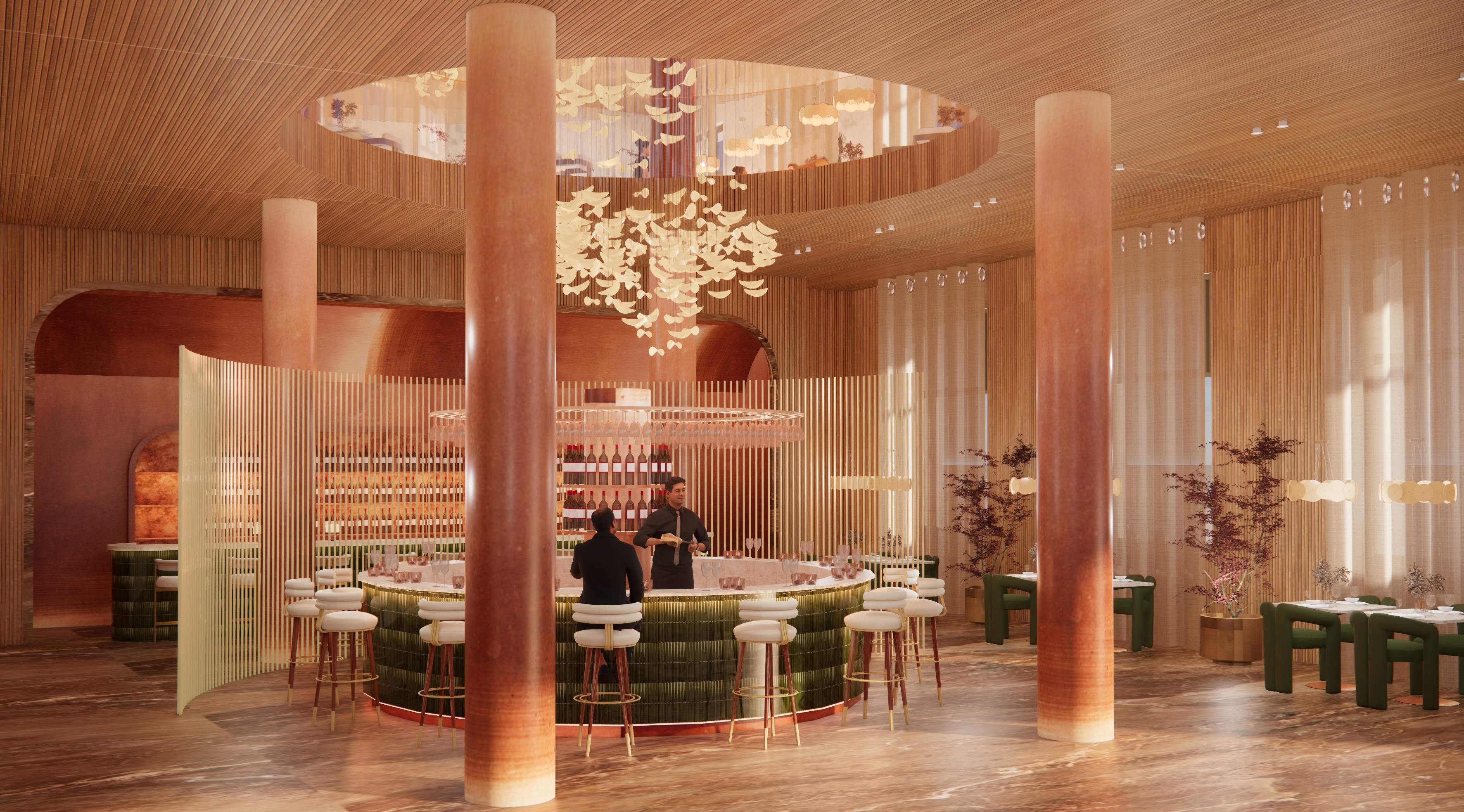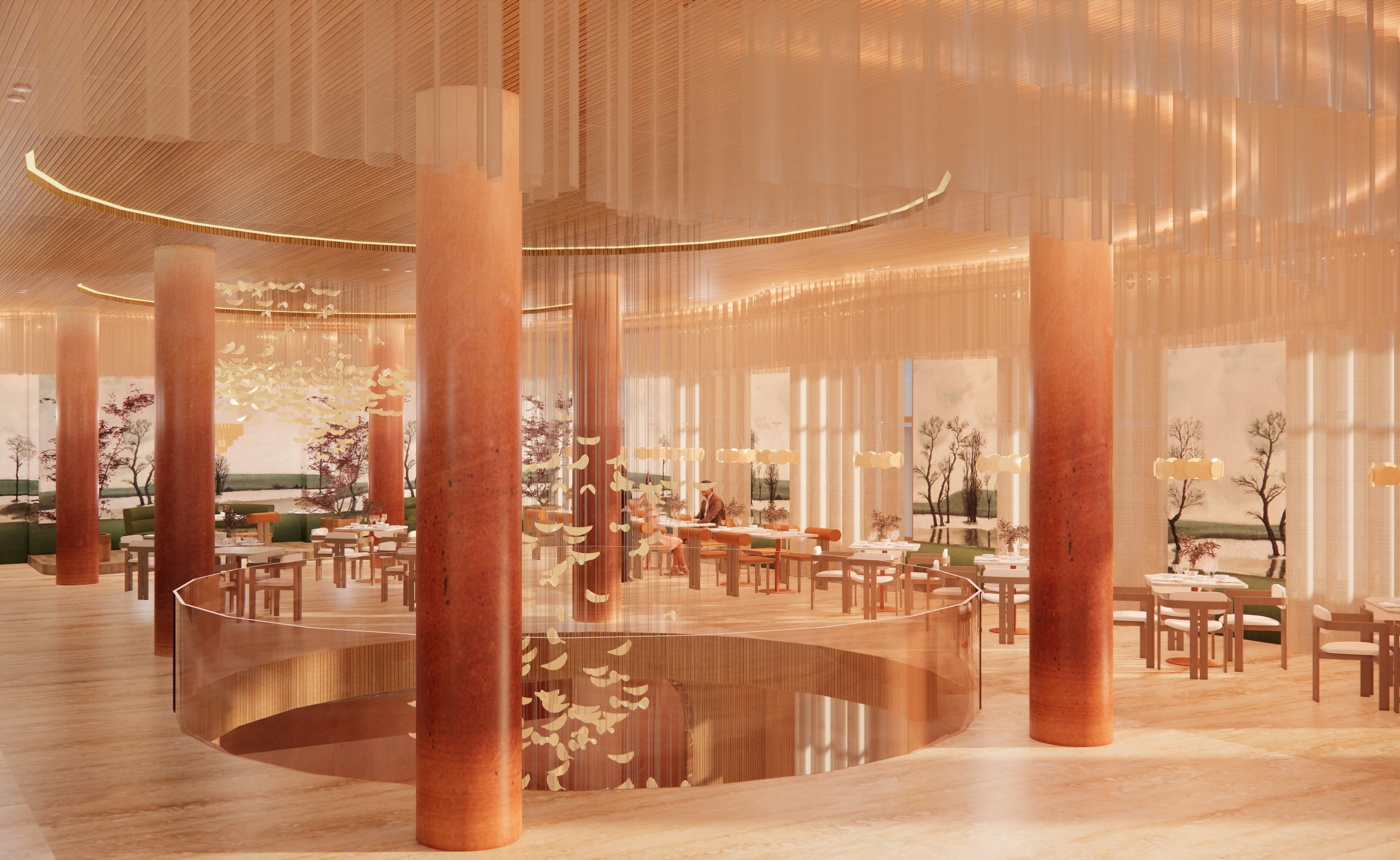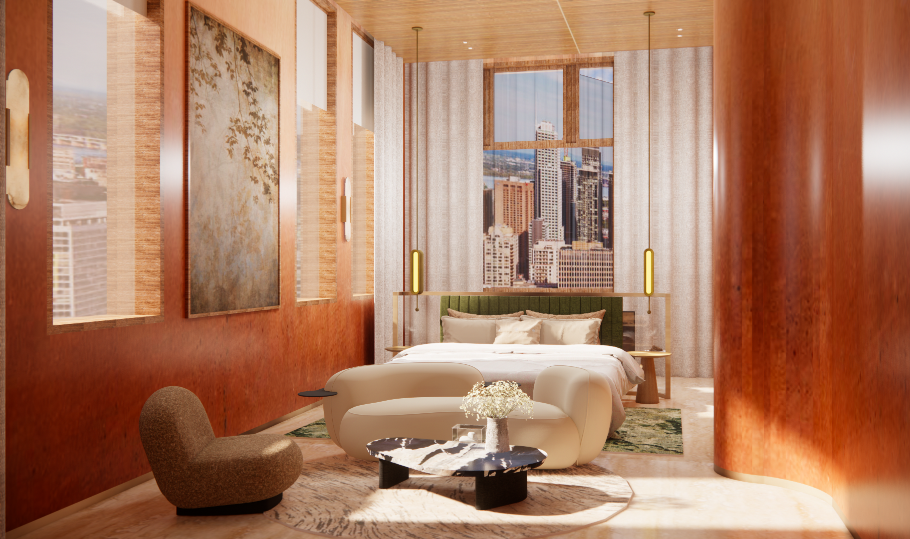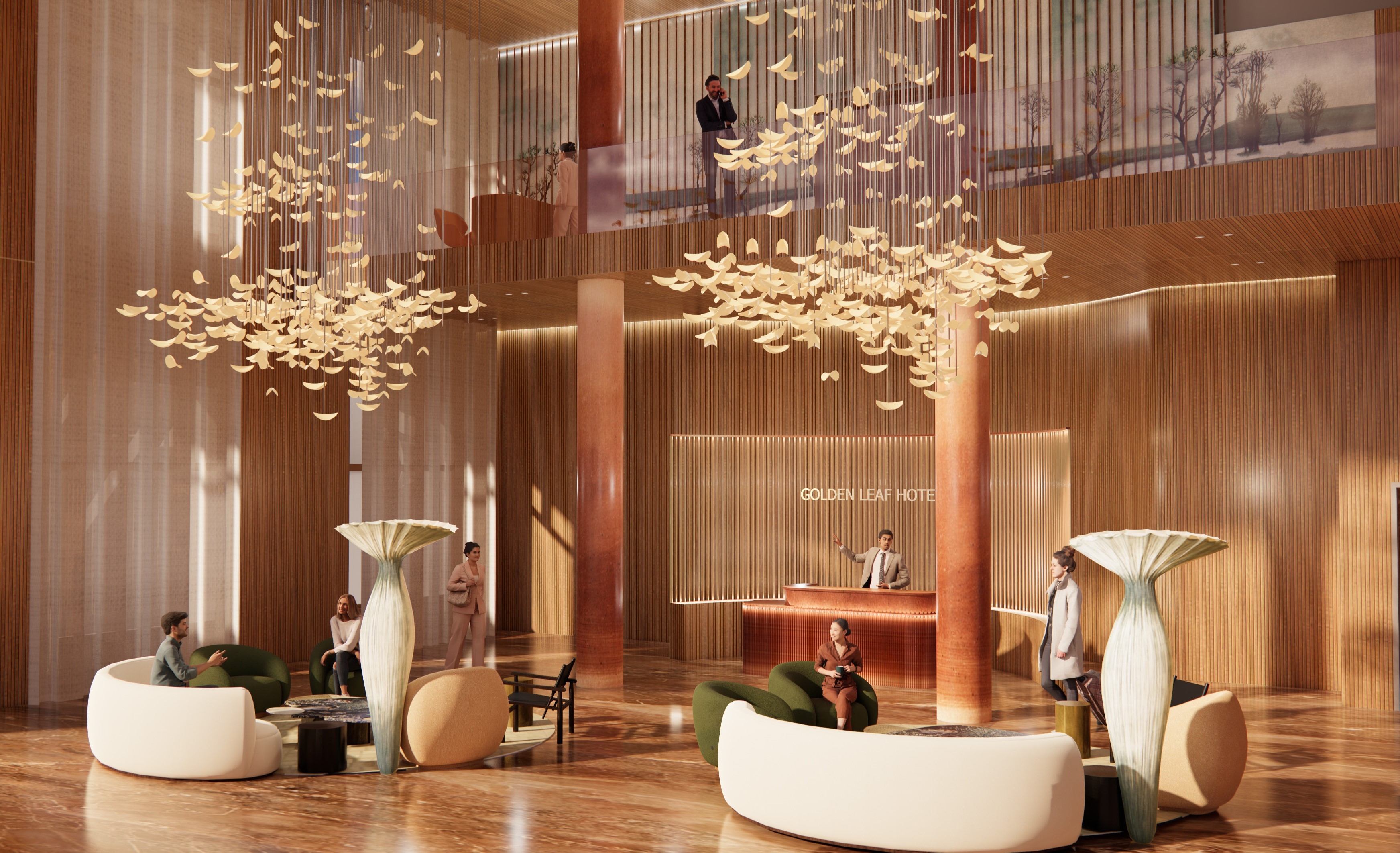 Chute d'Automne: A Luxurious Autumn Symphony. Rooted in Montreal's architectural history, this hotel is a celebration of the enchanting spirit of autumn. It is a tribute to Montreal's timeless elegance, harmonizing classic sophistication with autumn's vibrancy. Meticulously chosen contrasting colors mirror changing leaves, creating a visual spectacle. Symmetrical layouts provide balance, while thoughtfully selected organic furnishings bring nature's beauty indoors, enhancing the sense of calmness.