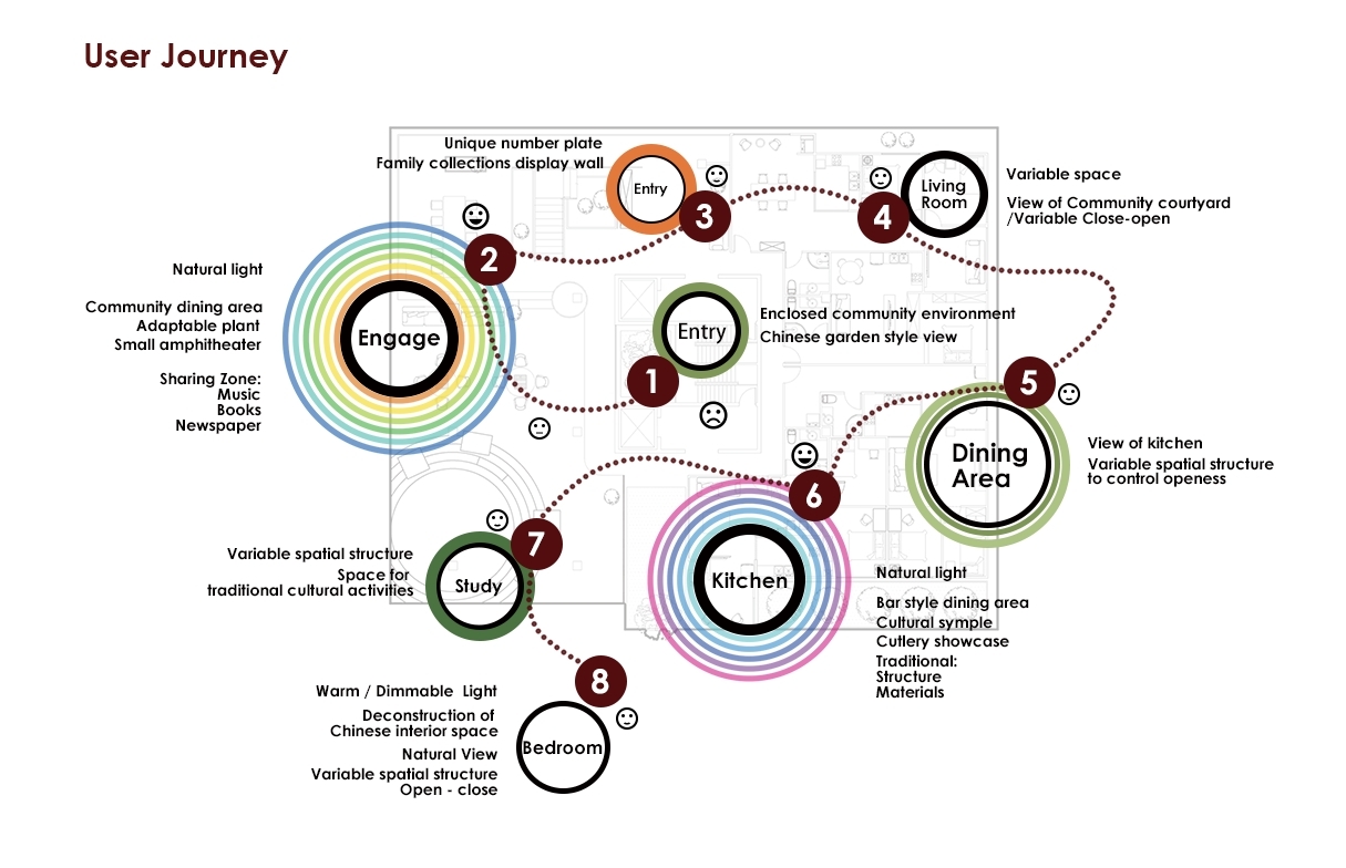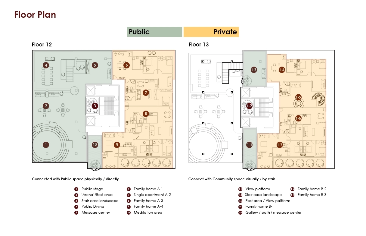 This design aims to counter the weakening family intimacy caused by housing issues in Chinese cities. The concept integrates behavioral and community theories to enhance resident interaction and intimacy. The design includes community spaces in high-rise residences, considering Chinese family characteristics and traditional social dynamics. By incorporating sight, sound, activities, and functionality, the design creates a network promoting communication and relationship-building. This innovative approach addresses housing challenges while emphasizing social connections to restore family intimacy.