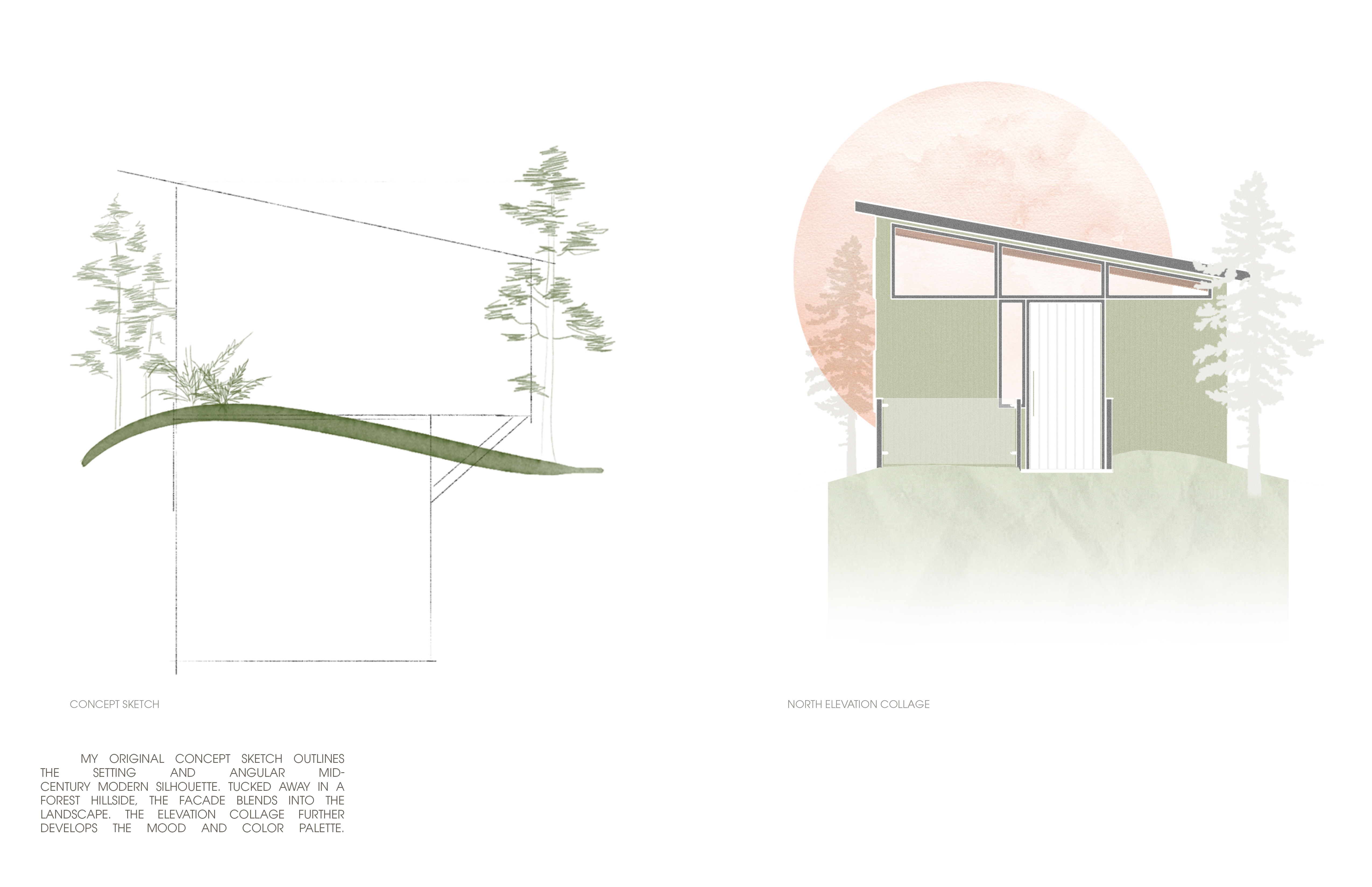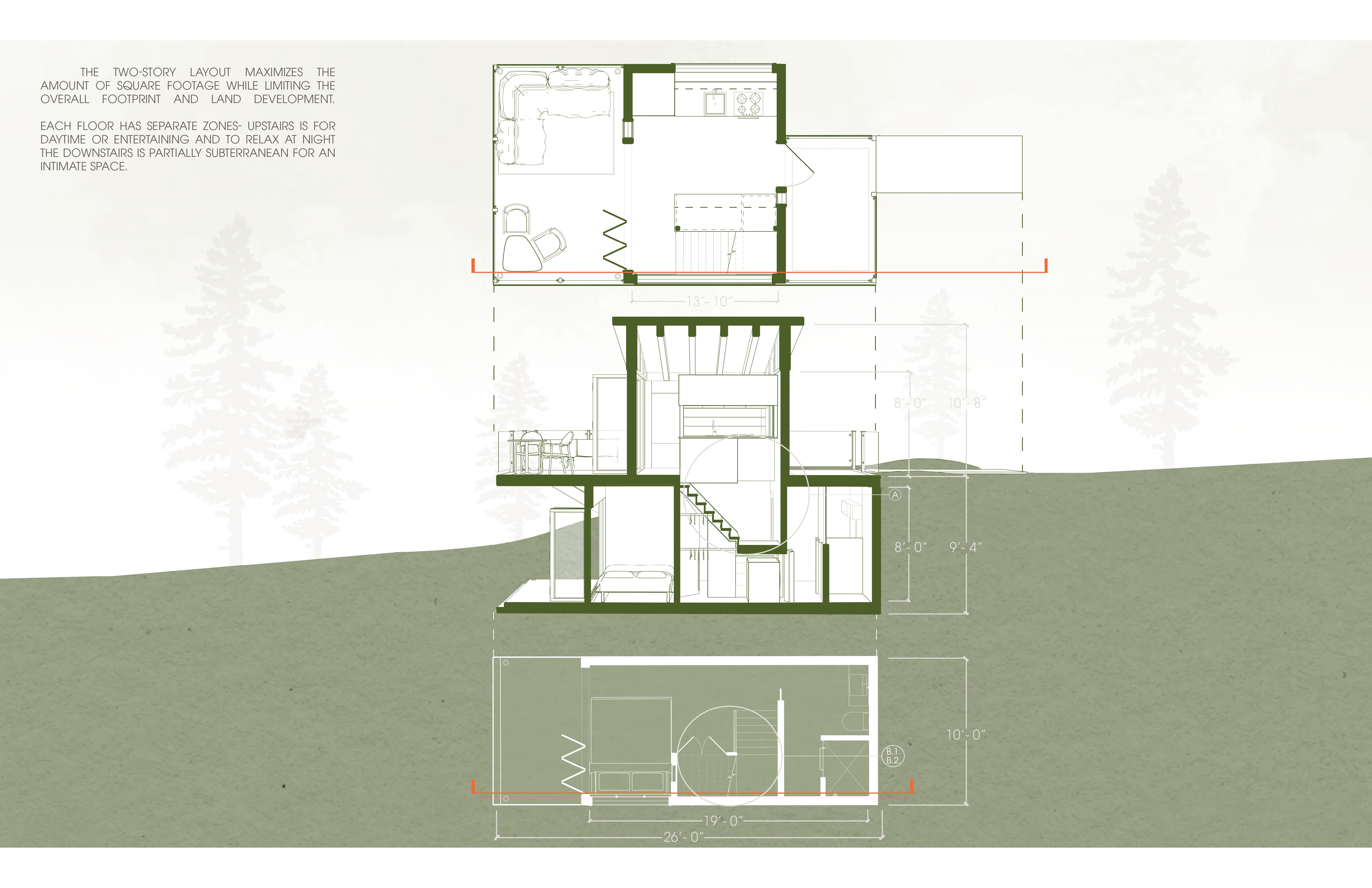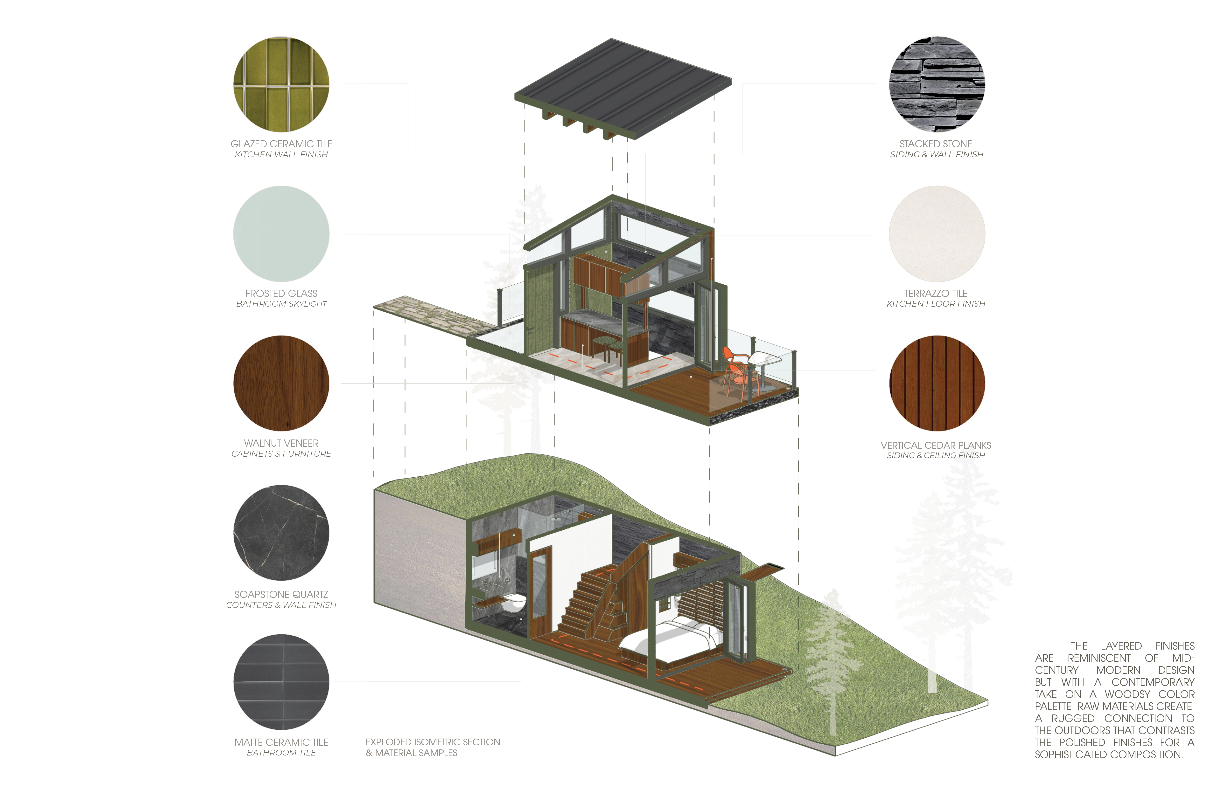 This design is a compact vacation home, blending modern comfort with nature. The 300 sqft ground floor home, under 20 ft tall, offers a getaway experience. The mid-century style integrates with the landscape. A semi-subterranean structure harmonizes with nature, promoting healing and reducing ecological impact. A two-story layout optimizes space while creating distinct zones. Upstairs, natural light bathes the living areas. Downstairs is a cozy, private retreat. A frosted glass skylight in the bathroom ceiling enhances the underground space. Clever features maximize utility, like a dual-purpose kitchen cabinet, stair storage, and an open closet. The primary suite boasts a lavish en-suite and ample closet space. Natural materials in a woodsy palette connect with the surroundings. Polished finishes add sophistication. Asymmetrical architecture invites exploration. Accordion doors blend indoor-outdoor living. The kitchen offers storage without obstructing views. The bathroom is illuminated by a skylight- light flows into the bedroom. Opening to a south-facing yard, the house merges with nature, providing an enriching coexistence.