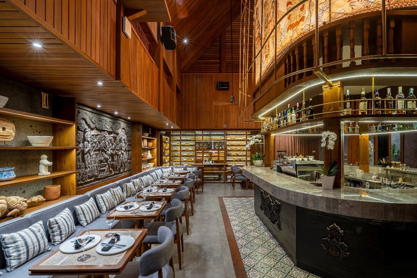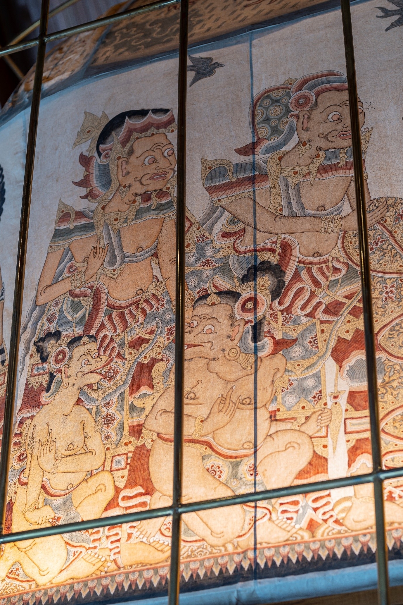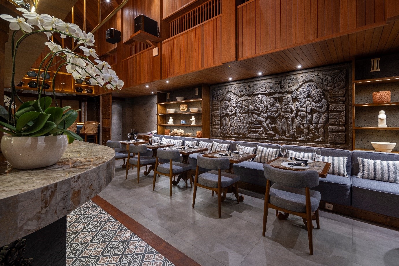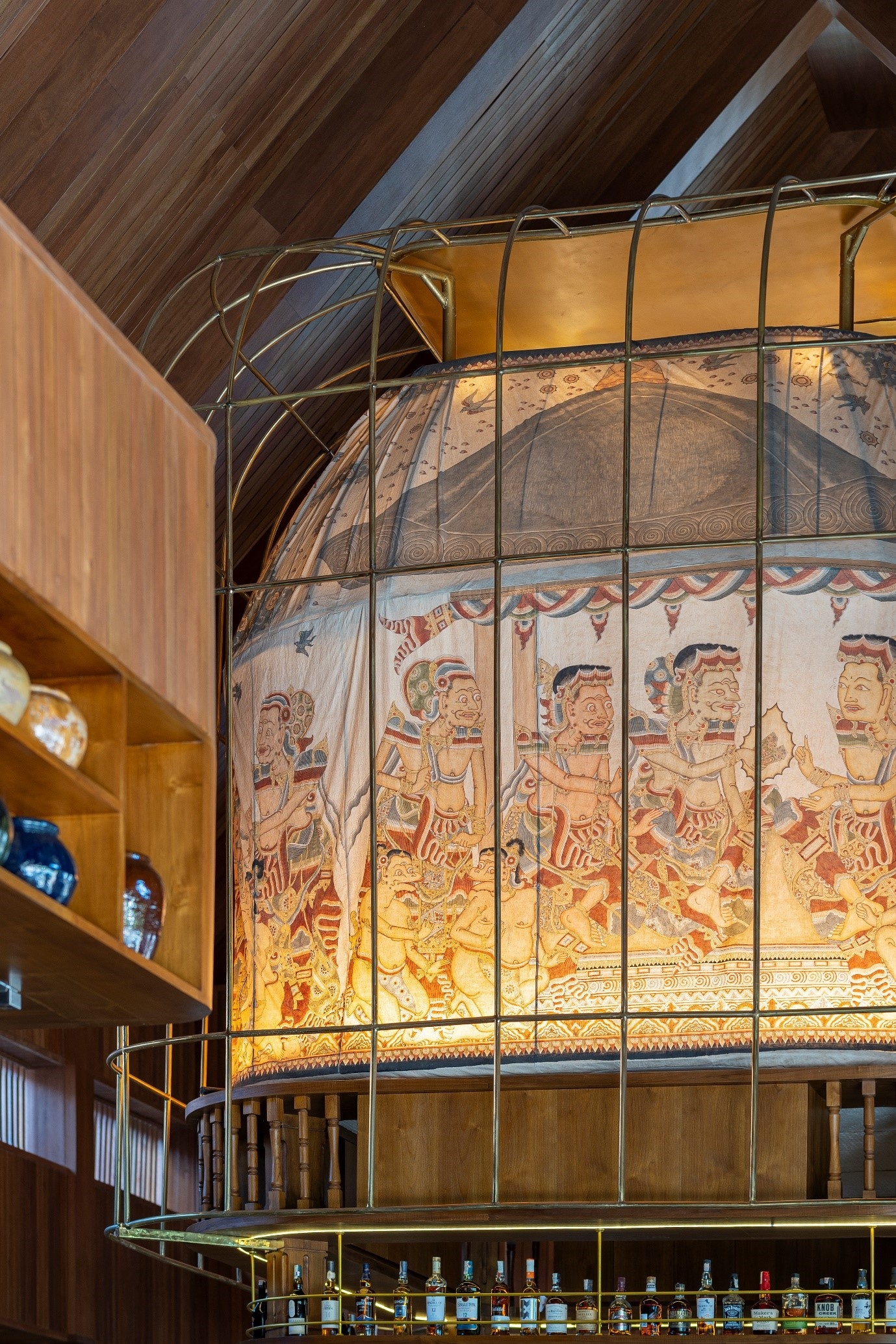 What sets Madawa Restaurant apart is its personalized design that is truly unique. The centerpiece installation is a large lantern made of Kamasan painting and a large brass cage. This installation tells the story of the Mahabharata epic where the Pandava army was defeated by the Kauravas during a dice game. Kamasan painting is a typical Balinese painting style that includes several elements such as line composition, shape, color, and wayang characters. This concept has been incorporated into all areas of the restaurant, creating a cohesive and stunning look.