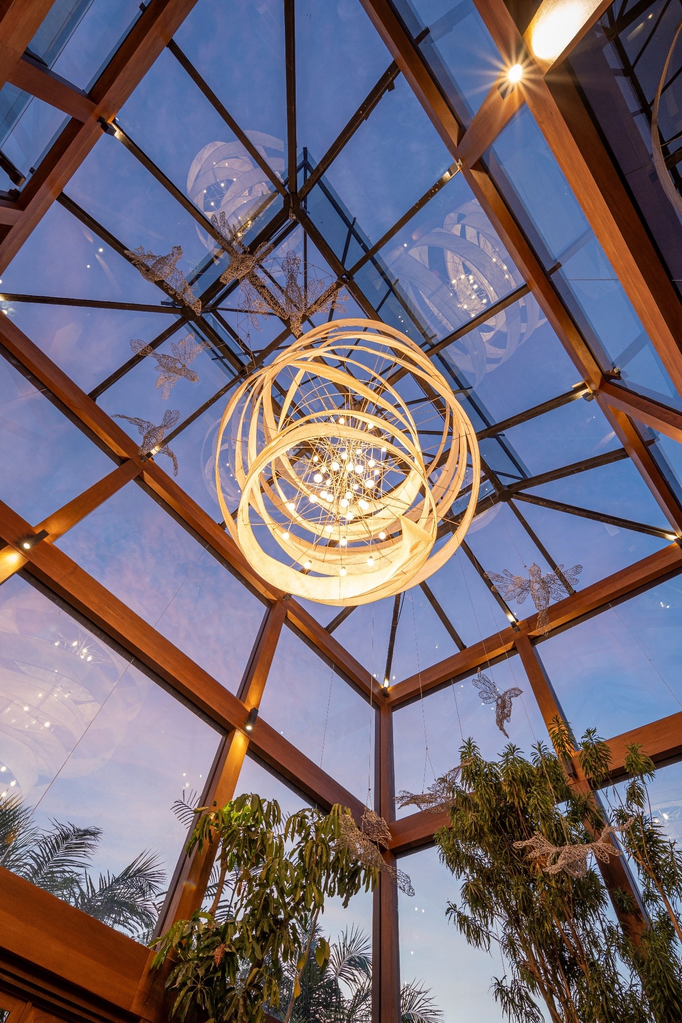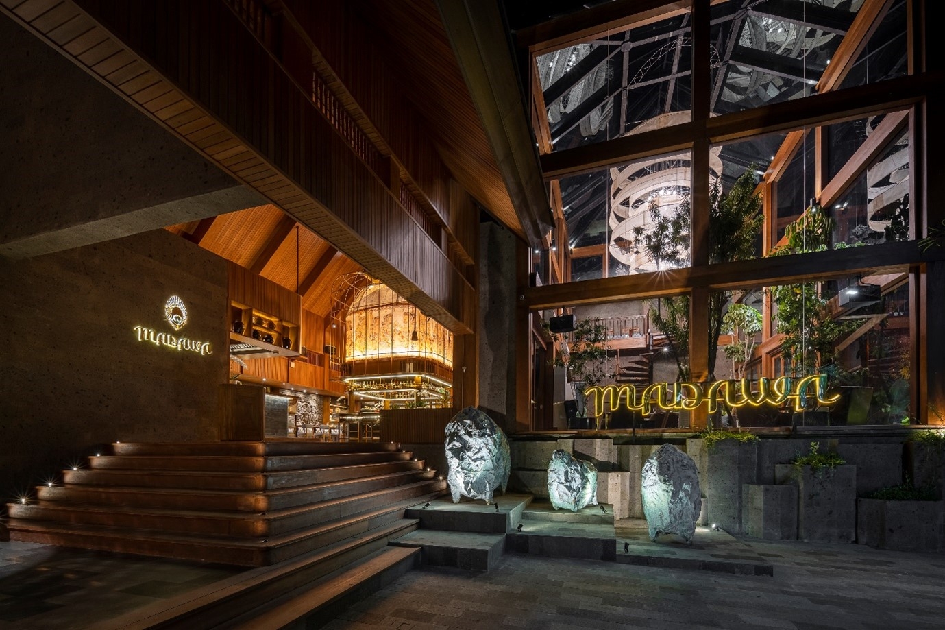 In addition to the centerpiece installation, Madawa Restaurant has additional artwork designs that complement the interior look. For example, the hanging lamps in the glass house area are made of spinning fabric