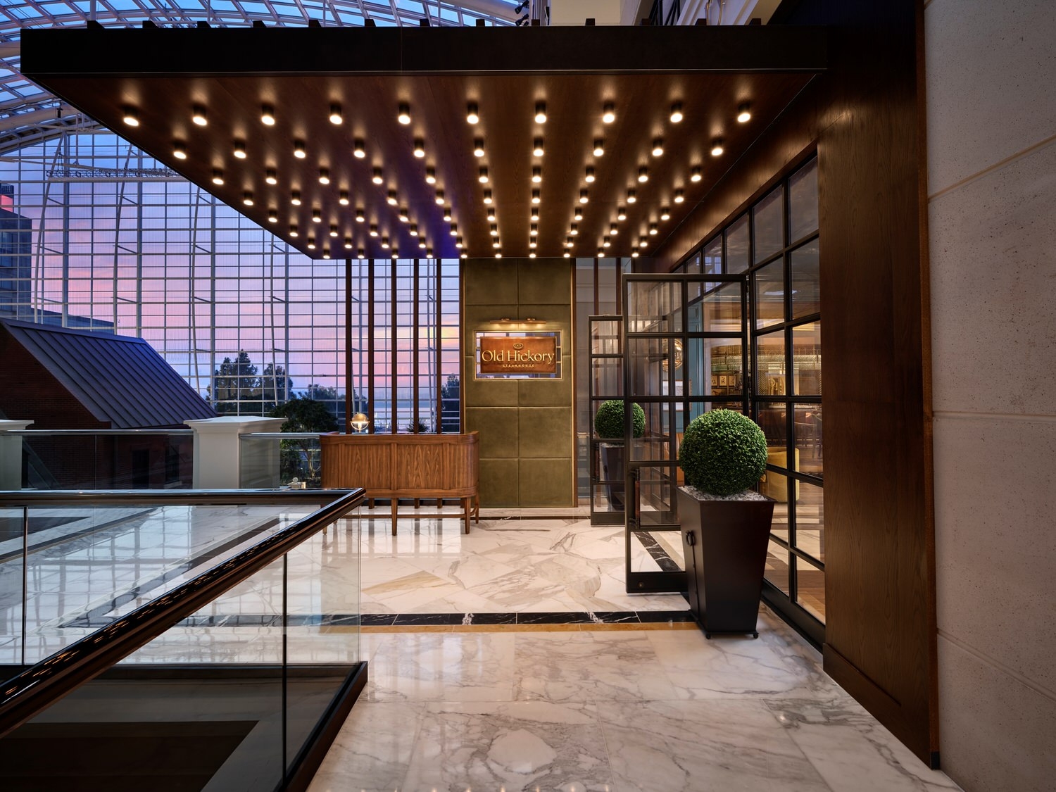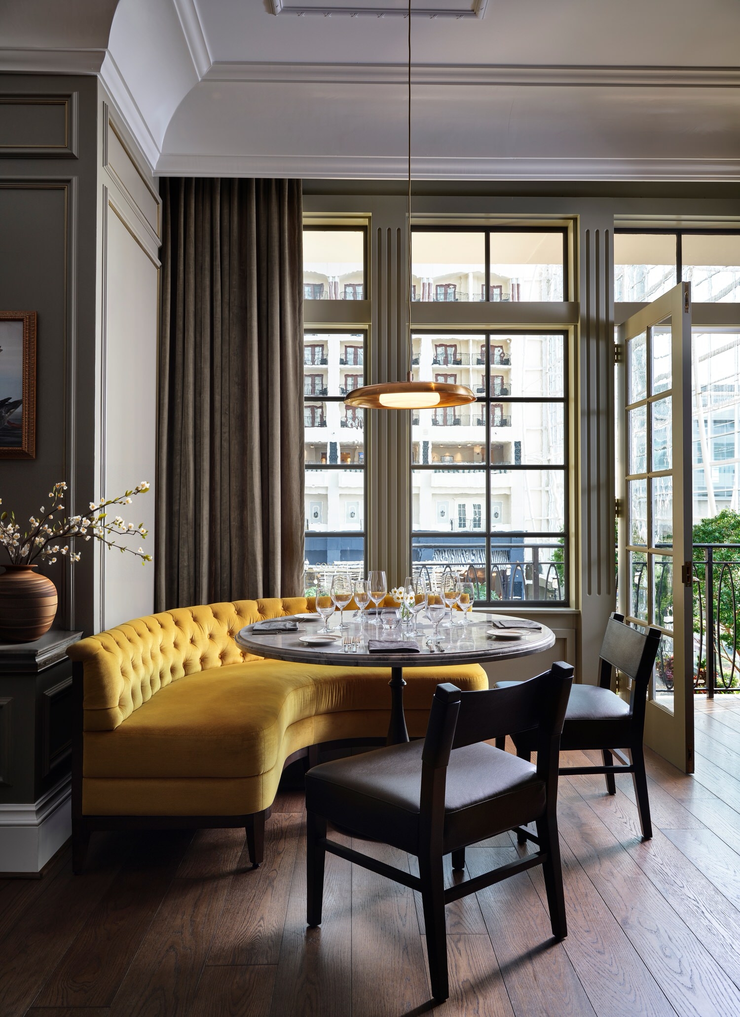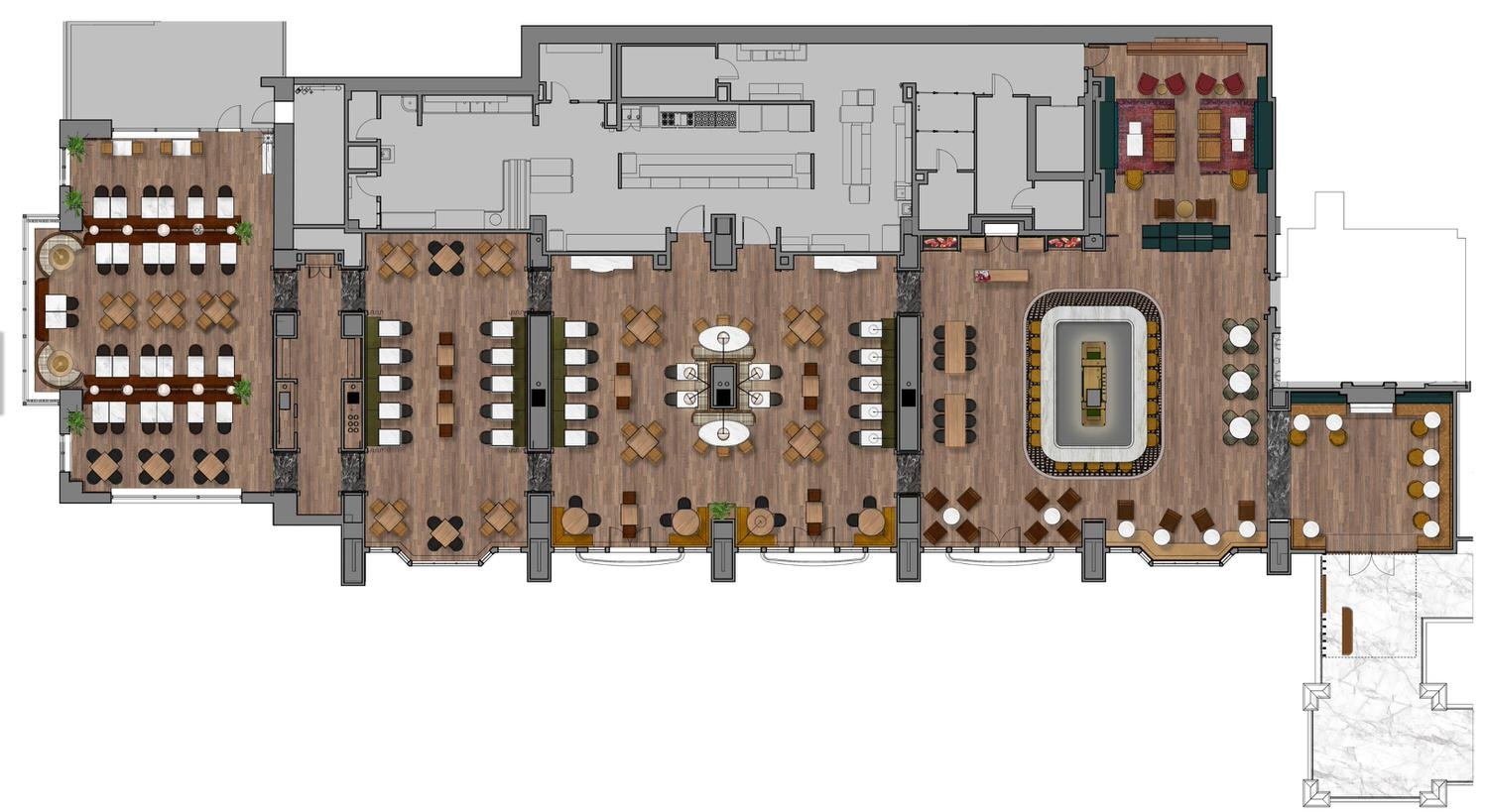 The overall design drew from the rich history of Maryland and other cities along the Potomac River in the greater DC area. We wanted to blur the lines between modern and traditional elements in a unique way throughout the space. Each area from the bar lounge to the dining area has its own character and story but carries the same concept throughout. We wanted the design to give guests a different experience each time they visited. We achieved this through cohesive but varied color palettes for each area, different types of seating groups and dining experiences. The enlarged bar creates a destination for guests to have a drink with friends or alone while the bar lounge creates a more causal and quiet dining experience by the entrance. The bar design itself lends itself for even more varied experiences by having the lively bar area with TVs to watch the game with other guests or the smaller adjacent room for groups to rent out for a more private setting. The philosophy behind our design was to create a space where guests would start their night and hopefully come back later to end it.