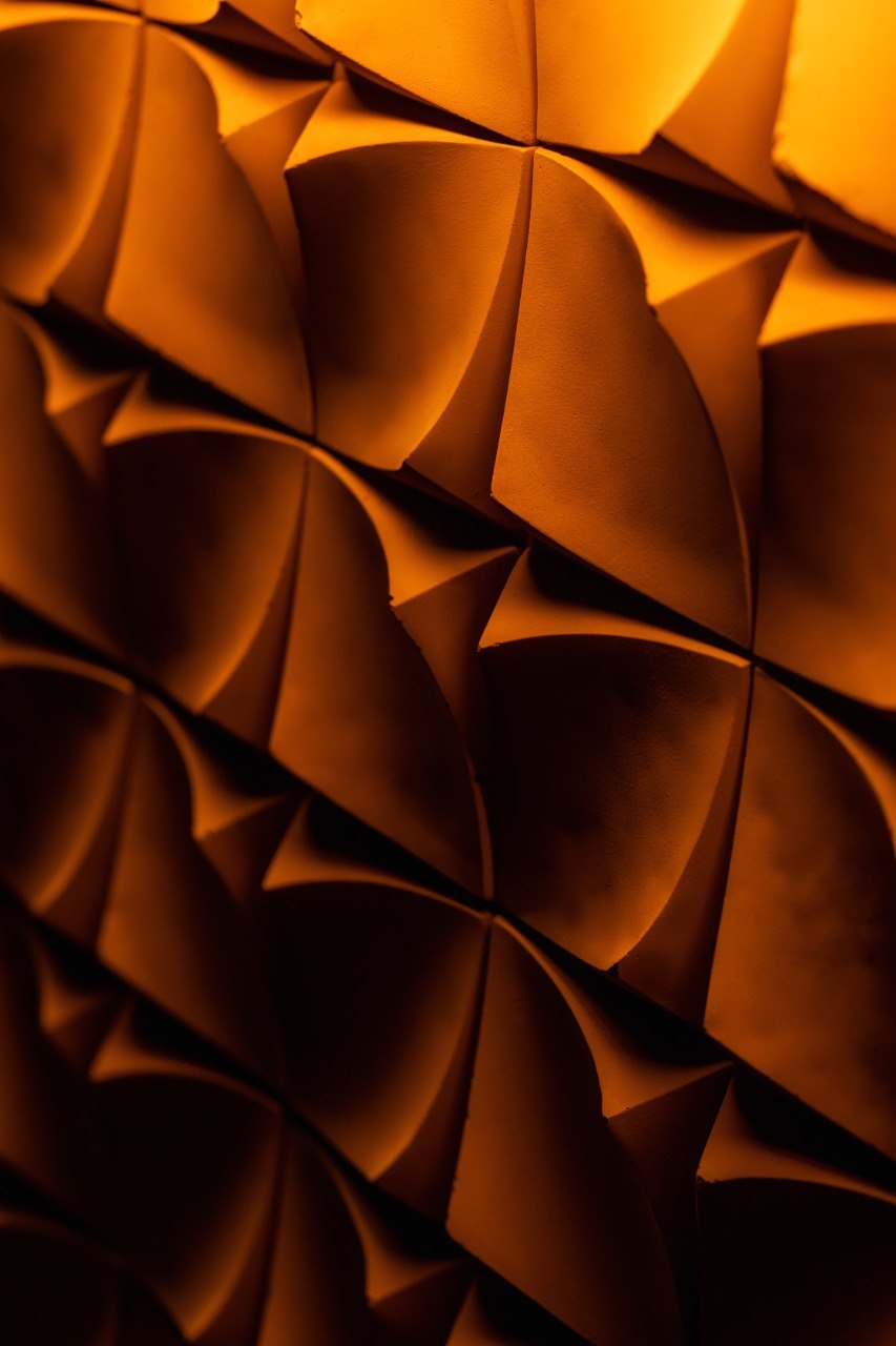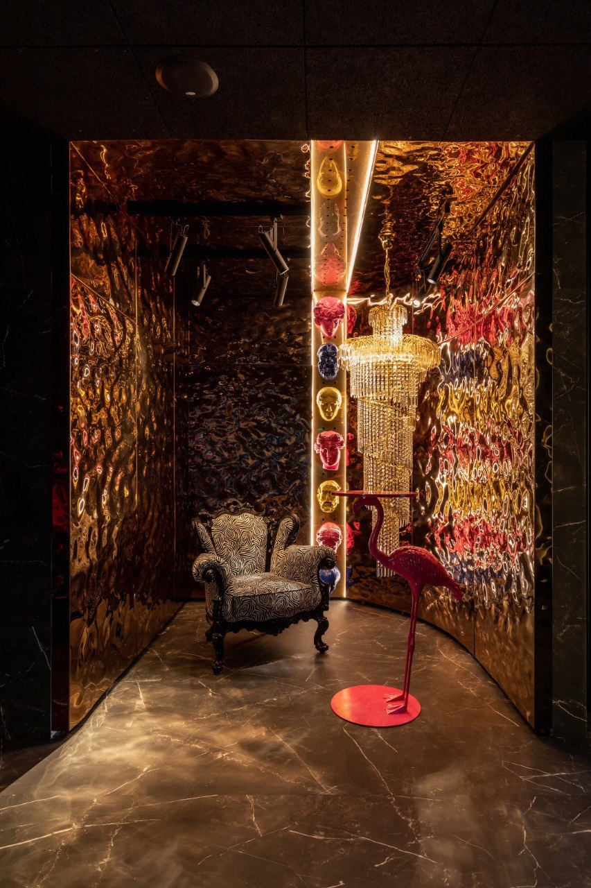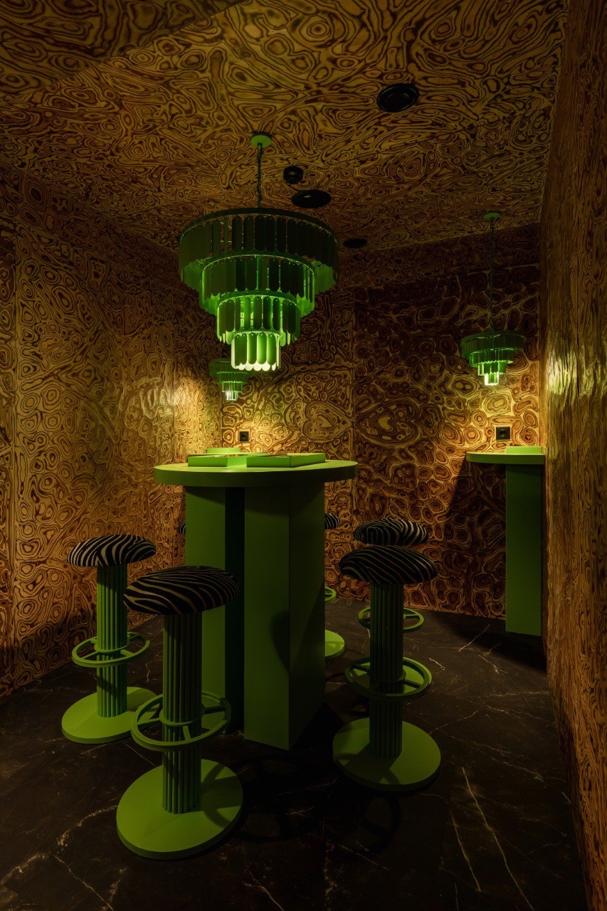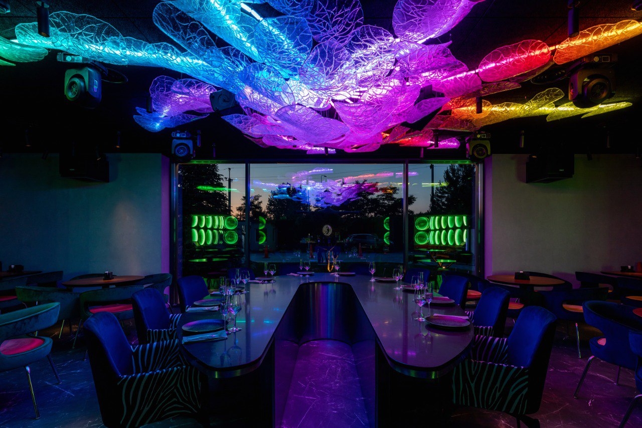 The main decoration of the hall is a chandelier placed above a specially shaped-designer table. The chandelier looks like an octopus and covers the main part of the ceiling. This is the first experience of combining glass-blowing compositions with media elements. These are special contour lamps that consist of separate sealed modules connected by a wire, but at the same time they look like a continuous light line that bends in two directions, like a spine.