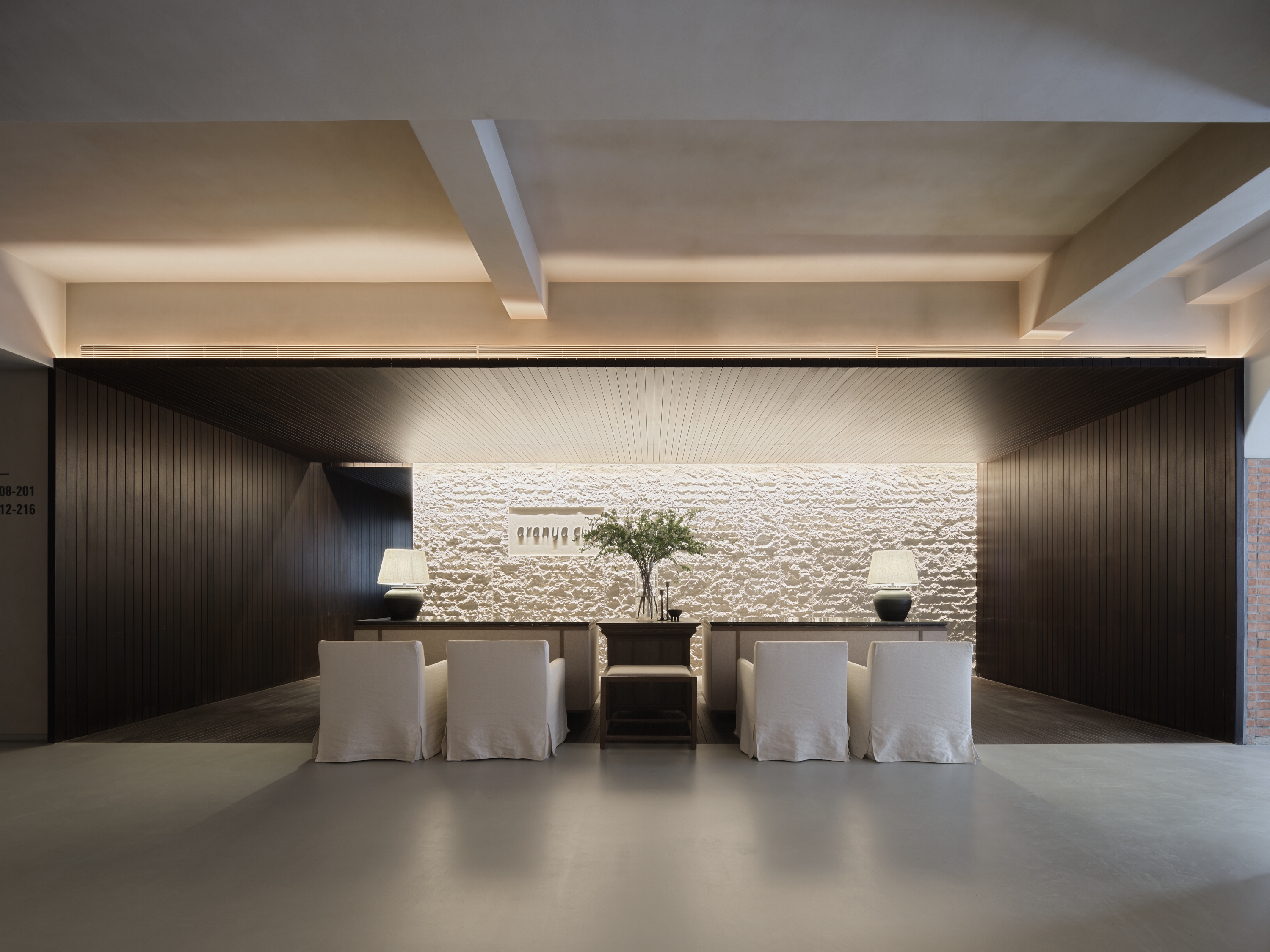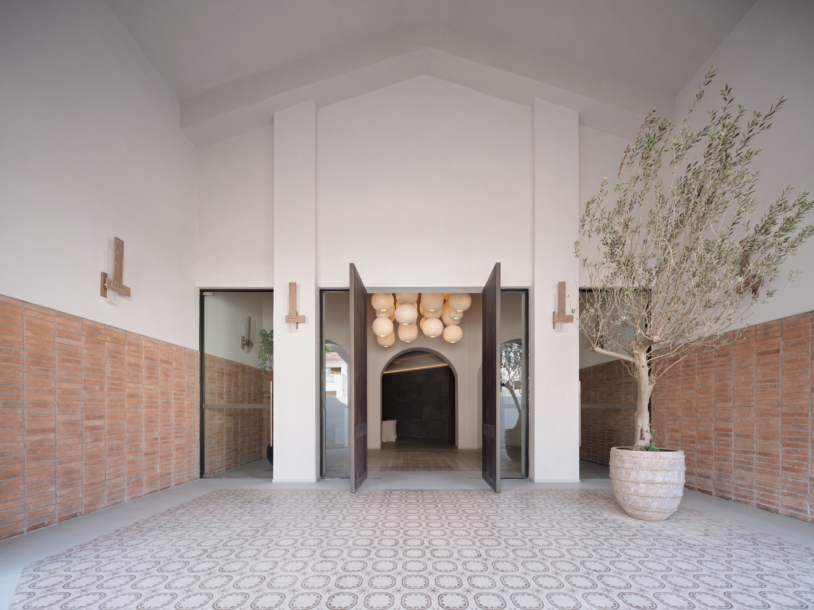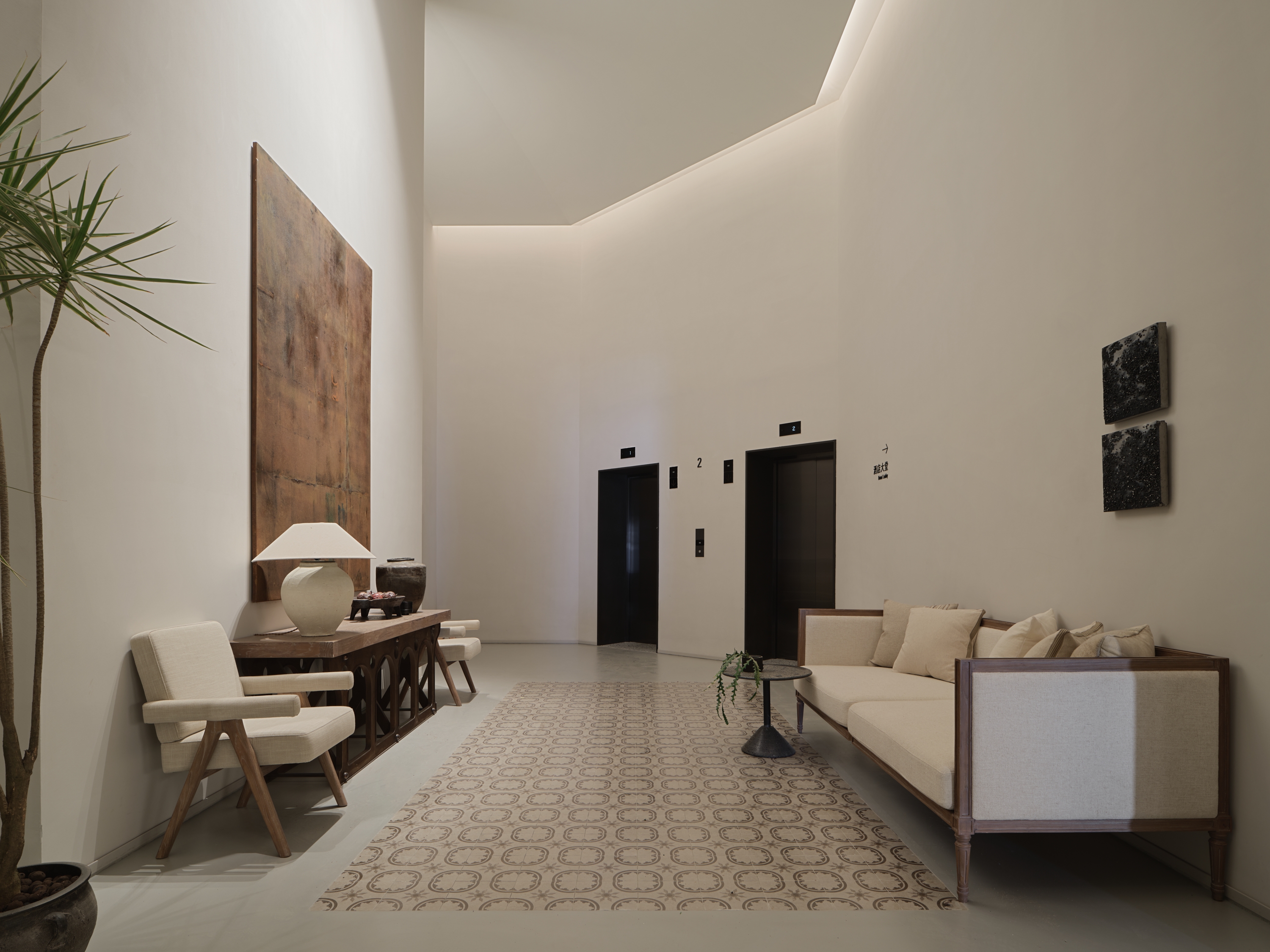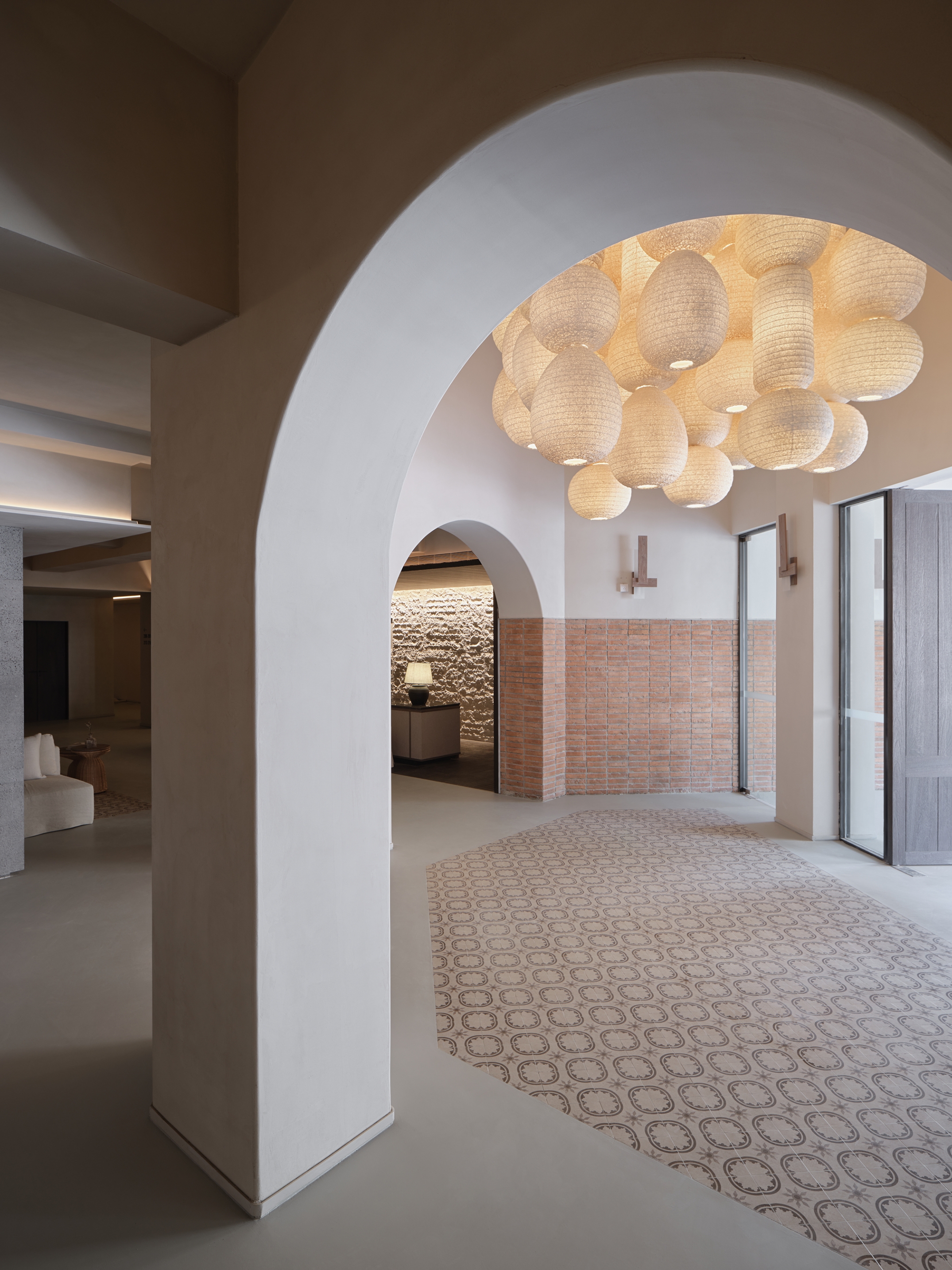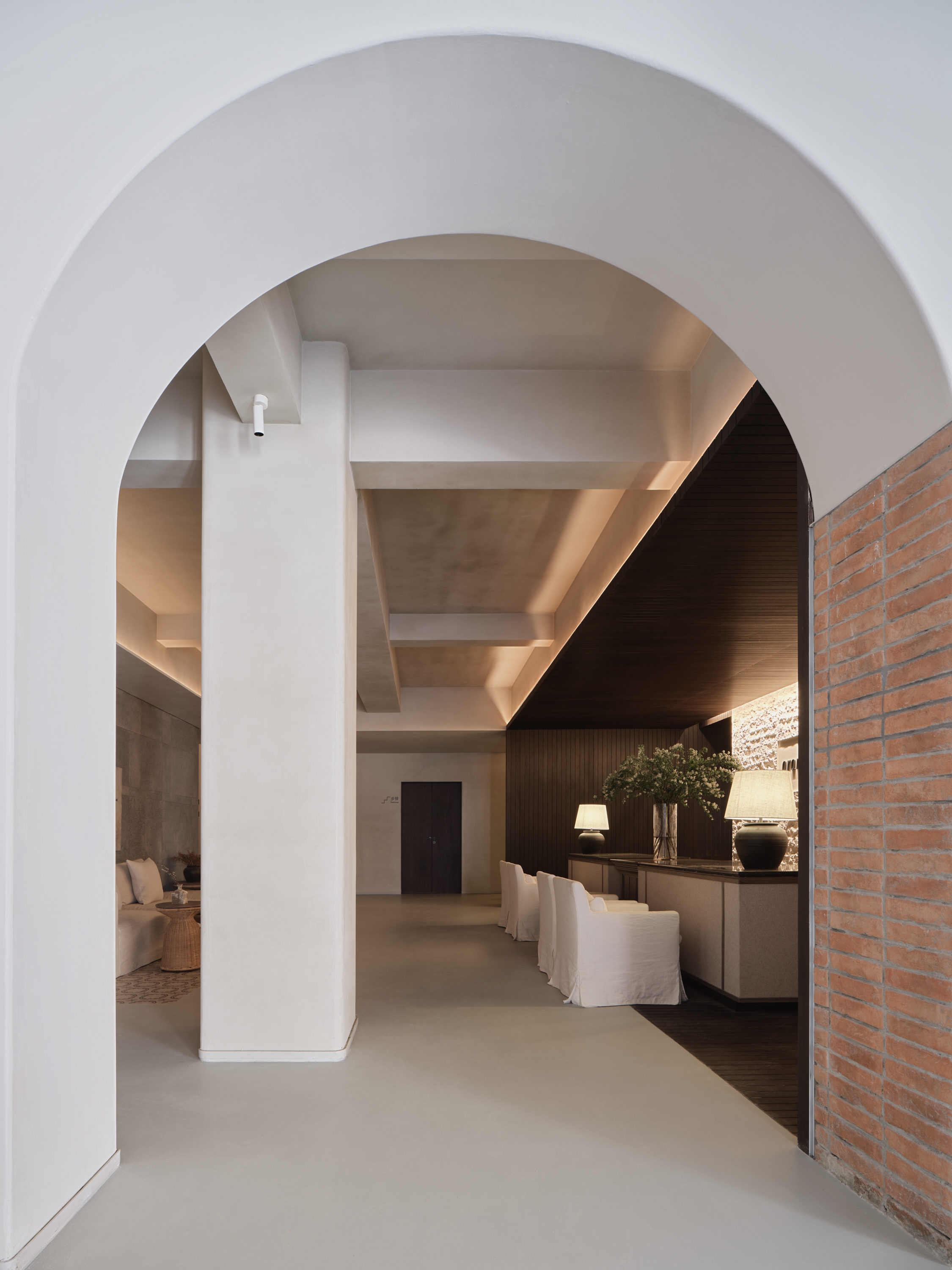 The ARANYA CLUB hotel is located in SANYA, China, it has 10 guest rooms with broad and diverse landscape views. Outside is the lively main street, and downstairs are cozy cafes and bars. White walls, old wood, handmade red bricks, and clean cement floors form the main tone of the space. Traditional architectural elements such as arches, concrete columns and thick walls lend a sense of tranquility and seclusion, resulting in a space that is both cathartic and satisfying. The lighting fixtures arranged in a short array at the top of the hall have a strong sense of presence and become the identity of the space. The long cotton and linen sofa and single chair in the seating area create the first feeling of coming home for the guests.