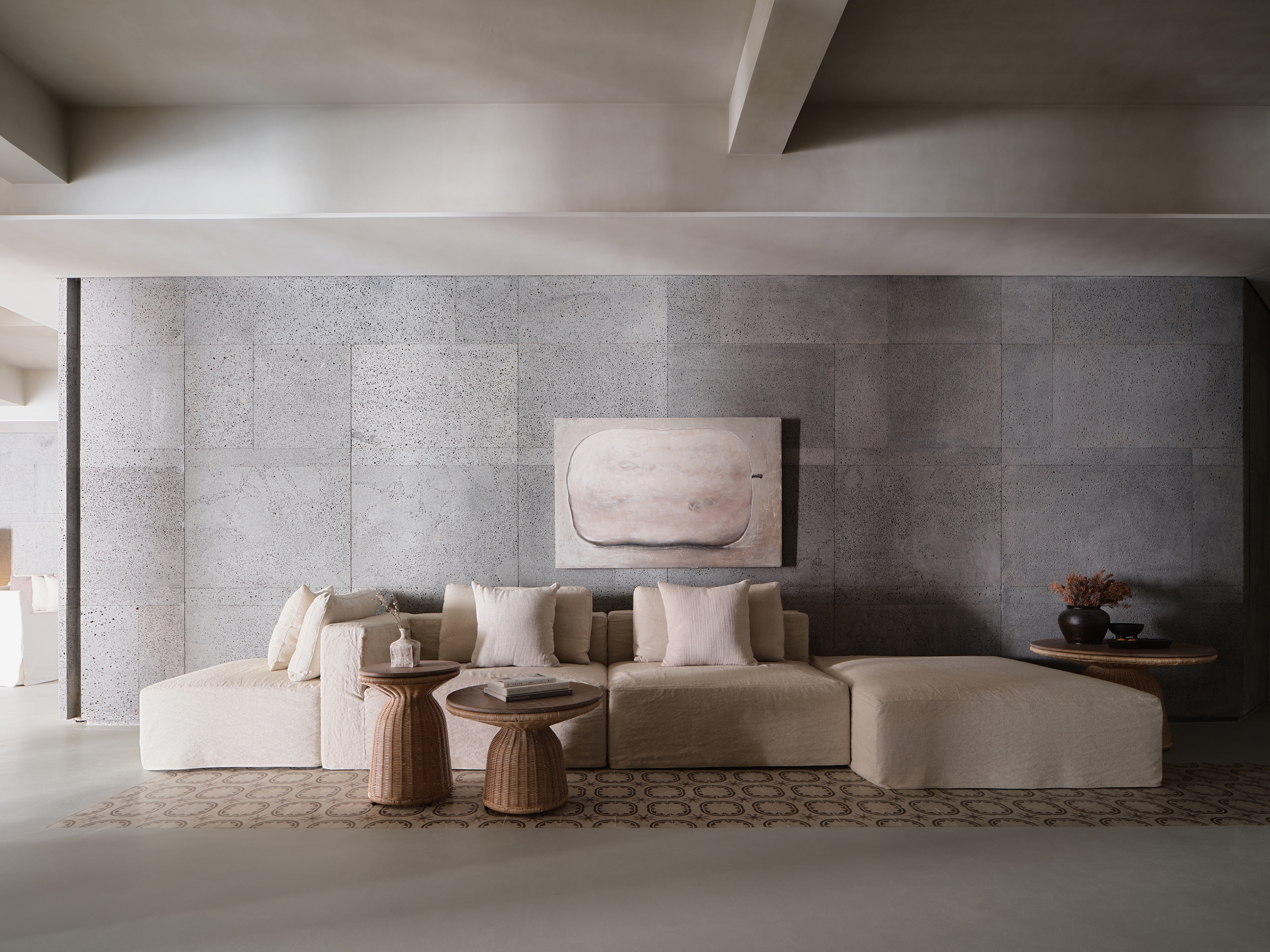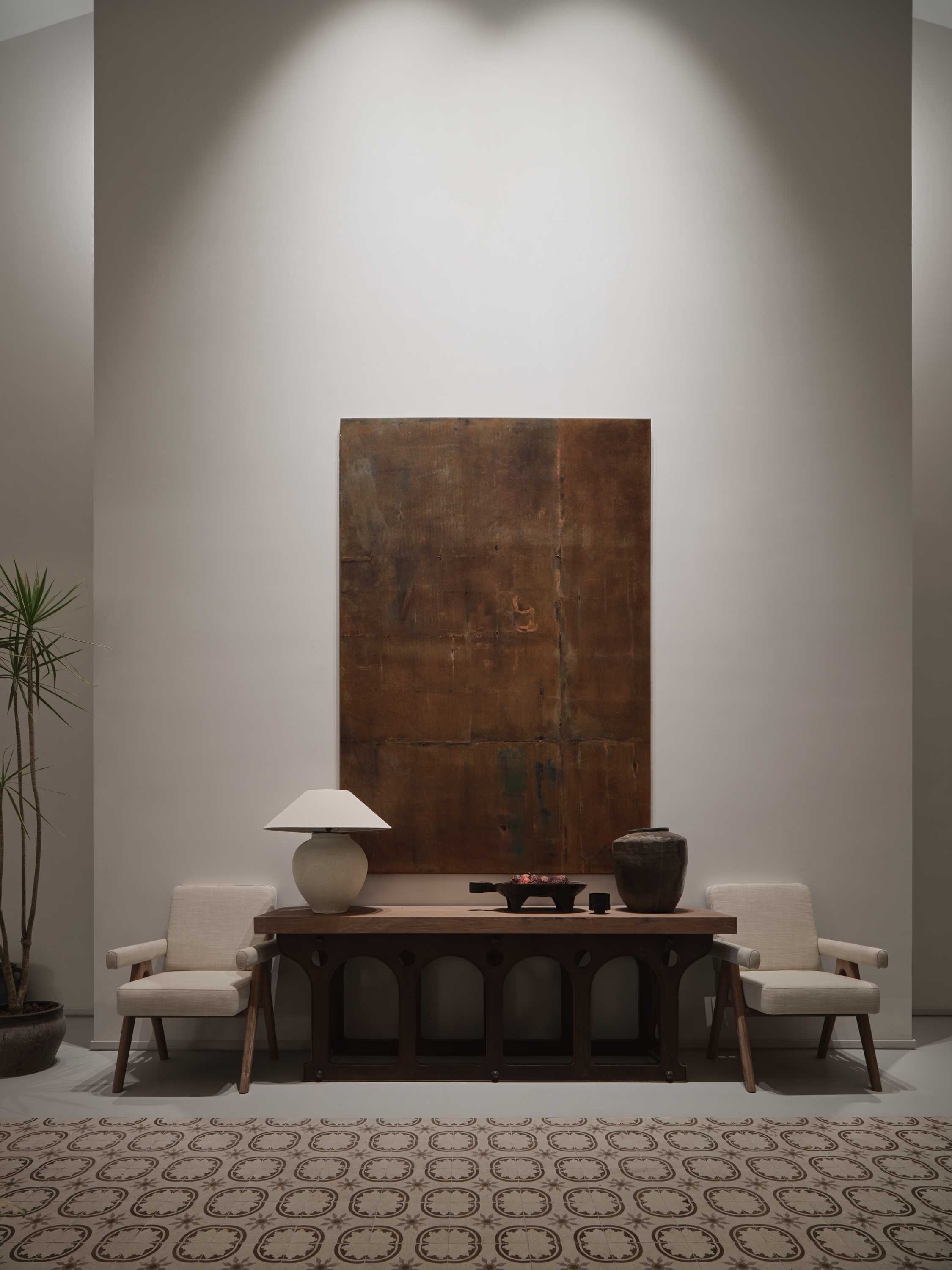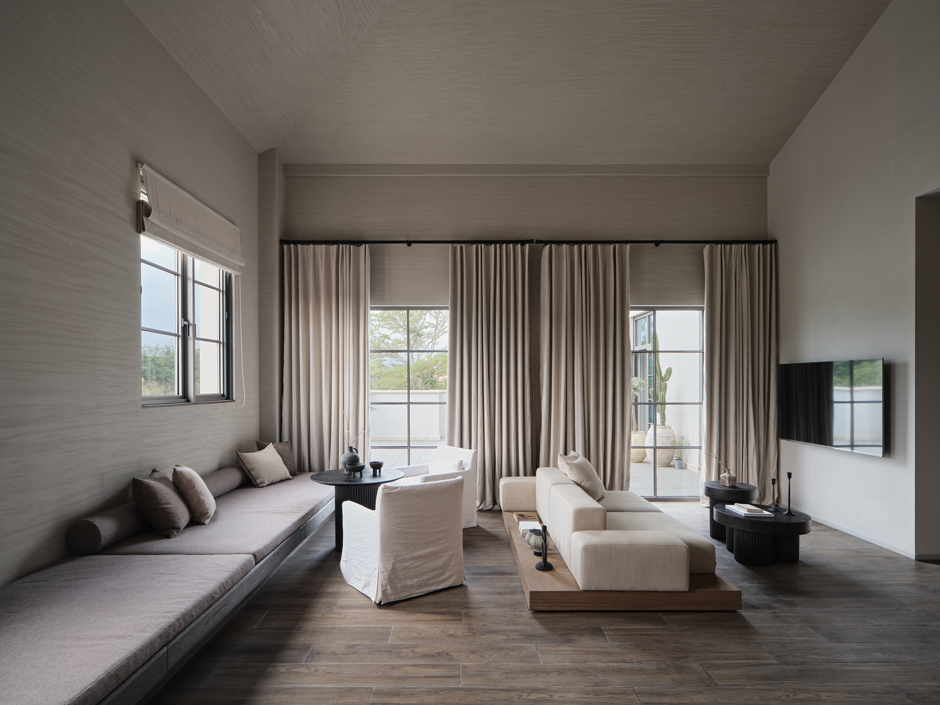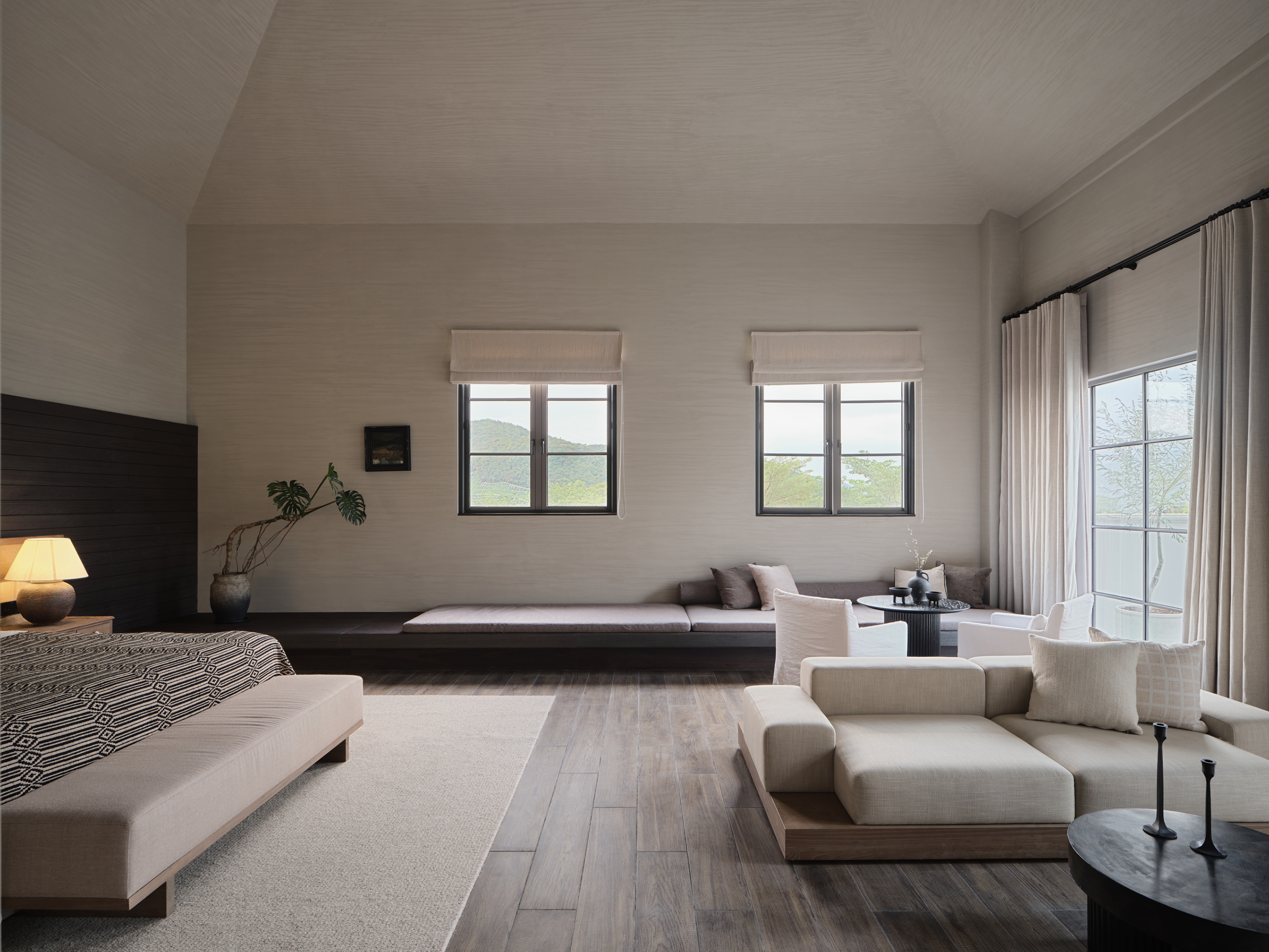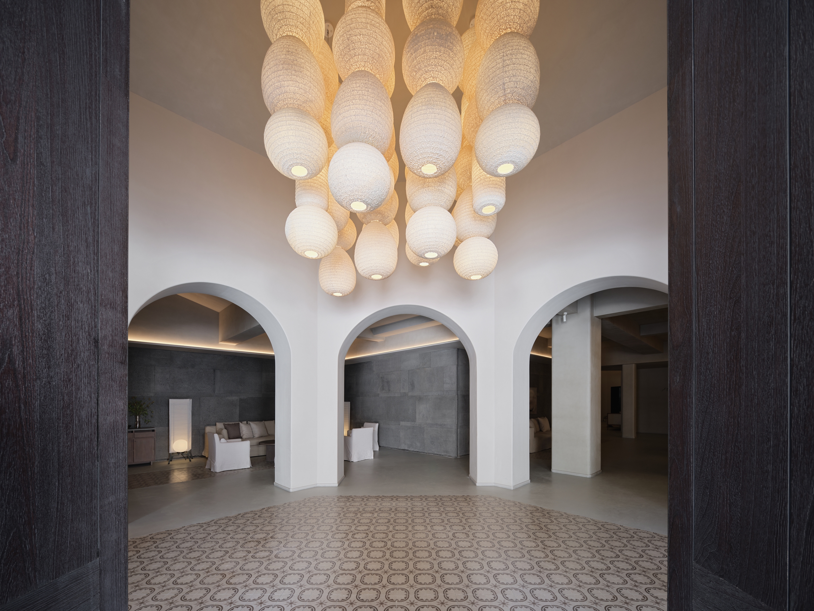 The ARANYA CLUB hotel is located in SANYA, China, it has 10 guest rooms with broad and diverse landscape views. Outside is the lively main street, and downstairs are cozy cafes and bars. White walls, old wood, handmade red bricks, and clean cement floors form the main tone of the space. Traditional architectural elements such as arches, concrete columns and thick walls lend a sense of tranquility and seclusion, resulting in a space that is both cathartic and satisfying. The lighting fixtures arranged in a short array at the top of the hall have a strong sense of presence and become the identity of the space. The long cotton and linen sofa and single chair in the seating area create the first feeling of coming home for the guests.