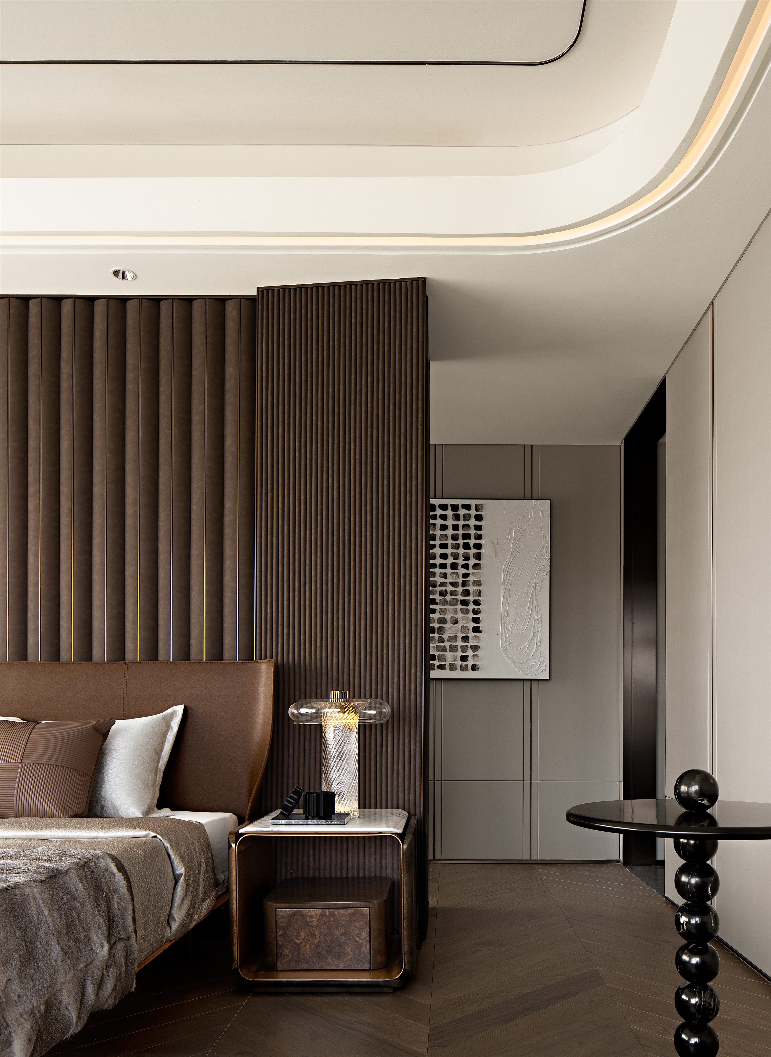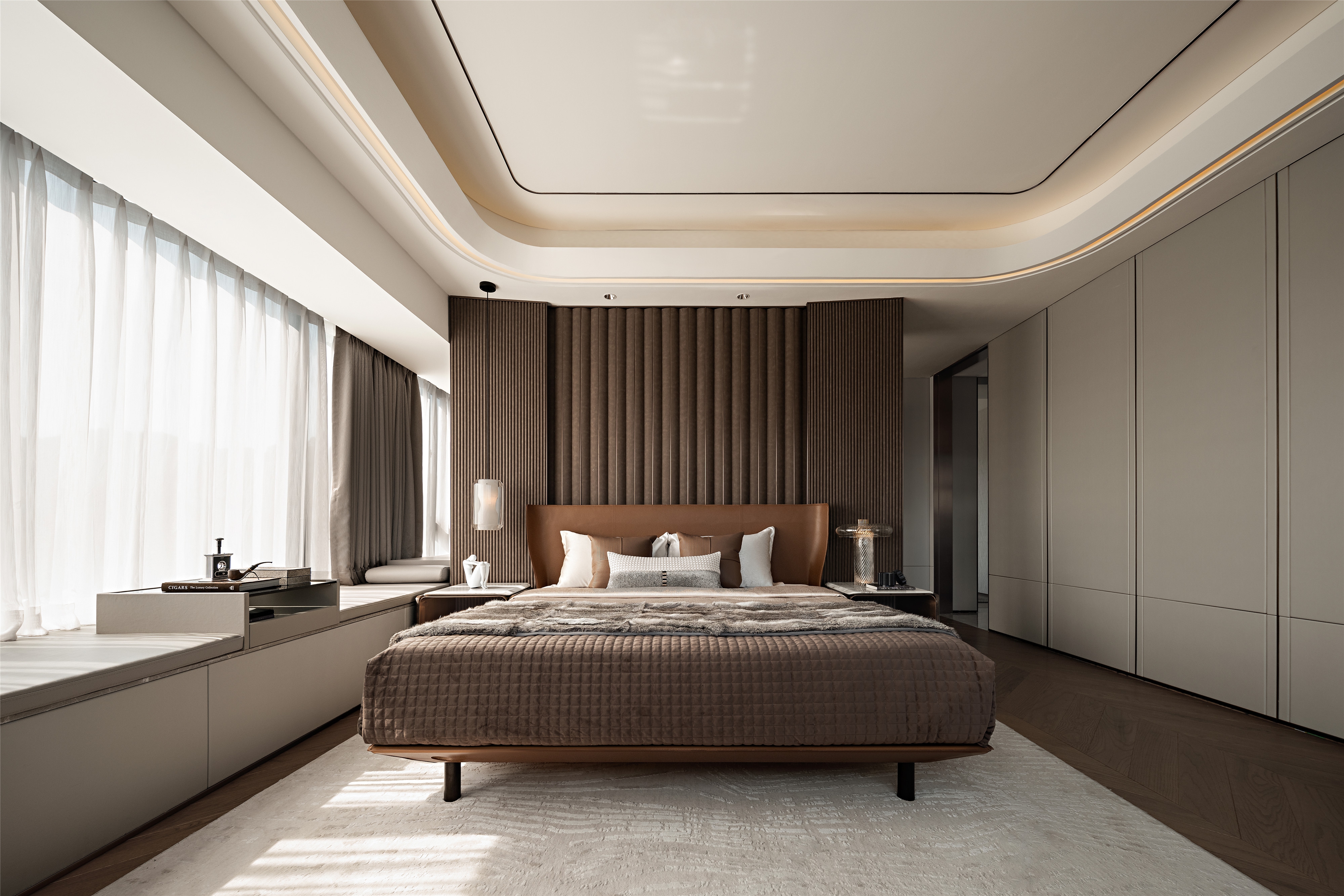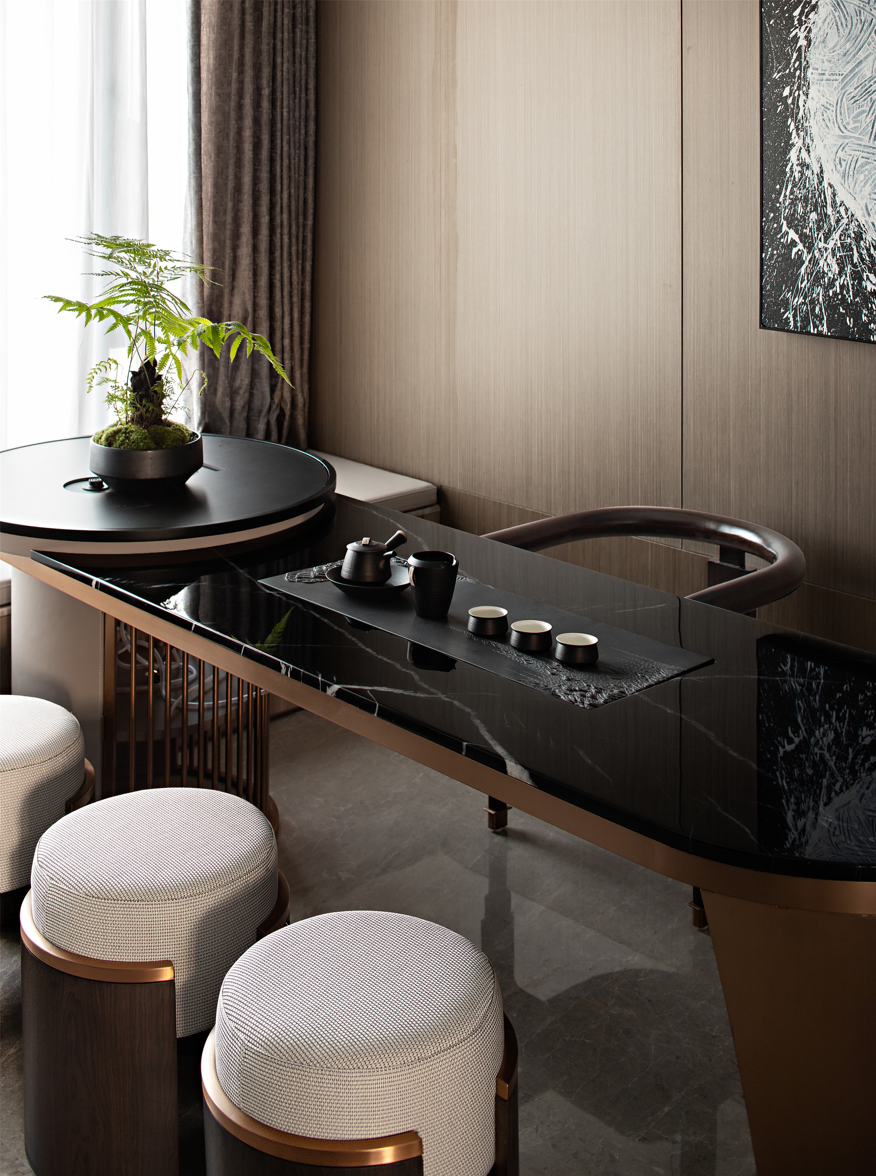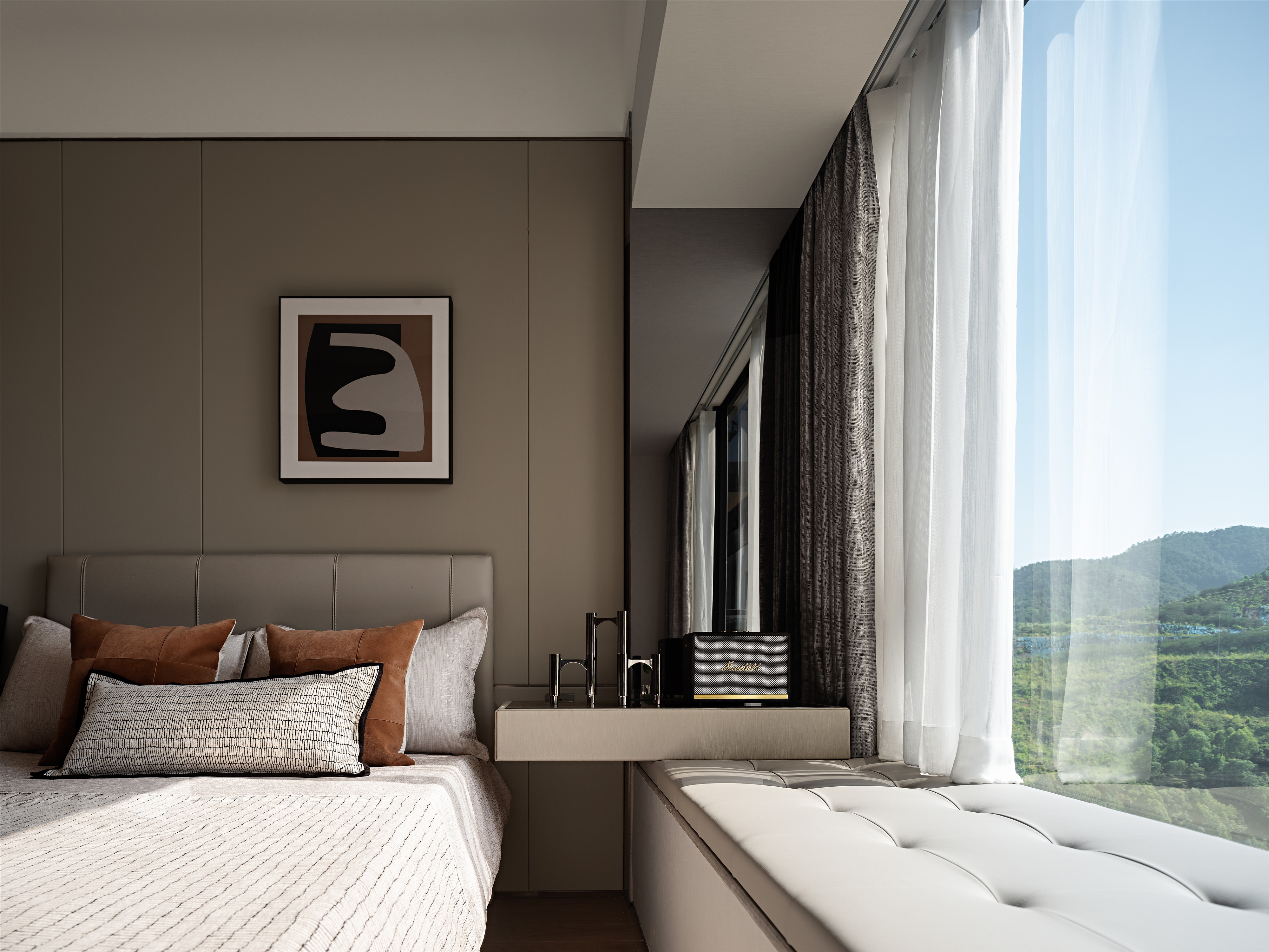 In the tea room, the natural stone echoes collections on the shelf. It’s elegant and serene, with fresh air by lush plants. The bedroom with a 270°viewing window and warm wood creates a cosy space. Thus, a warm home is created, giving residents a sense of value and belonging.