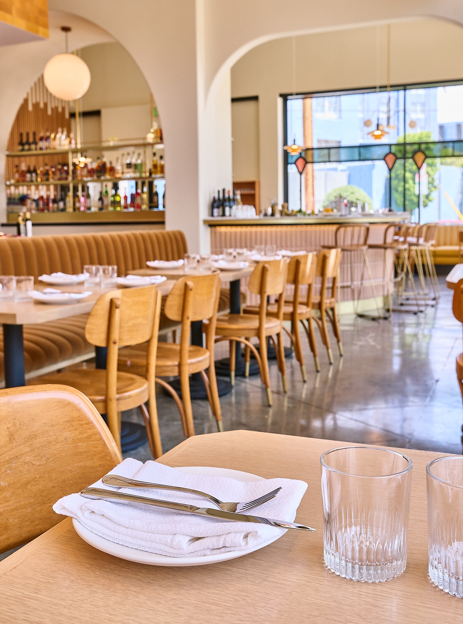 The kitchen stands out with vibrant colors, flames of the live fire and the bustle of the chefs preparing mouthwatering middle eastern delicacies. Pale pink hues, golden accents, light wood tones and art deco-stained glass fill the space with a lighthearted and inviting energy. Diners gaze directly into the expanded open kitchen where sparks fly from the live firewood grill and the energy of the chefs fills the air.