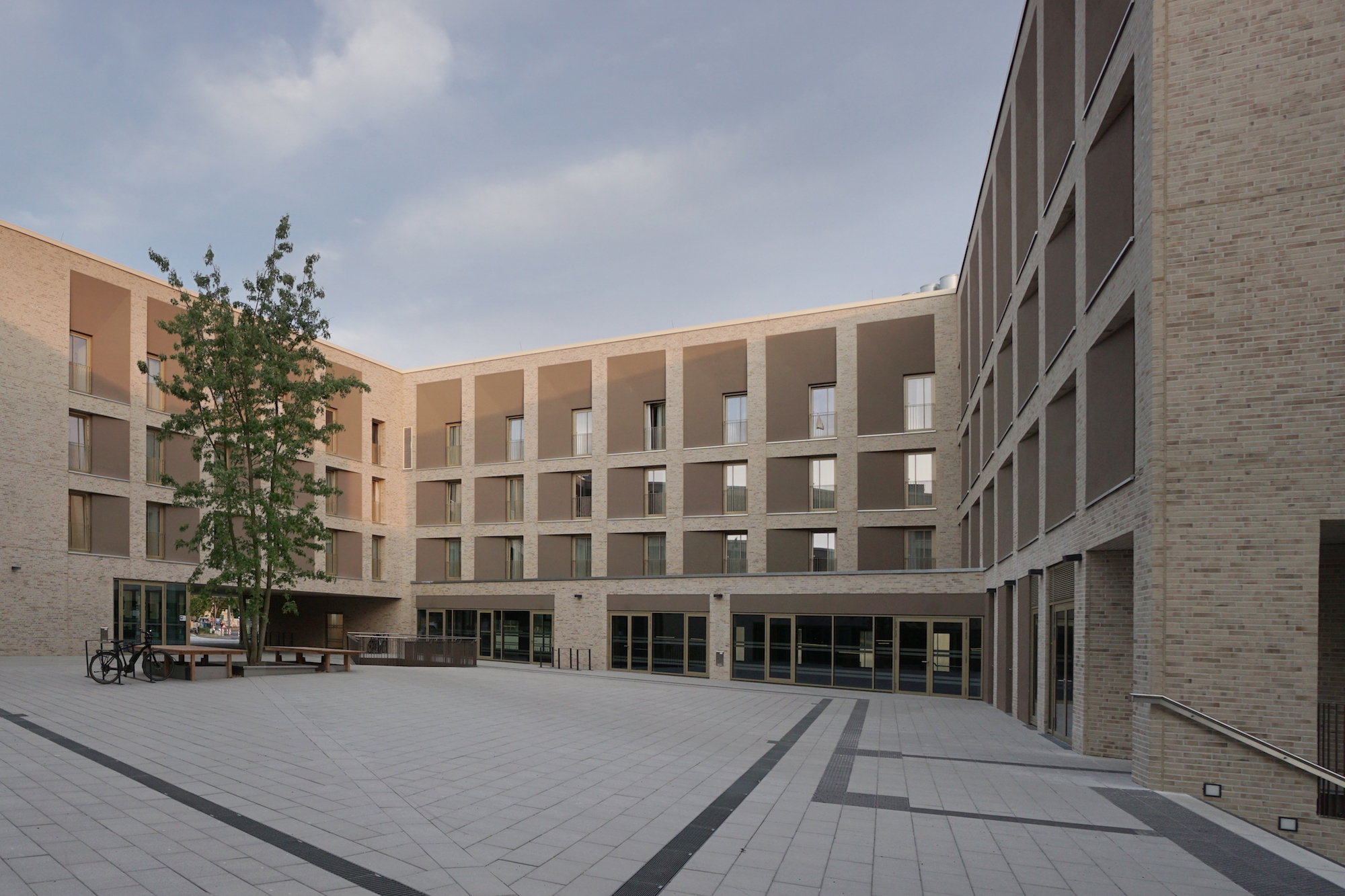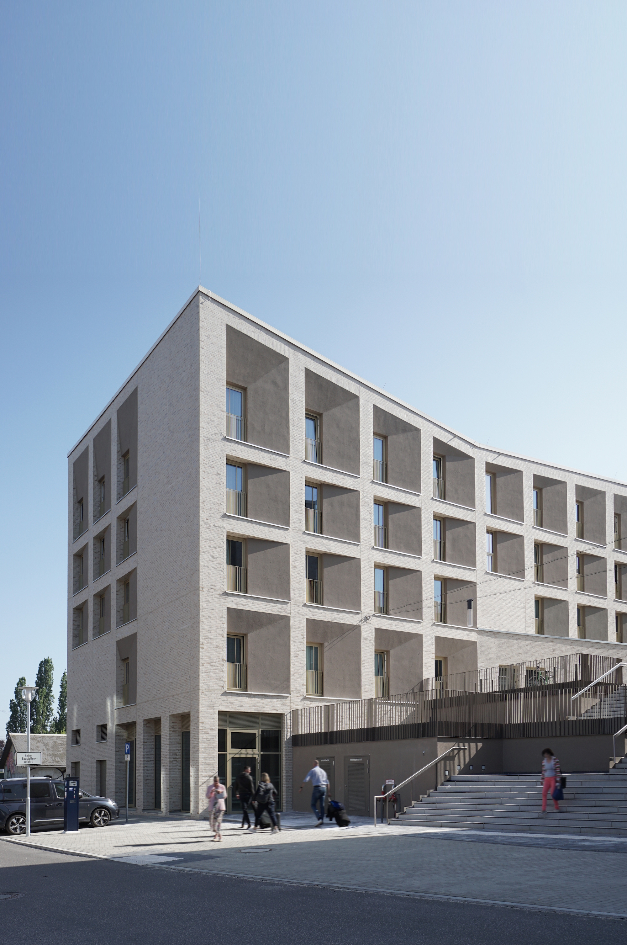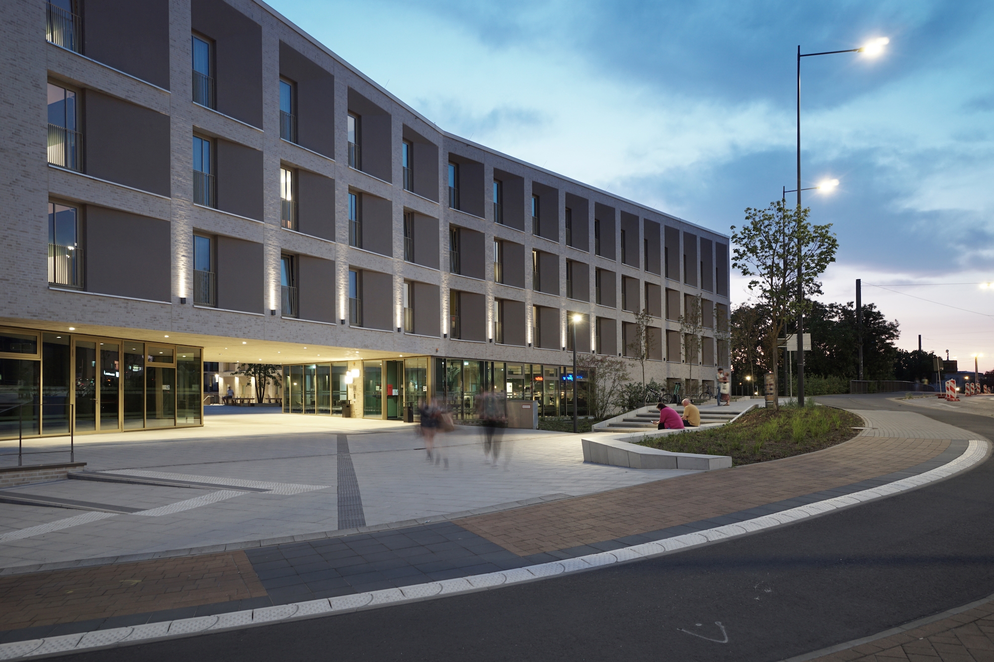 The core of the design task was to overcome the difference in height between the station forecourt and the adjacent Havel river within the building block. Through the public passage for pedestrians, the building ensemble with its central city square represents the pedestrian connection for all residents of the adjacent quarter to the main station. The 198 required rooms of the hotel are arranged in a ring around the central town square, where a maple tree has been planted to provide shade in summer. The Novum Group's "the niu Amity" hotel offer is complemented by a long-term residential complex "acora Potsdam Living the City", whose 72 flats are available to scientists from the nearby "Albert Einstein Science Park", among others.