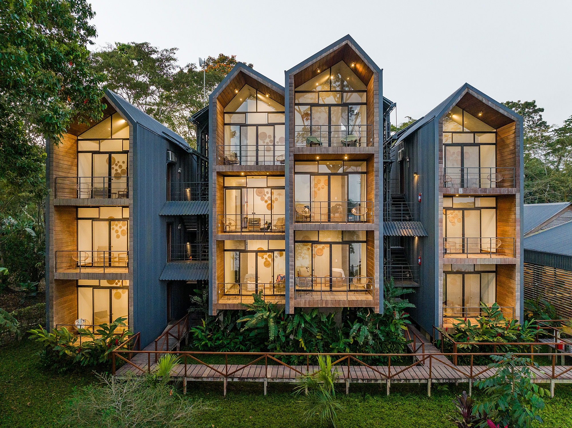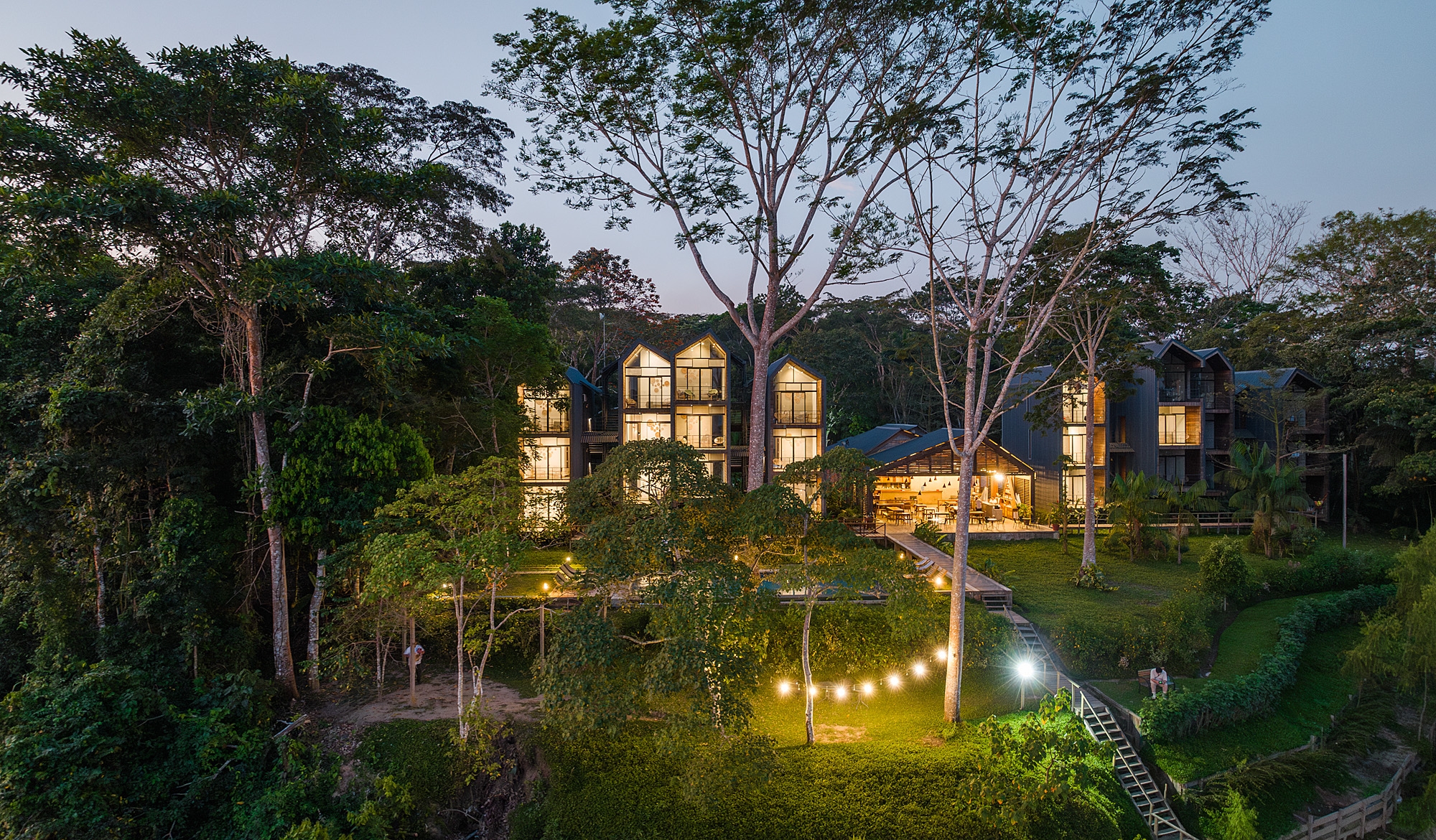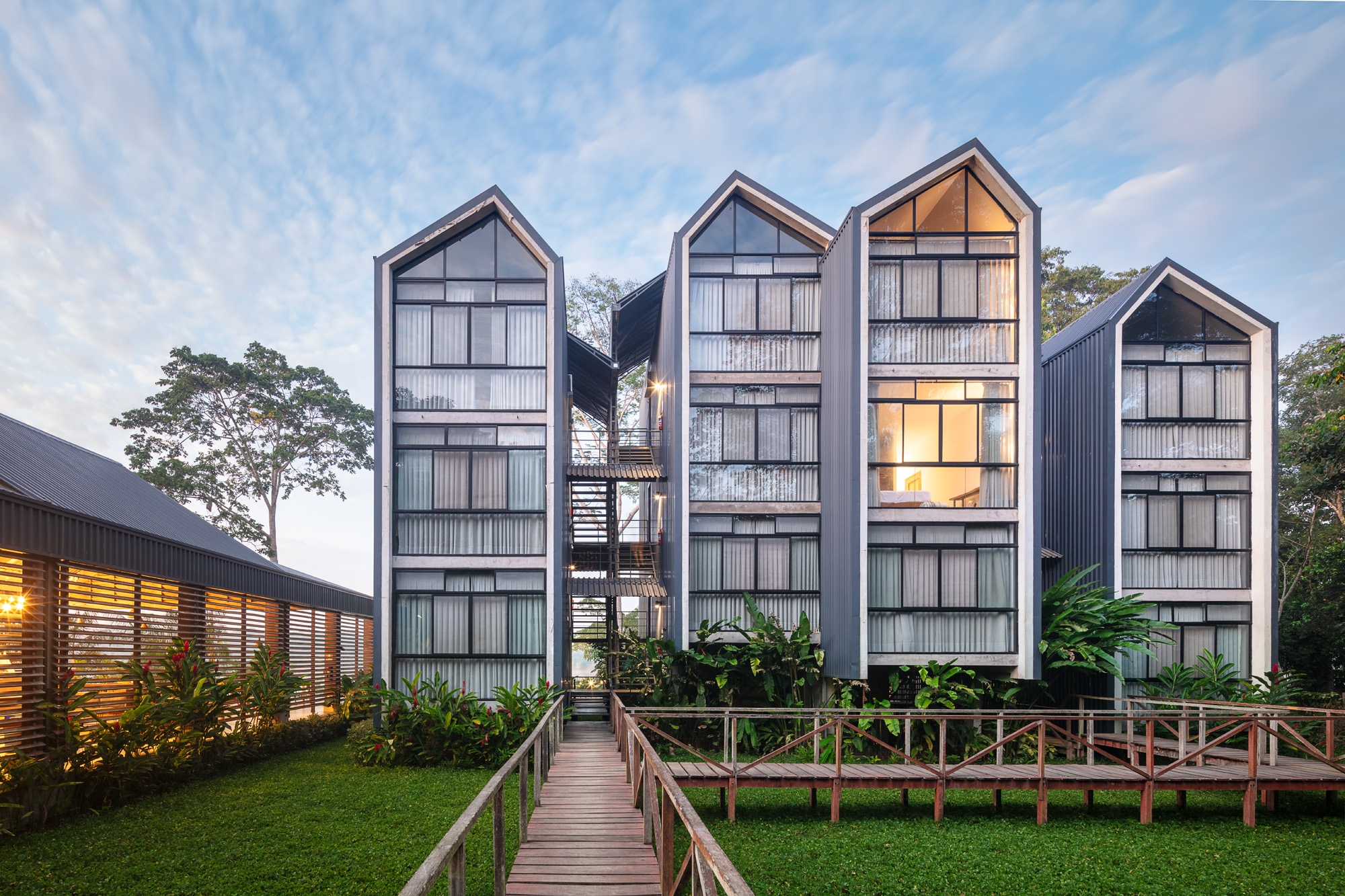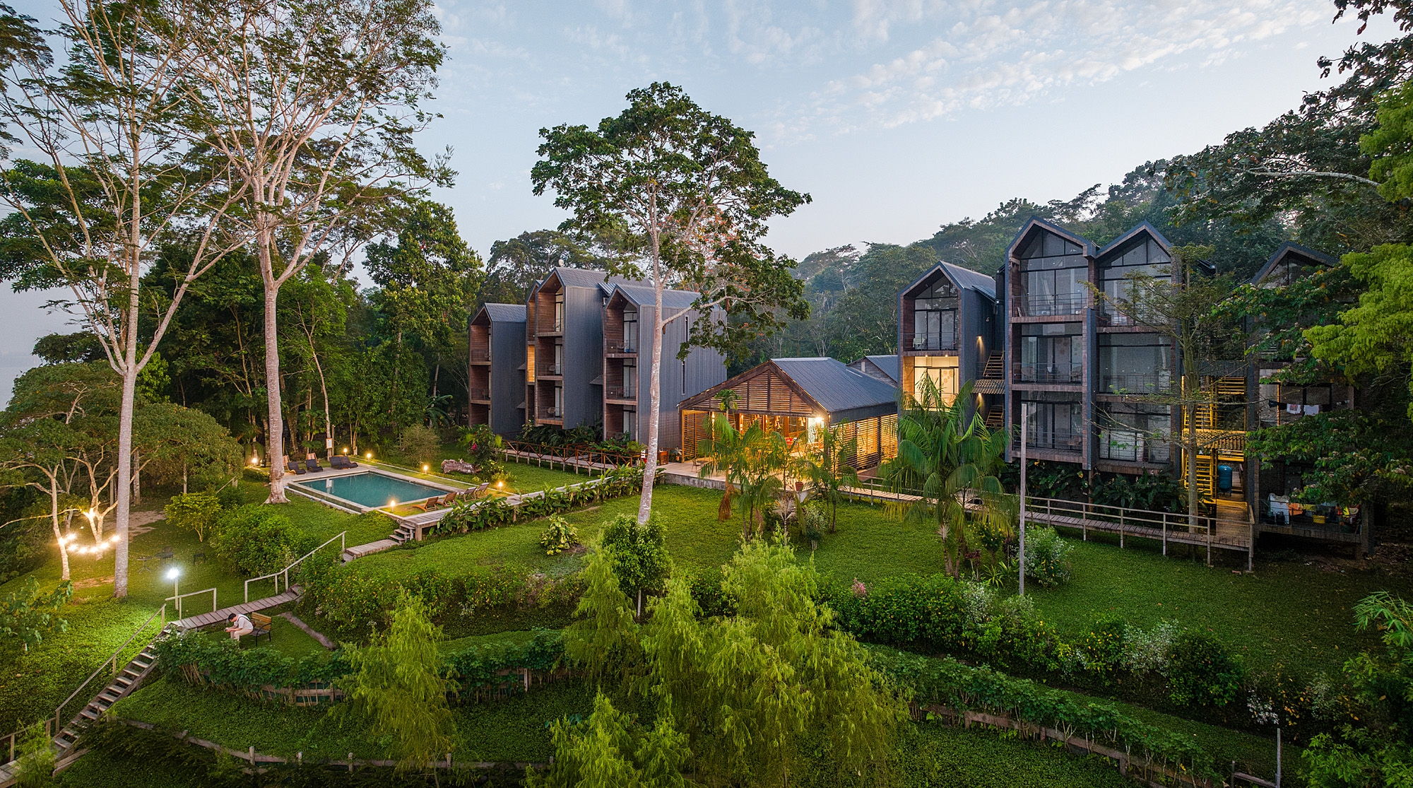 Named Enai, drawing inspiration from indigenous languages for water, earth, and forest, our design approach is deeply rooted in preserving local building traditions. Elevated structures, a hallmark of Amazonian architecture, are meticulously crafted to ensure optimal airflow and minimal impact on the natural terrain. Through the thoughtful use of natural materials such as rich, indigenous woods, we seamlessly blend the hotel's structures with their surrounding environment. The material palette, carefully curated to marry vernacular elements with contemporary design, showcases the raw beauty of wood, the rugged elegance of exposed concrete, and the industrial charm of corrugated metal roofs.