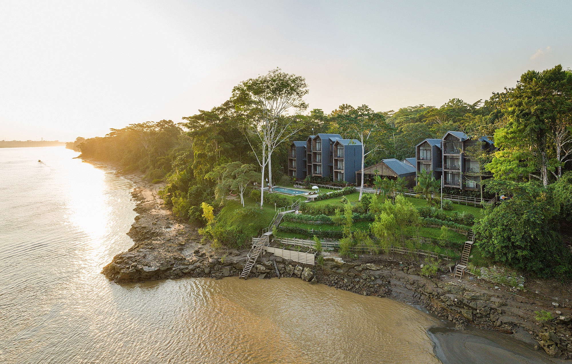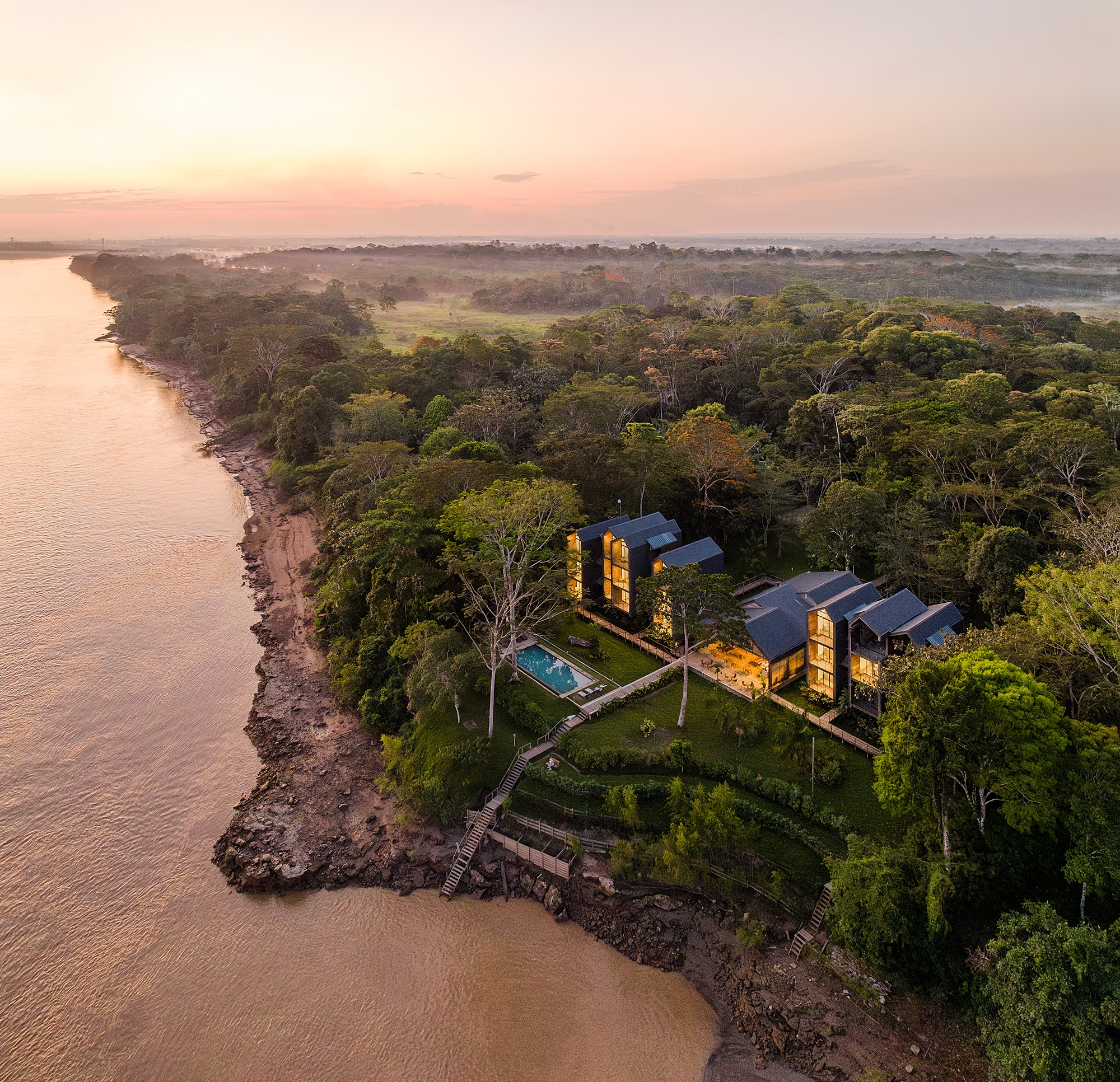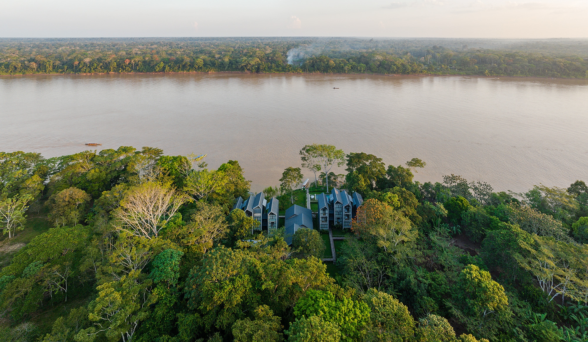 Hotel Enai, an exclusive Boutique Hotel nestled within the pristine Tambopata Natural Reserve along the picturesque Madre de Dios River in Peru. Immersed in the breathtaking beauty of the lush Amazonian surroundings, where the architecture delicately frames the stunning views of the winding river and verdant rainforest.