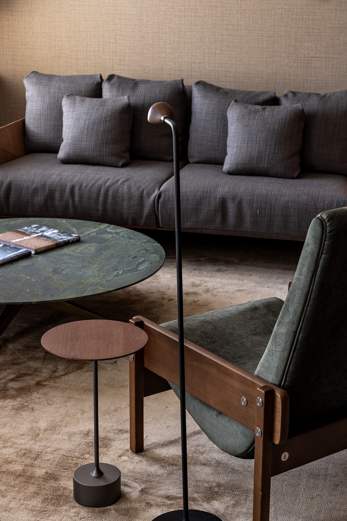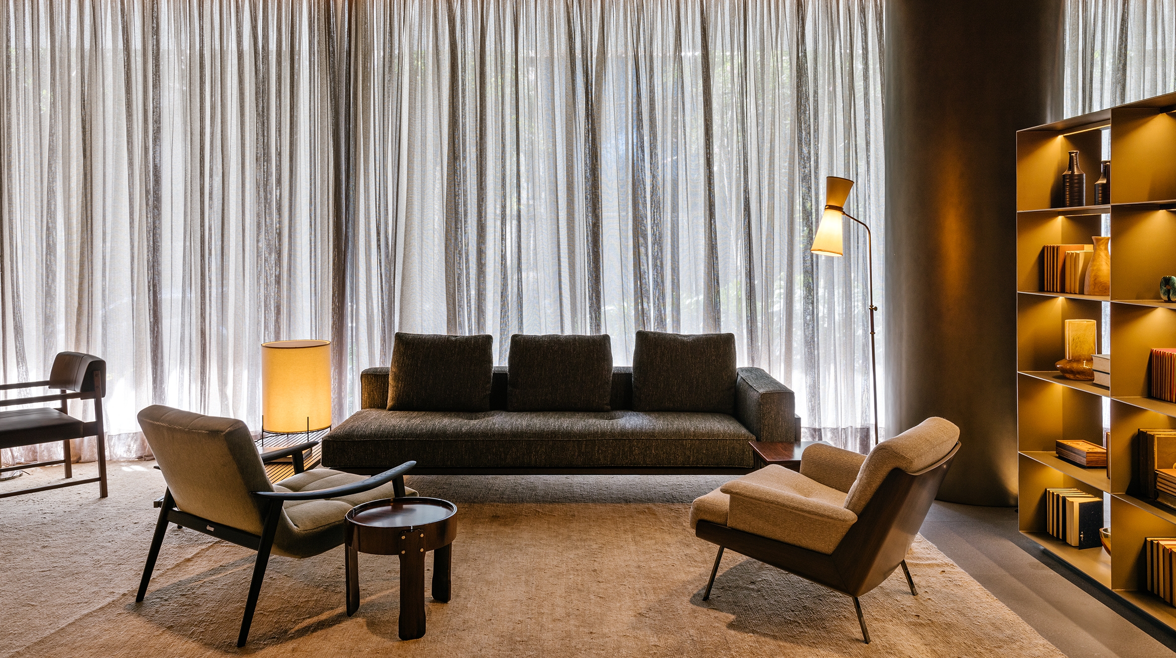 Important mid-century pieces are balanced with contemporary designs by Minotti, the most famous furniture factory from the heart of Italian tradition, including some design collections by Studio MK27 such as Brasilia sofas, Super Quadra sideboards and the iconic Daiki armchair.