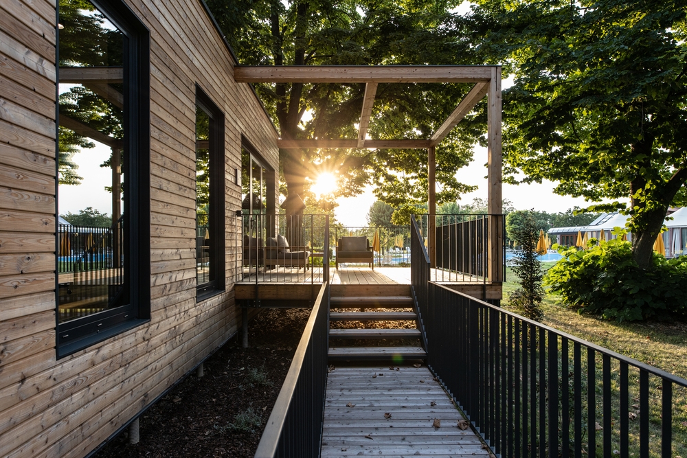 Preistoriche Green Lodge showcase 8 Lodges (fully-equipped Suites) built on low stilts immersed in the woods of Thermal Park. A dreamlike atmosphere is created by the innovative choice of sustainable design, the integration of an Indoor/Outdoor experience, and exceptional architectural qualities. The individual elements making up the complex are connected by suspended walkways, forming multiple contemplative paths through the greenery.