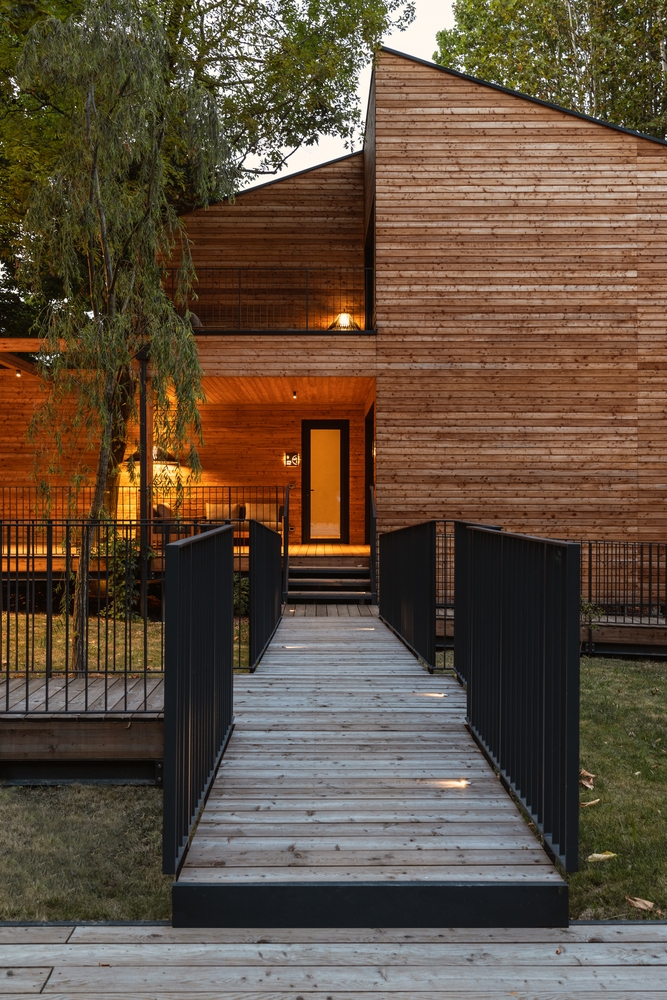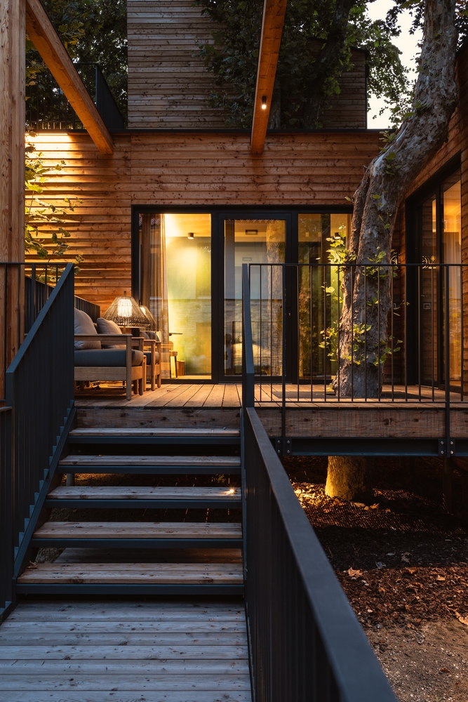 Trees are the true protagonists of the project and, as well as being a conceptual motif, they feature within the individual lodges. They create not only a visual integration with the surrounding environment but also an emotional and sensorial one.