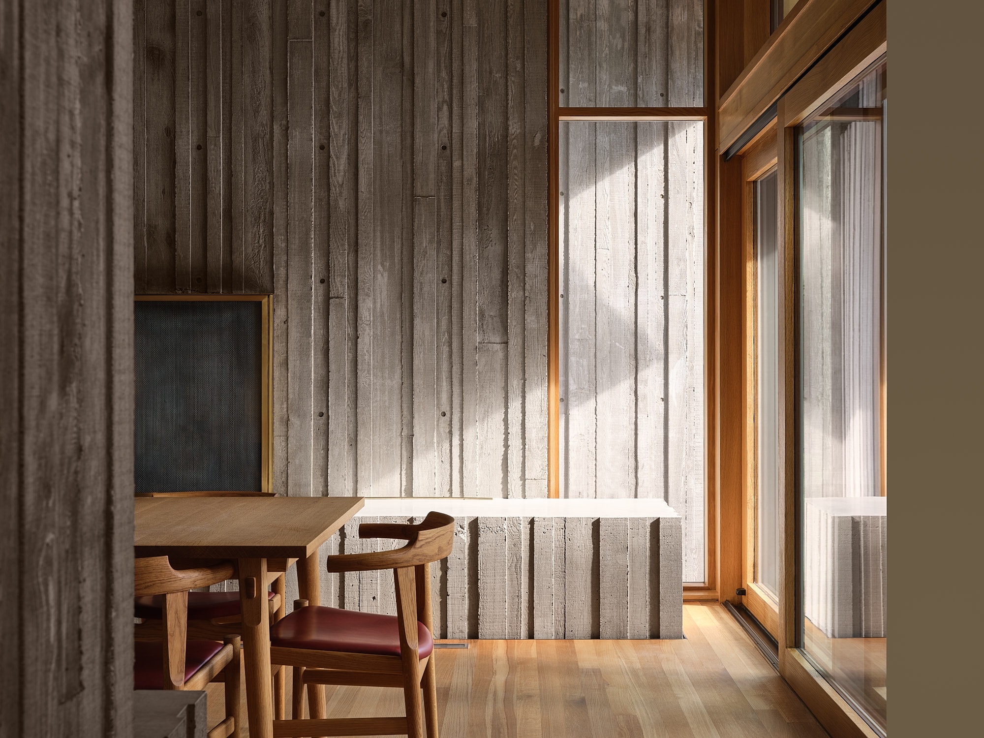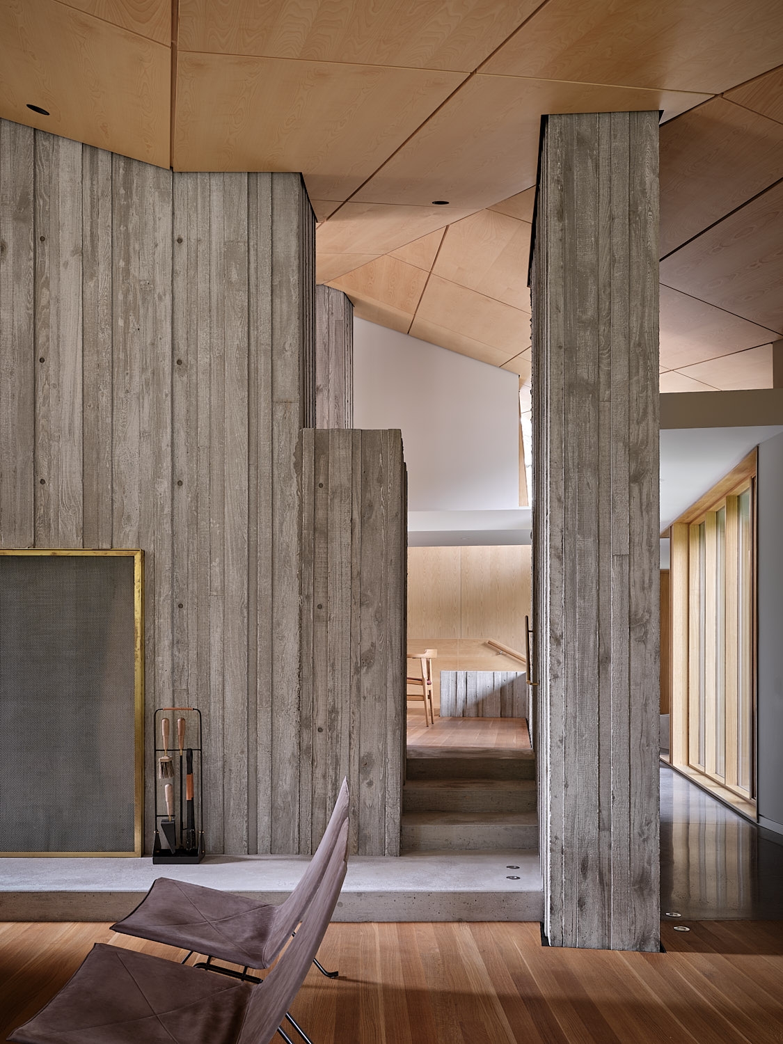 Deep-ridged cast-in-place concrete serves as both structural support and the finished texture within. Concrete walls travel seamlessly from the exterior into the heart of the home, which wraps around back-to-back fireplaces like a gathering place in a clearing in the forest.
