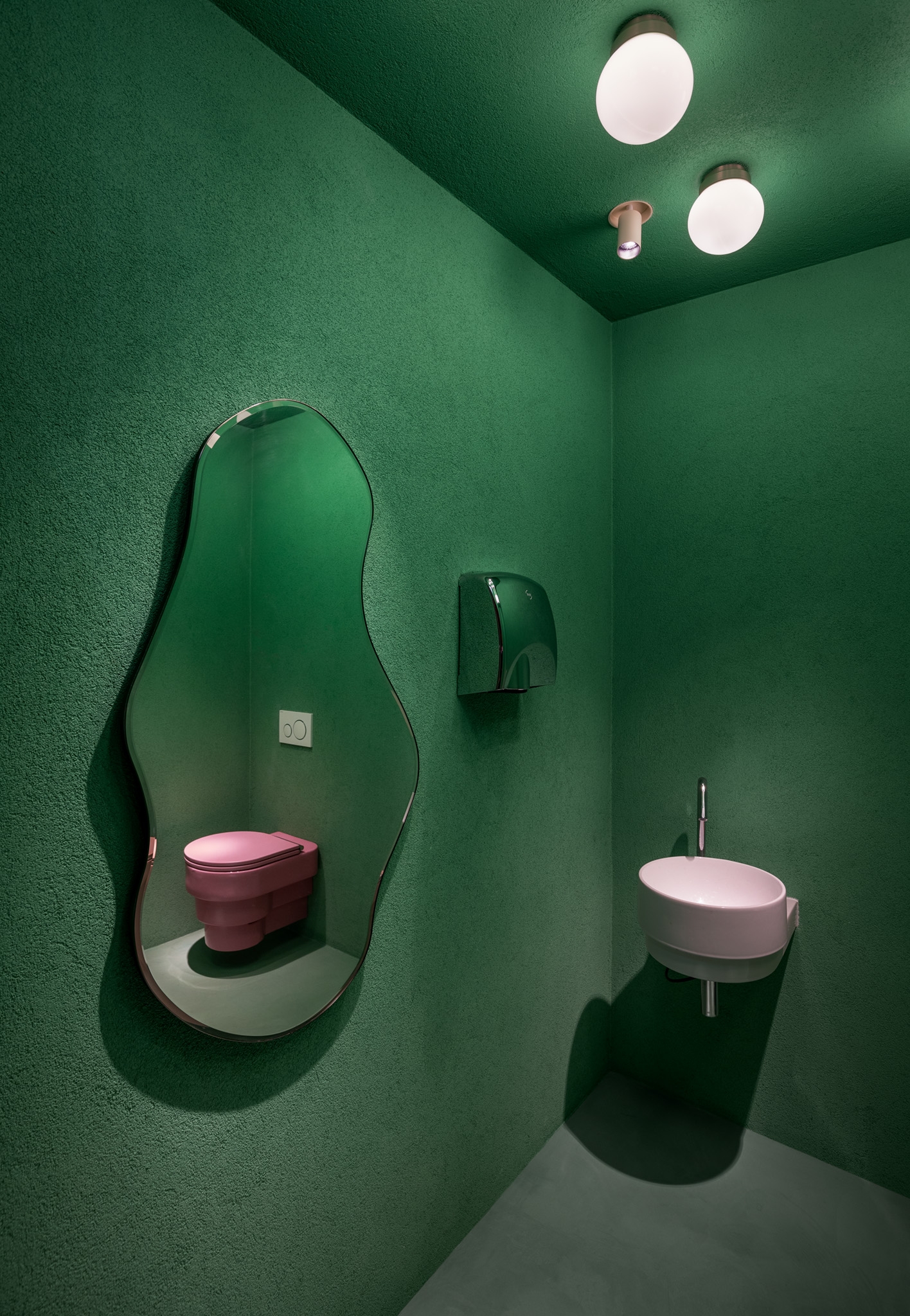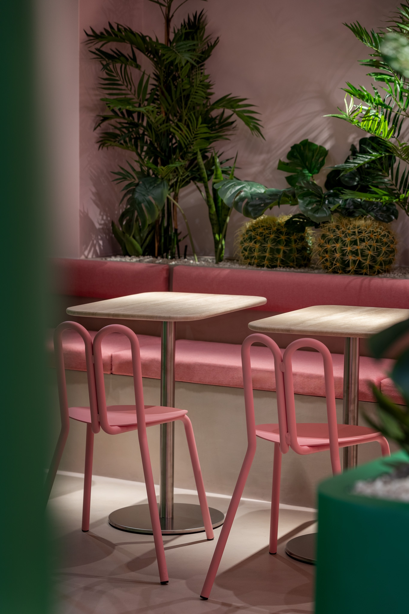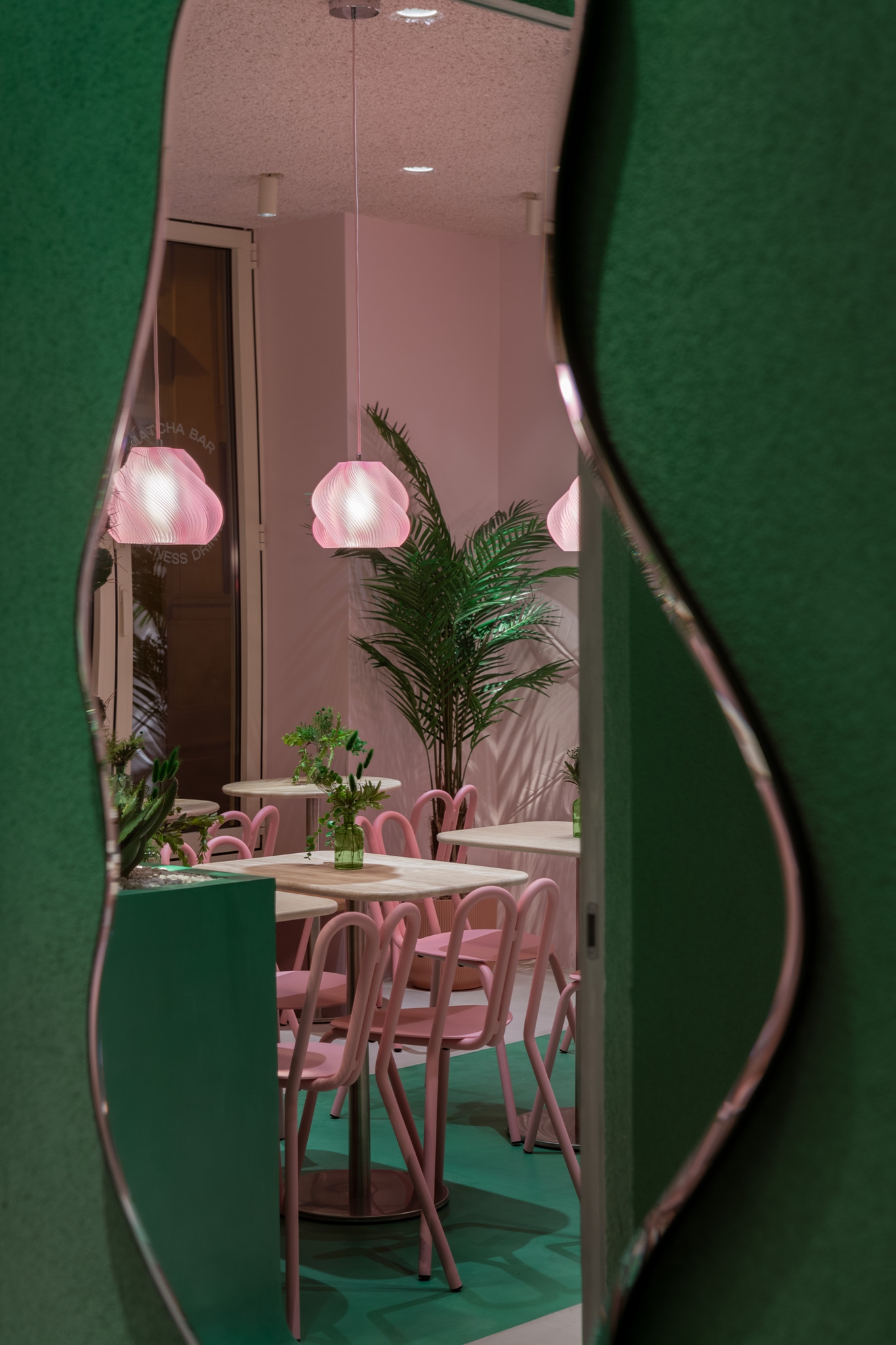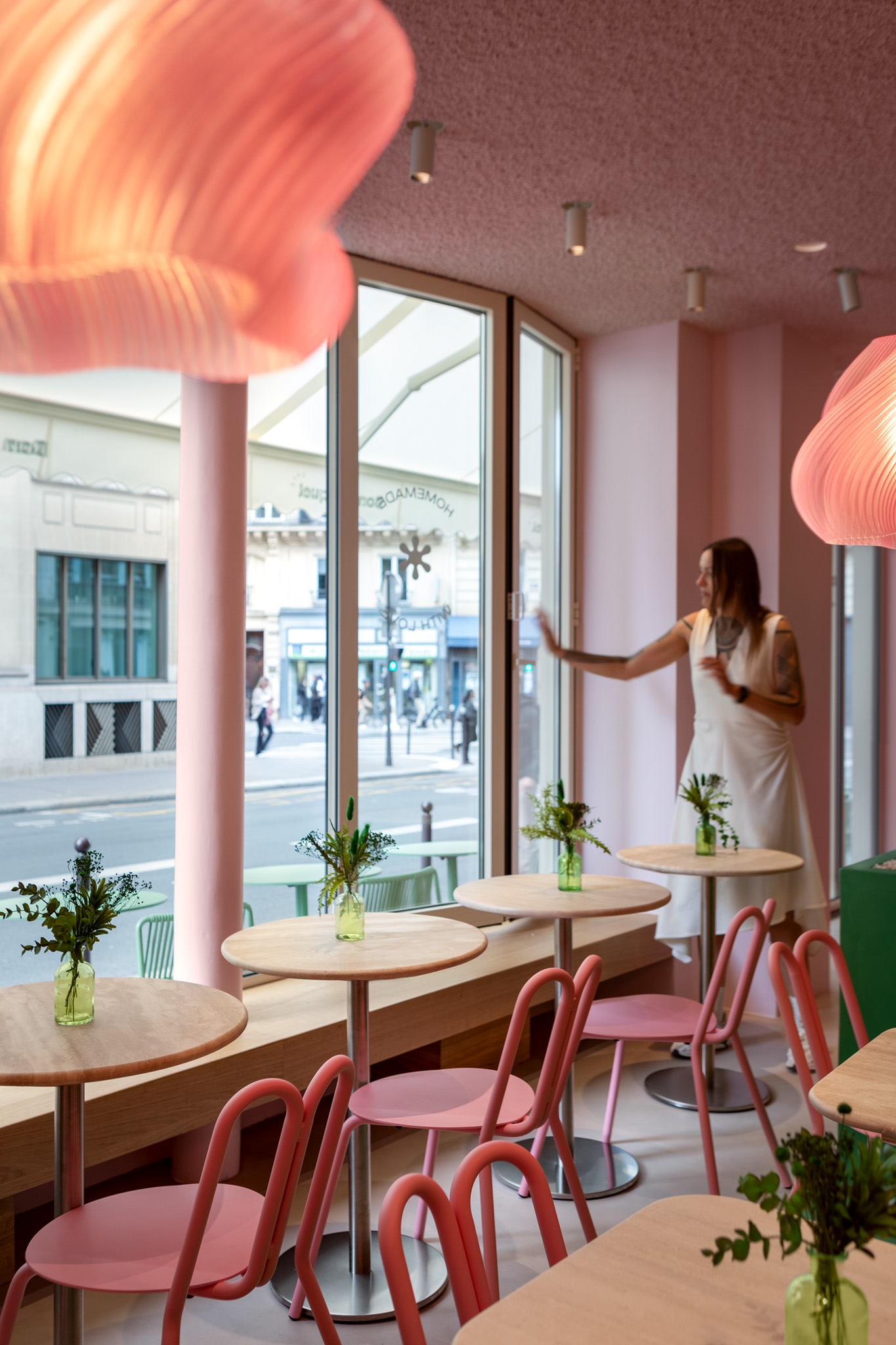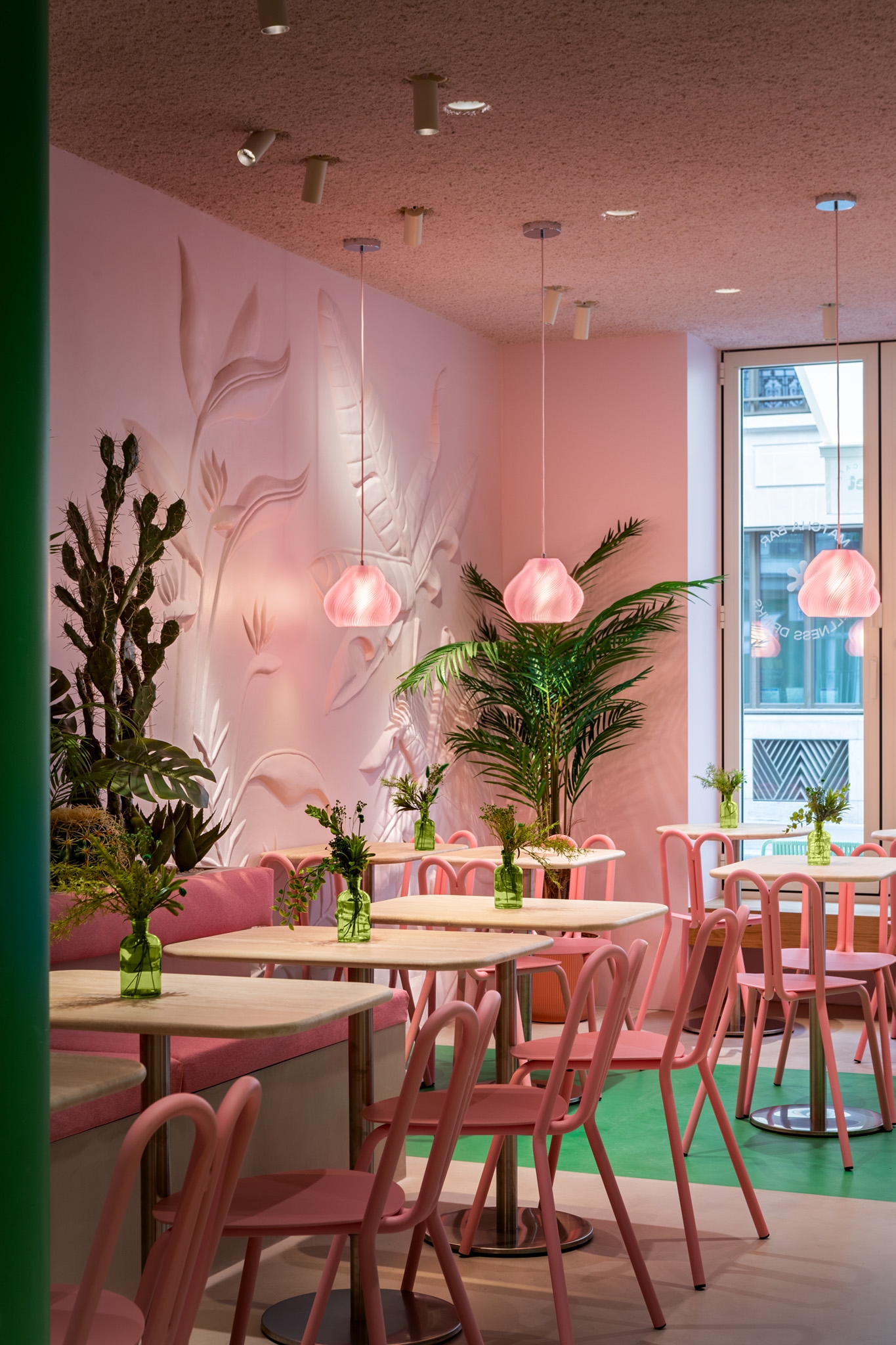 Even the restrooms reflect Bon Bouquet's bold design, each with its own distinct style—green with organic shapes and pink with contrasting fixtures. Bon Bouquet offers Parisians a fresh, Instagram-worthy experience, blending tranquility with excitement in the city's café scene.