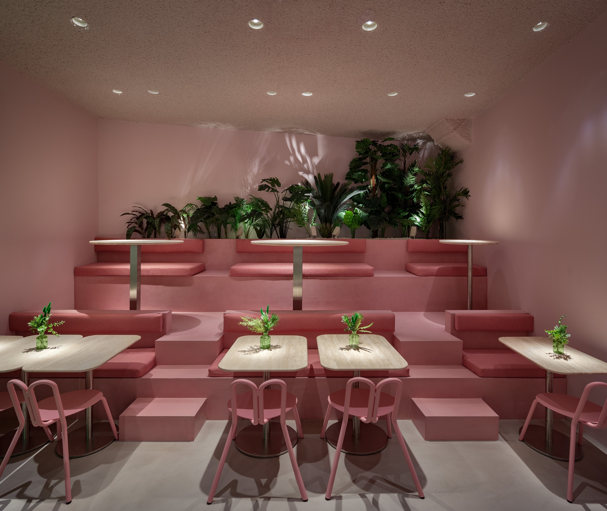 Microcement flooring, lush greenery, and a unique daylight-free zone with an amphitheater add to the café's dynamic feel. Expolight, a top Ukrainian lighting firm, ensured the lighting perfectly complements the vibrant decor, enhancing comfort and visual appeal.