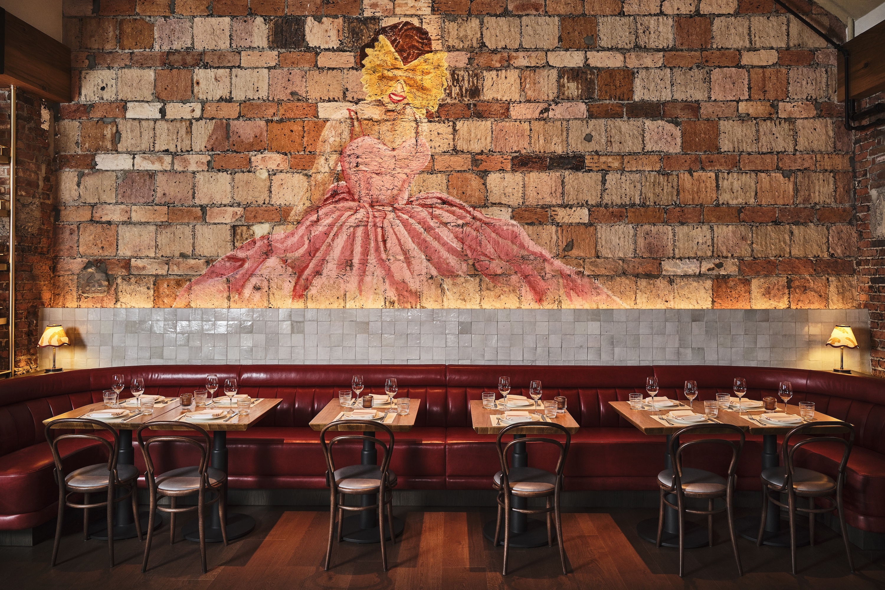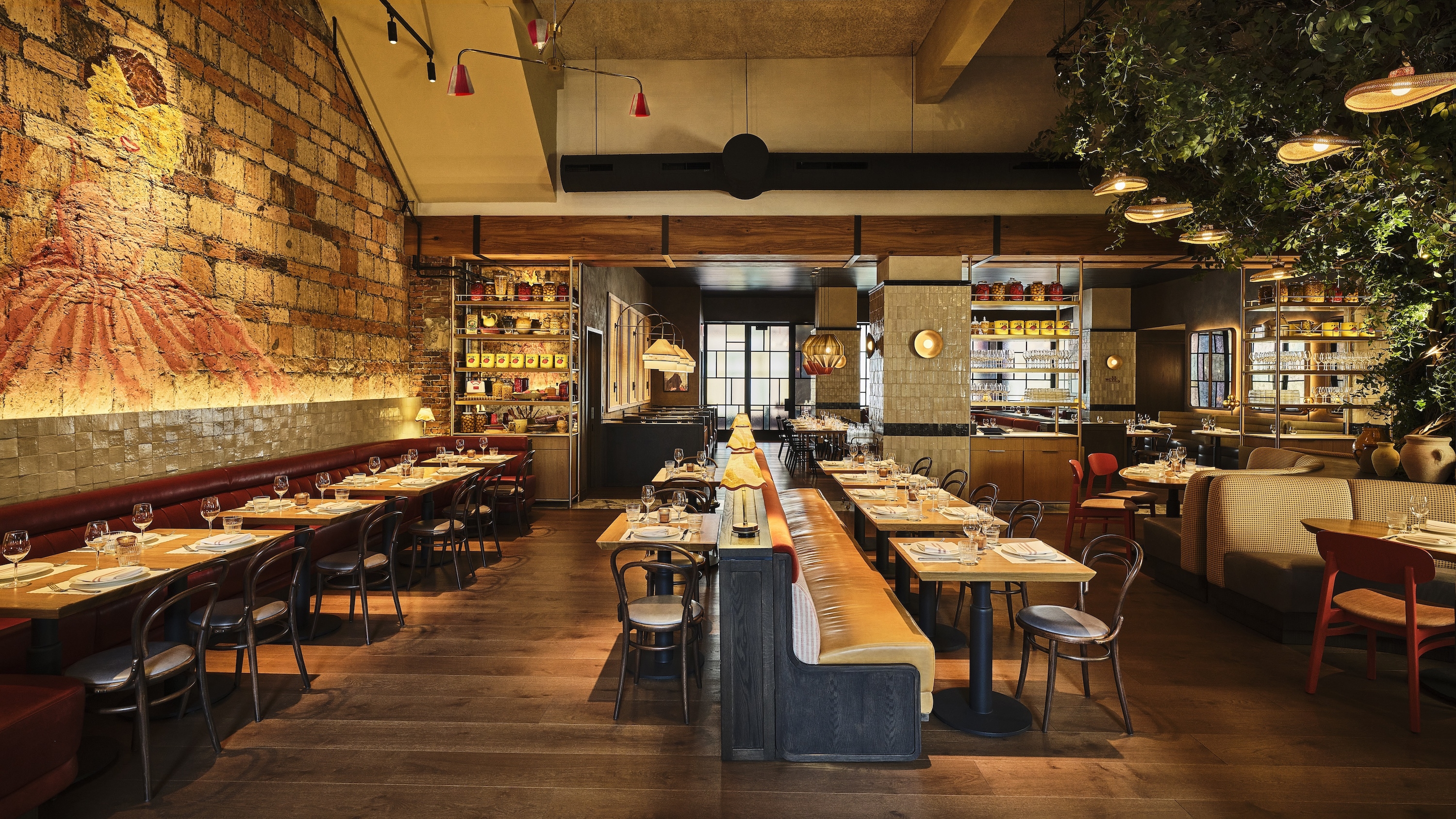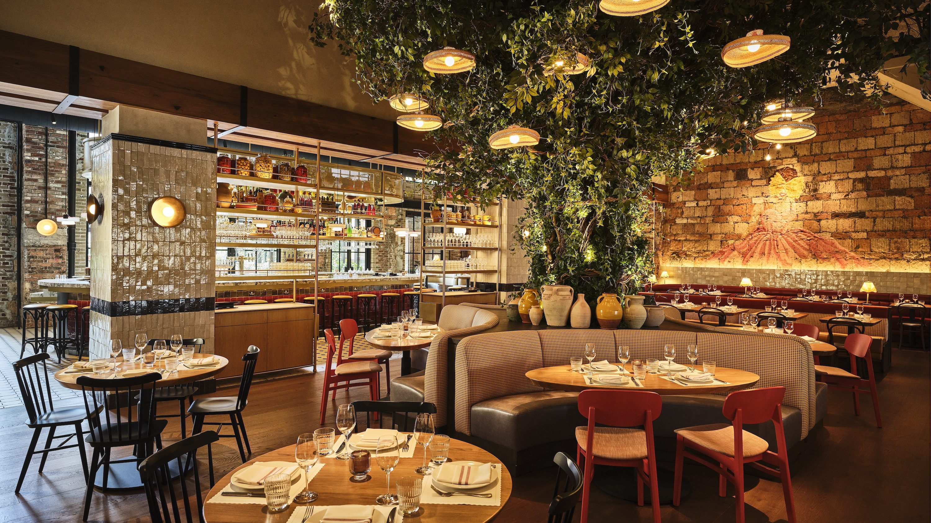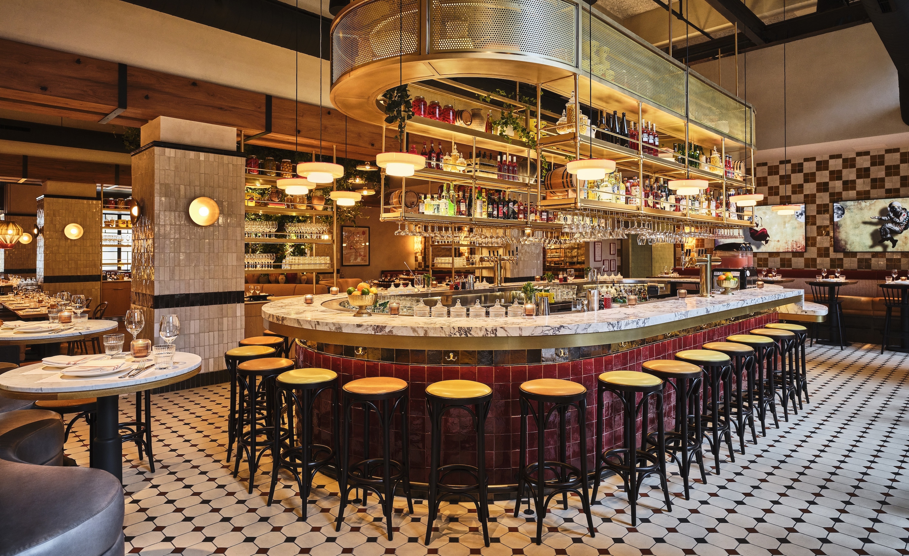The design features large steel windows and doors that highlight the building's industrial past and create a connection between the interior and exterior. The eye-catching pill-shaped bar, adorned with Calacatta Viola marble and handmade glazed tiles, sets a vibrant tone upon entry. Artwork inspired by the restaurant's character adds playful accents throughout. A private dining room, enclosed by steel and glass panels, offers an intimate atmosphere, complete with graphic wallcovering and artwork. Moving through the space, an outdoor seating area features lush greenery, a marble bar, and a pergola, providing an extension of the interior’s charm. When dining at Bar Primi Penn District, guests should leave uplifted by the energy of their surroundings in a space that is unique to the neighborhood.