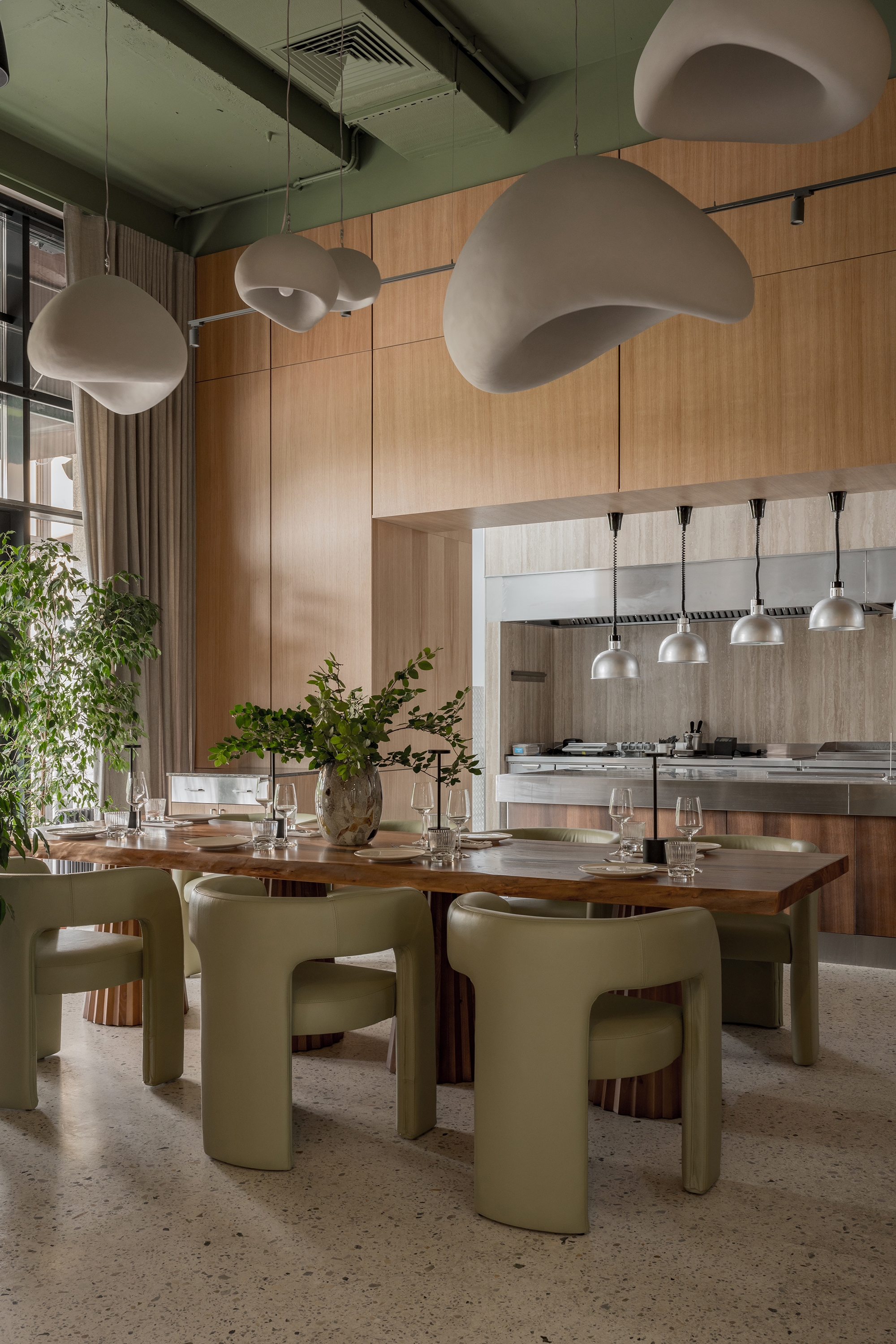 Forest is a restaurant of modern cuisine for every day. The philosophy of the interior is that nothing in the restaurant should distract from cuisine. The interior is made in a modern style and natural colors. The main finishing materials are wood, stone, metal and plaster. The cement-polymer floor is made using the natural terrazzo technique using local stones.The main decorative accent in the interior is a botanical bas-relief made by the Ural sculptor. The interior should be calm and stylish. The interior should not be bright. Natural motifs and materials should be present in the interior, because the name of the restaurant is "Forest".