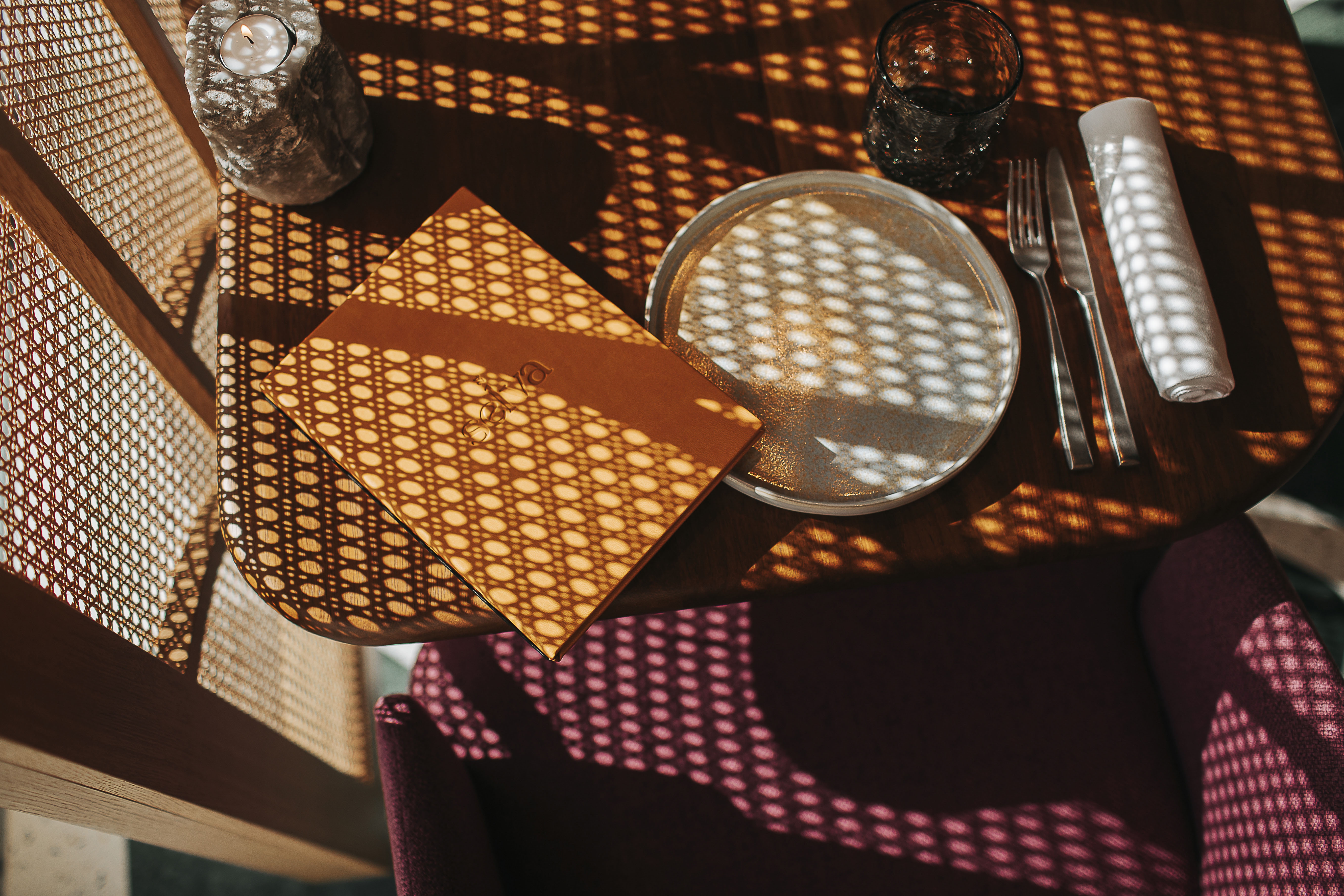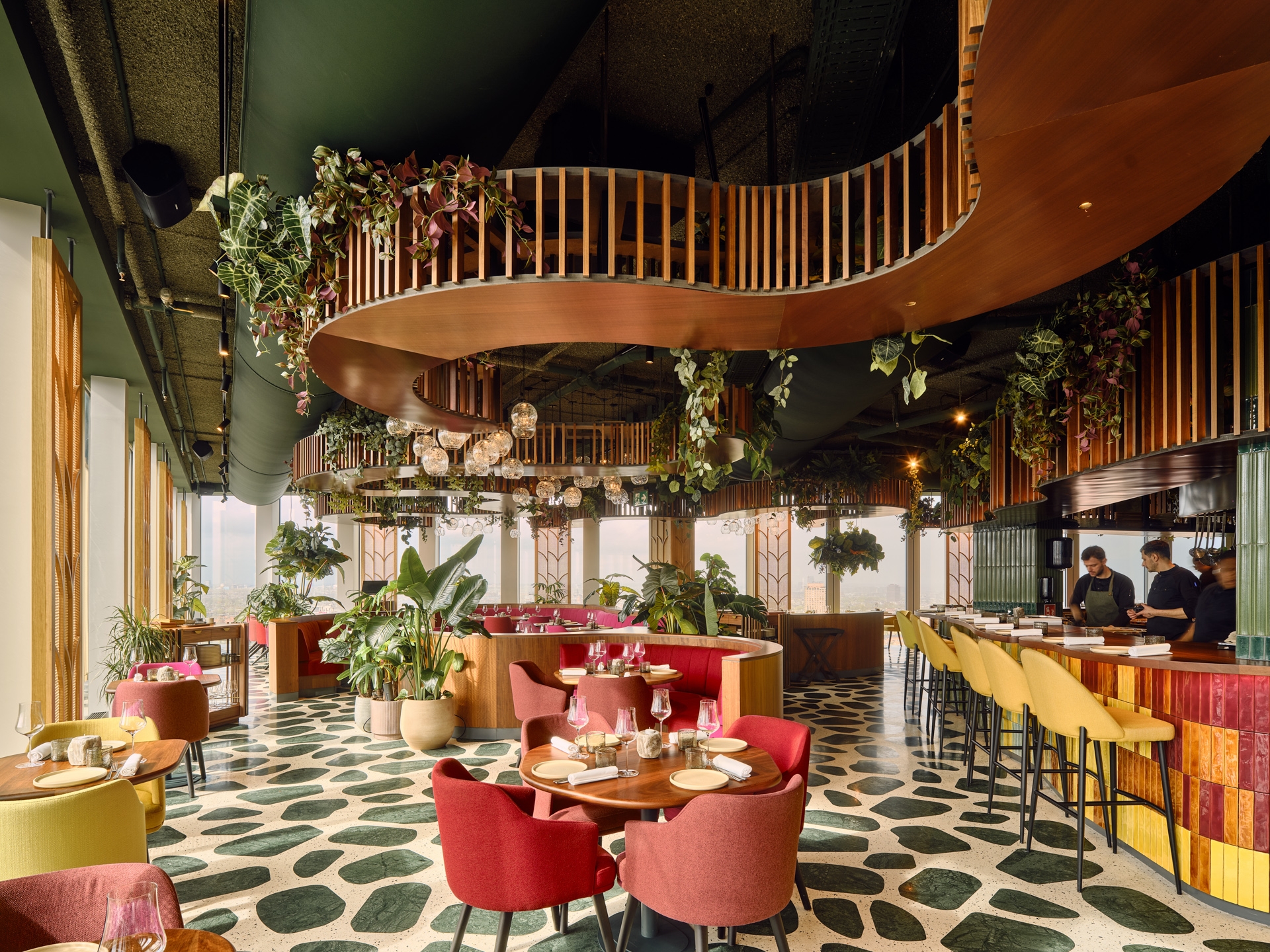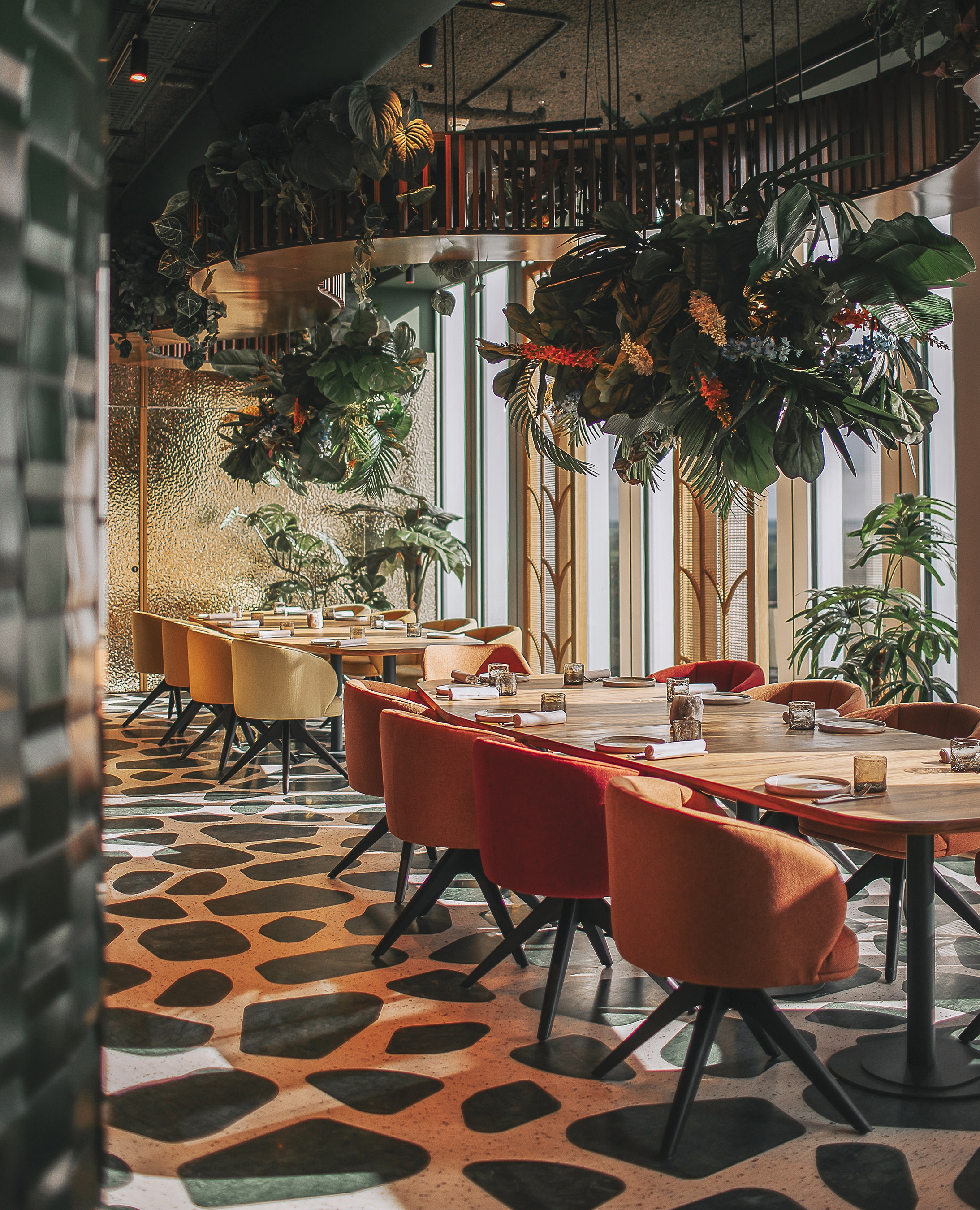 The space on the 24th floor of Nhow Amsterdam Hotel, designed by OMA architects, offers industrial, glass-enclosed views over Amsterdam’s outskirts. The restaurant’s Latin American cuisine and tropical influences aim to create a warm, jungle-inspired atmosphere that softens its initial hardness.