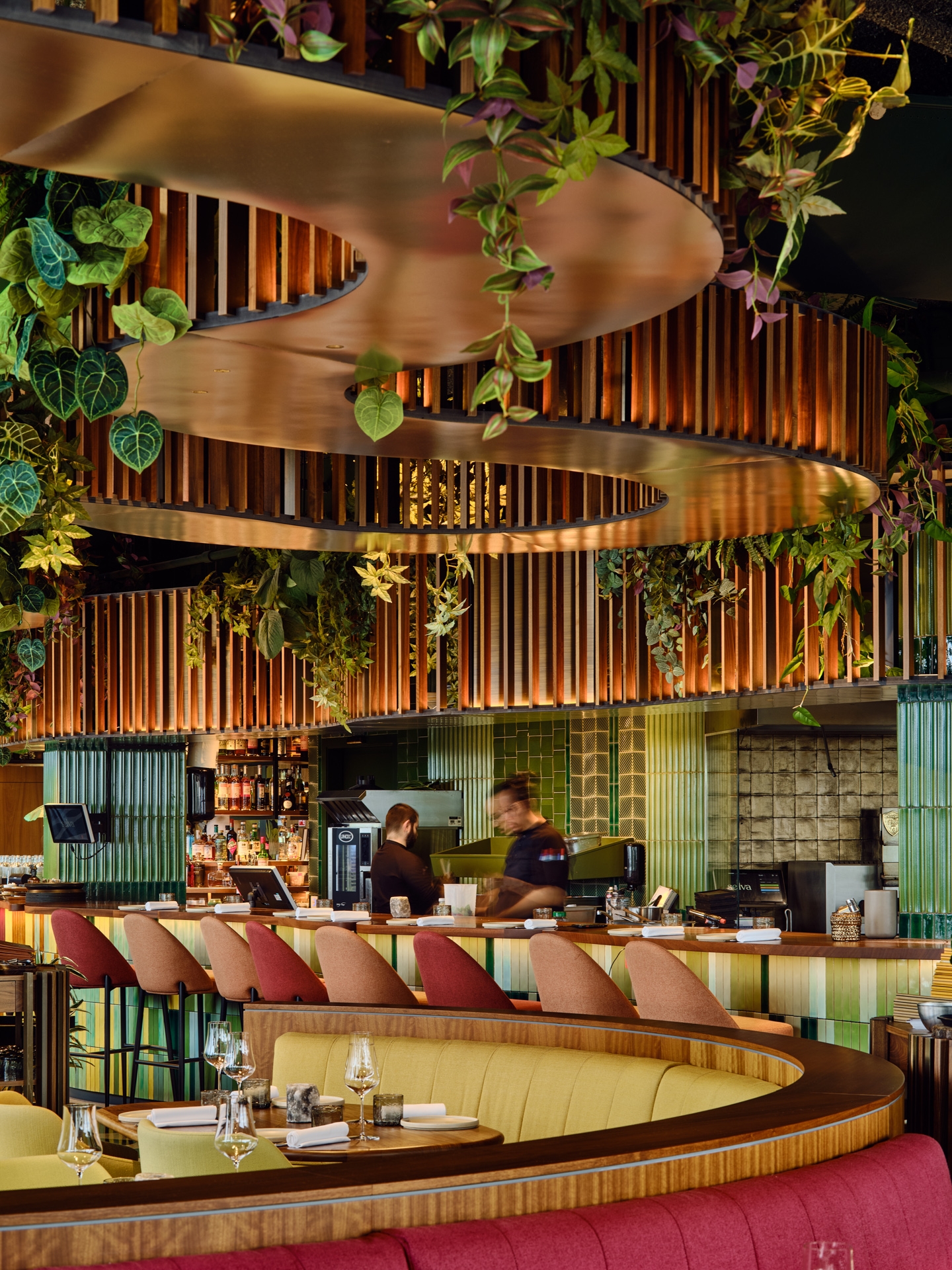 The colourful tile open bar evokes Latin American textiles and connects the open kitchen and drink station with the guest area. Textured wooden benches, seating and dividers help create an organic layout, inviting exploration and softening the industrial vibe.