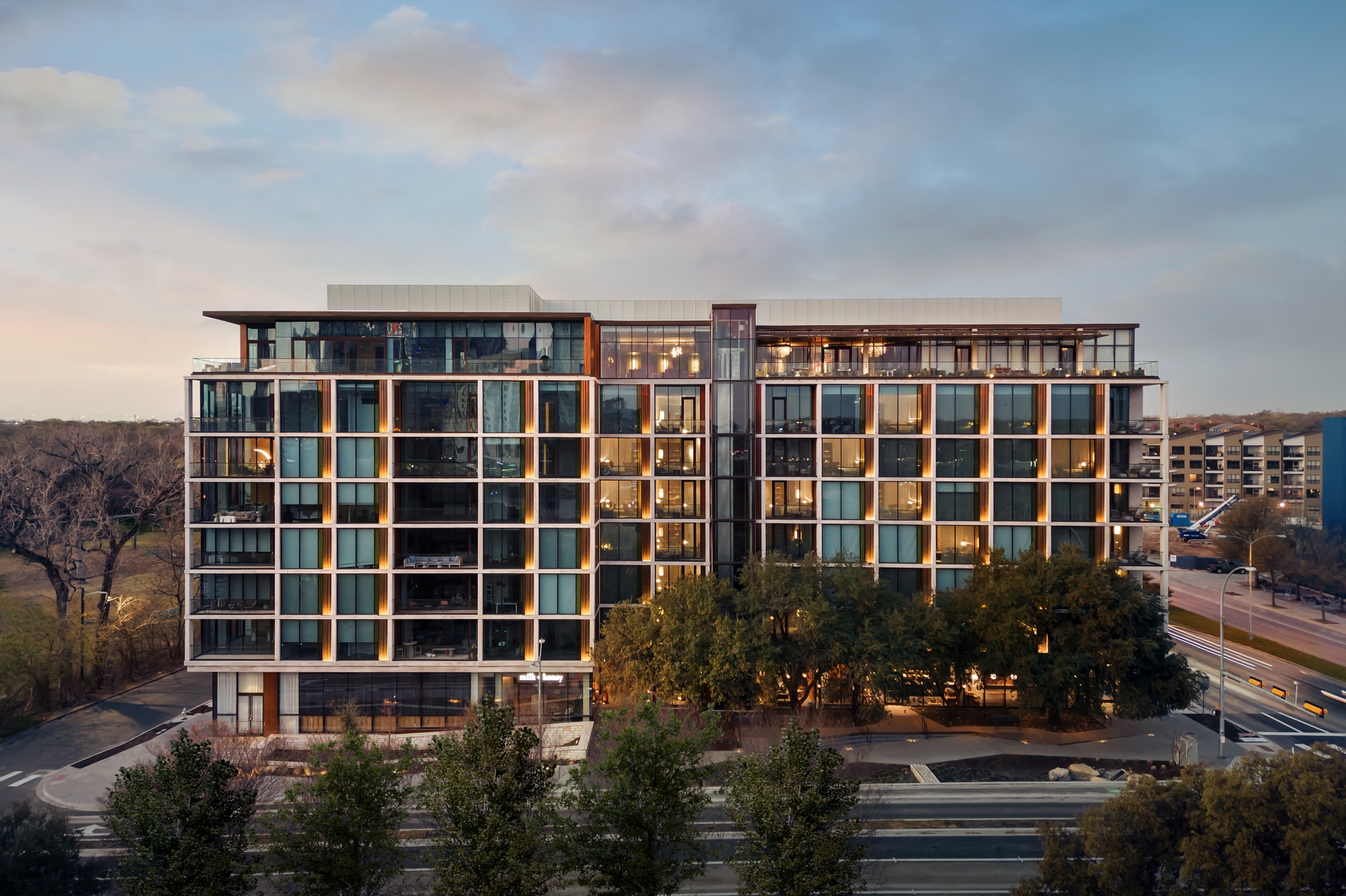 The Loren at Ladybird Lake is a 5-star, luxury mixed-use project in Austin, Texas. Drawing inspiration from the beloved Lady Bird Lake and Hike and Bike Trail in which it's nestled, this mixed-use project features 108 luxury hotel rooms and 23 residences with a decidedly treehouse feel. As expansive windows bring the outdoors in, deep green accents materialize the site’s context. The project pairs a concrete, brutalist understructure with handcrafted materiality, sophisticated furnishings, and contemporary art.