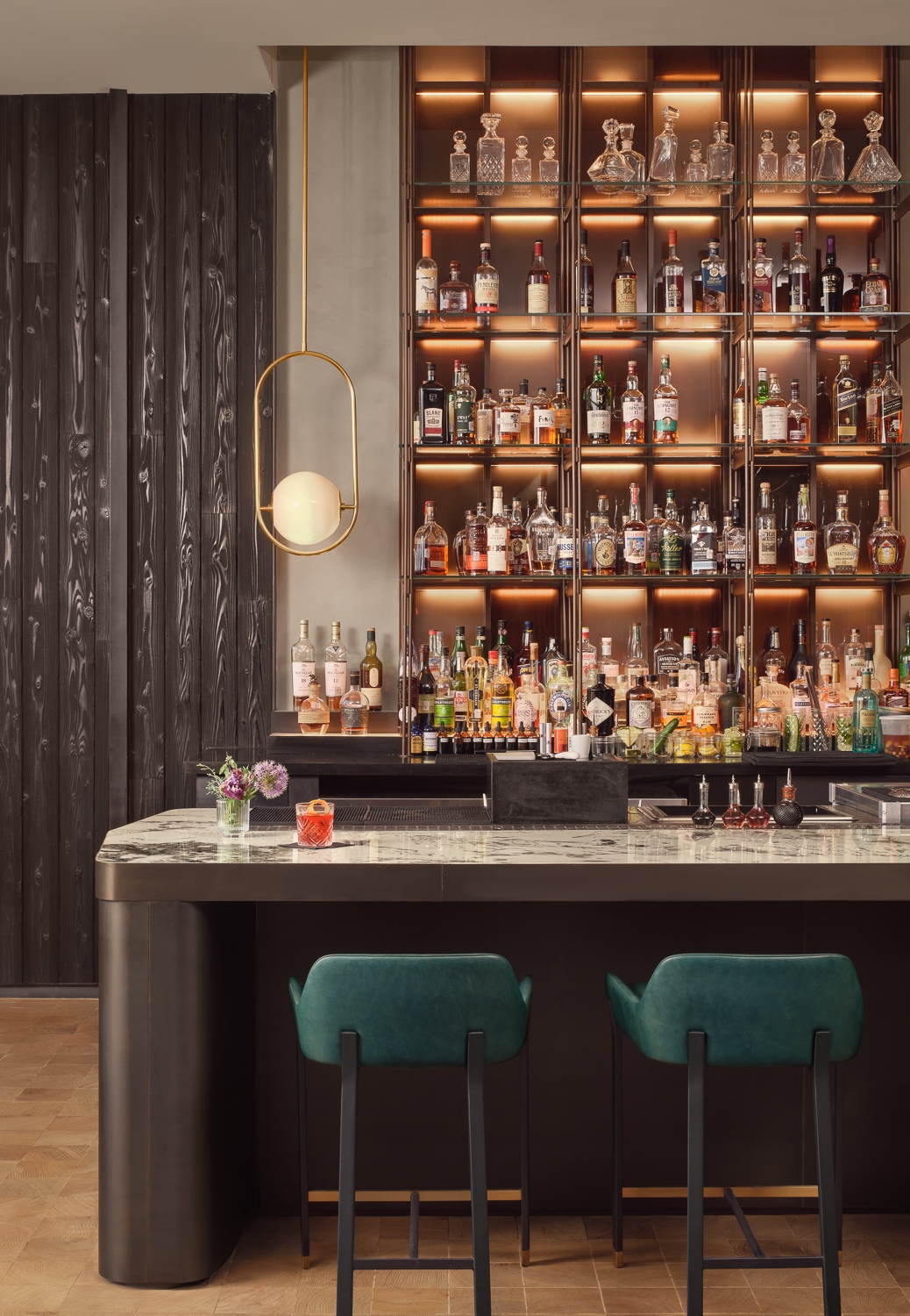 Wood details extend through the connected restaurant and bar space, including white oak end grain floors, walnut and steel screening, Shou Sugi Ban wall panels, and bespoke walnut banquettes. The curvilinear bar ceiling references the shape of a grand piano and envelopes guests in jewel-toned banquette seating. Layered lighting and rich materials carry through the other amenities, including the pool club, fitness room, spa, and café. This resulting design language reflects architectural tenets of honesty, durability, and delight.