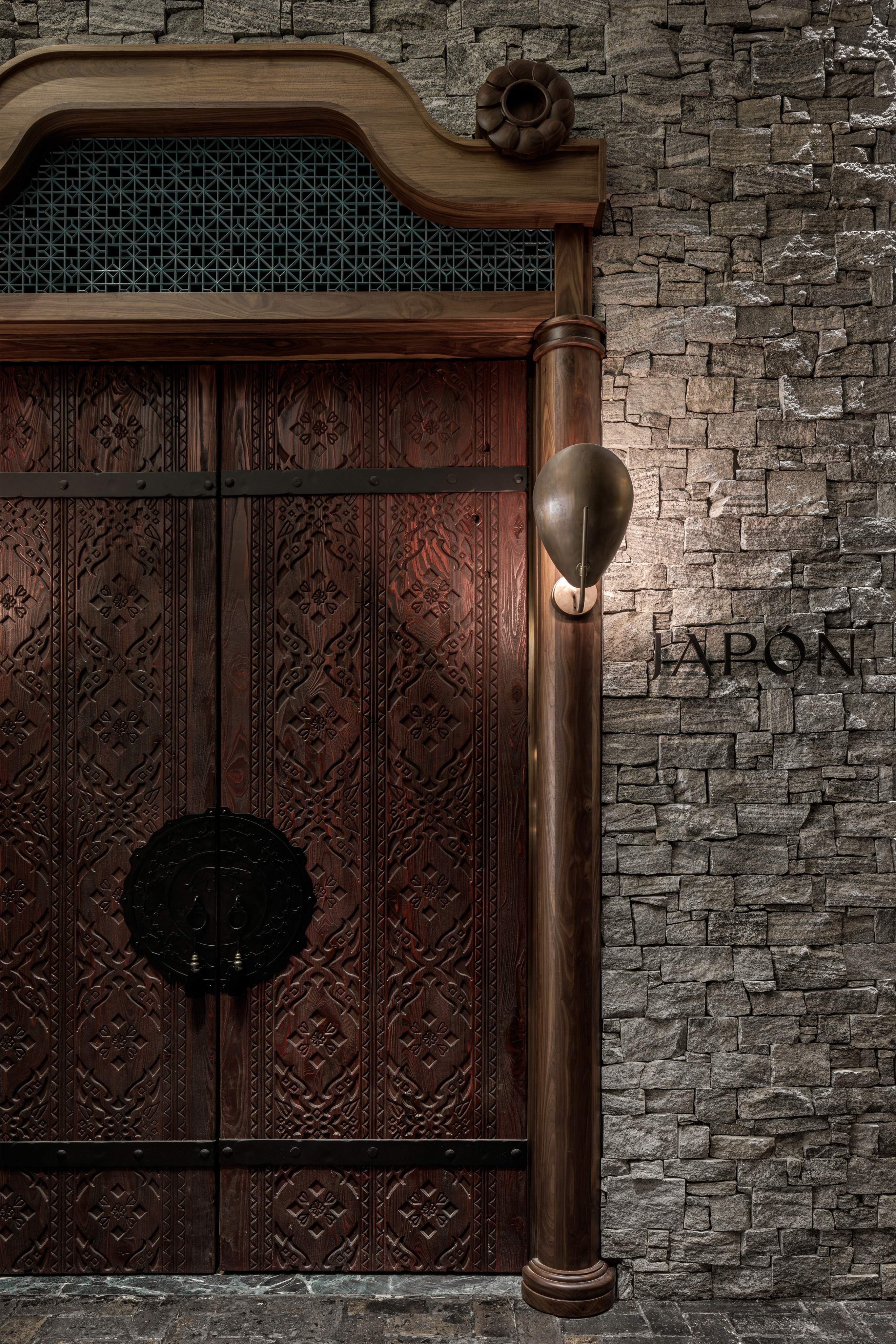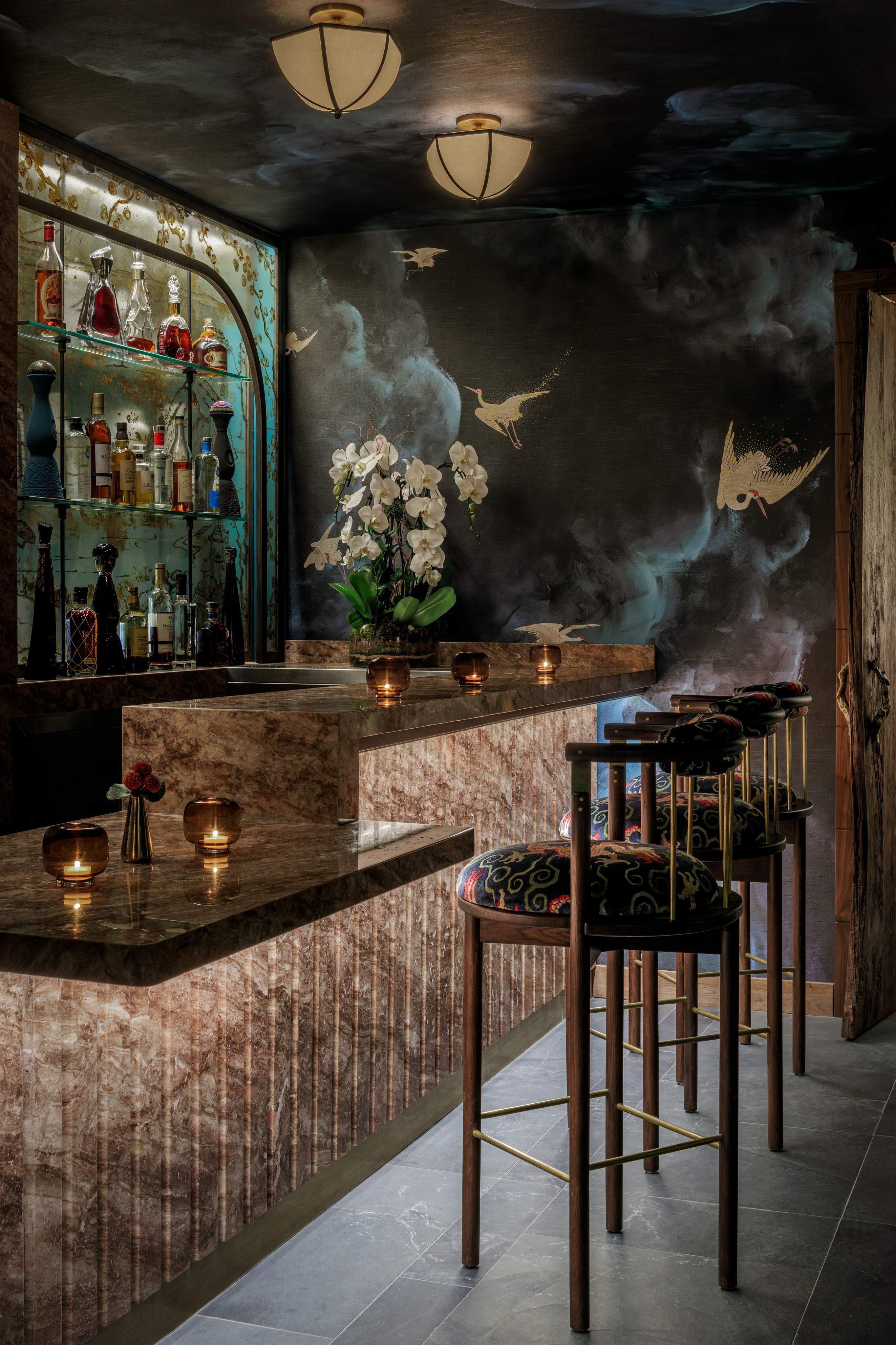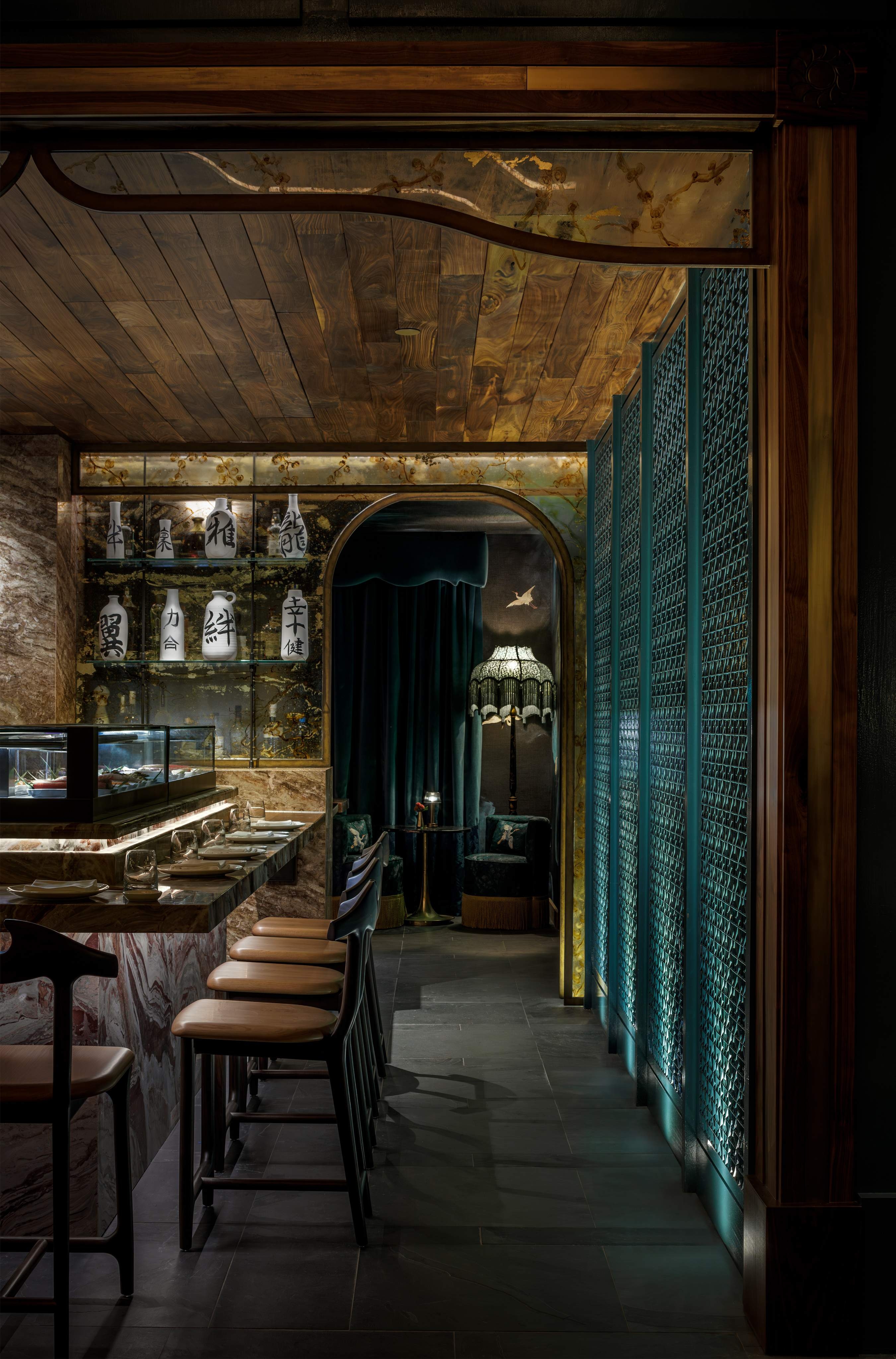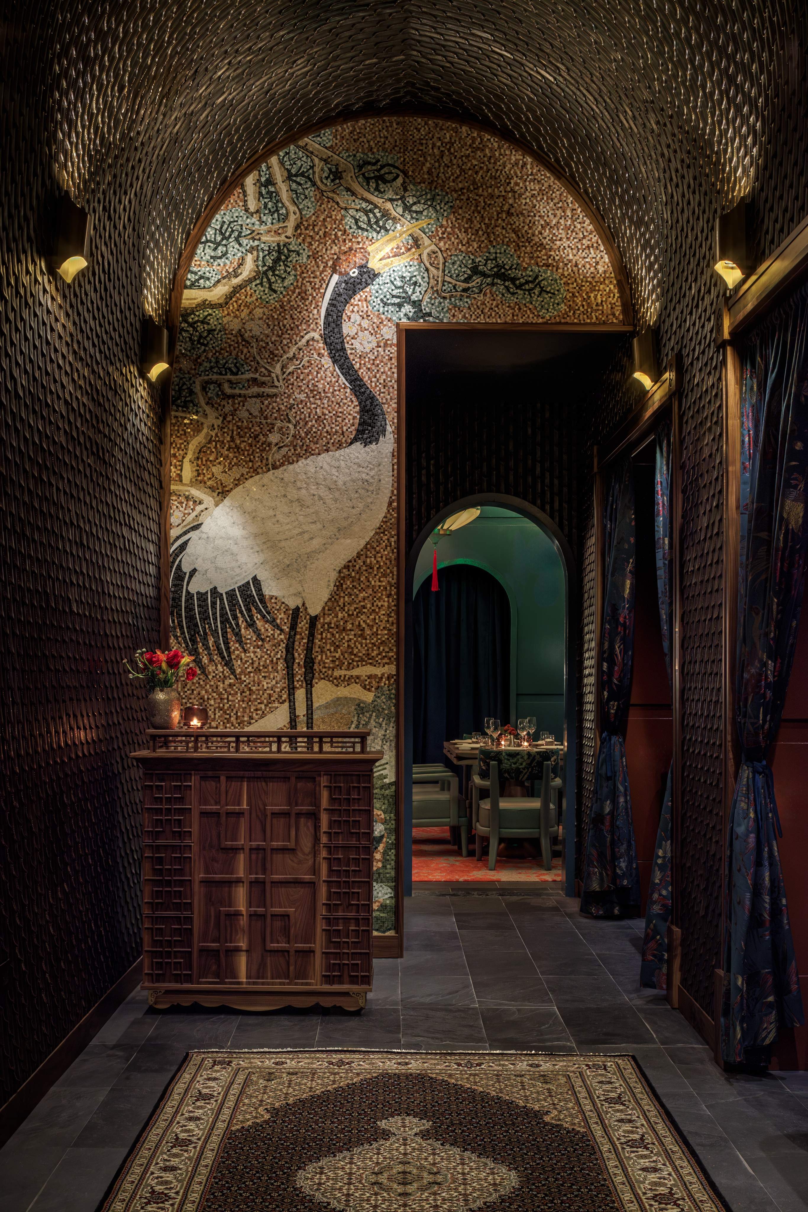 Manifesting its wings lives a mosaic crane at the entrance, where she greets you and envelops you in her embrace. She represents elegance and a natural beauty in this culture. The design consists of wall to ceiling feather tiles that frame said crane as she watches the beautiful scenery. From the scenery of the mosaic the color pallet of the rest of the restaurant emerges. The greenish blue hand painted glossy paneling talks to the modern elements of Japan while the patters, ceiling (which references the old temples), lighting, and textures represent the past. The motif of the crane continues to fly through the space as the fabrics reference the florals and scenery they have seen. As well as the hand painted gold foiled glass mural that draws you to the sea food display, private bar, and private dining room. The private bar is adorned with elaborate marble ribs and crane mural wallpaper. There are many modern twists on the furniture and lighting which brings a fresh view on the Asian culture. Japon is not just a restaurant it’s the elegance, traditions, hand crafted details of the passage through time.