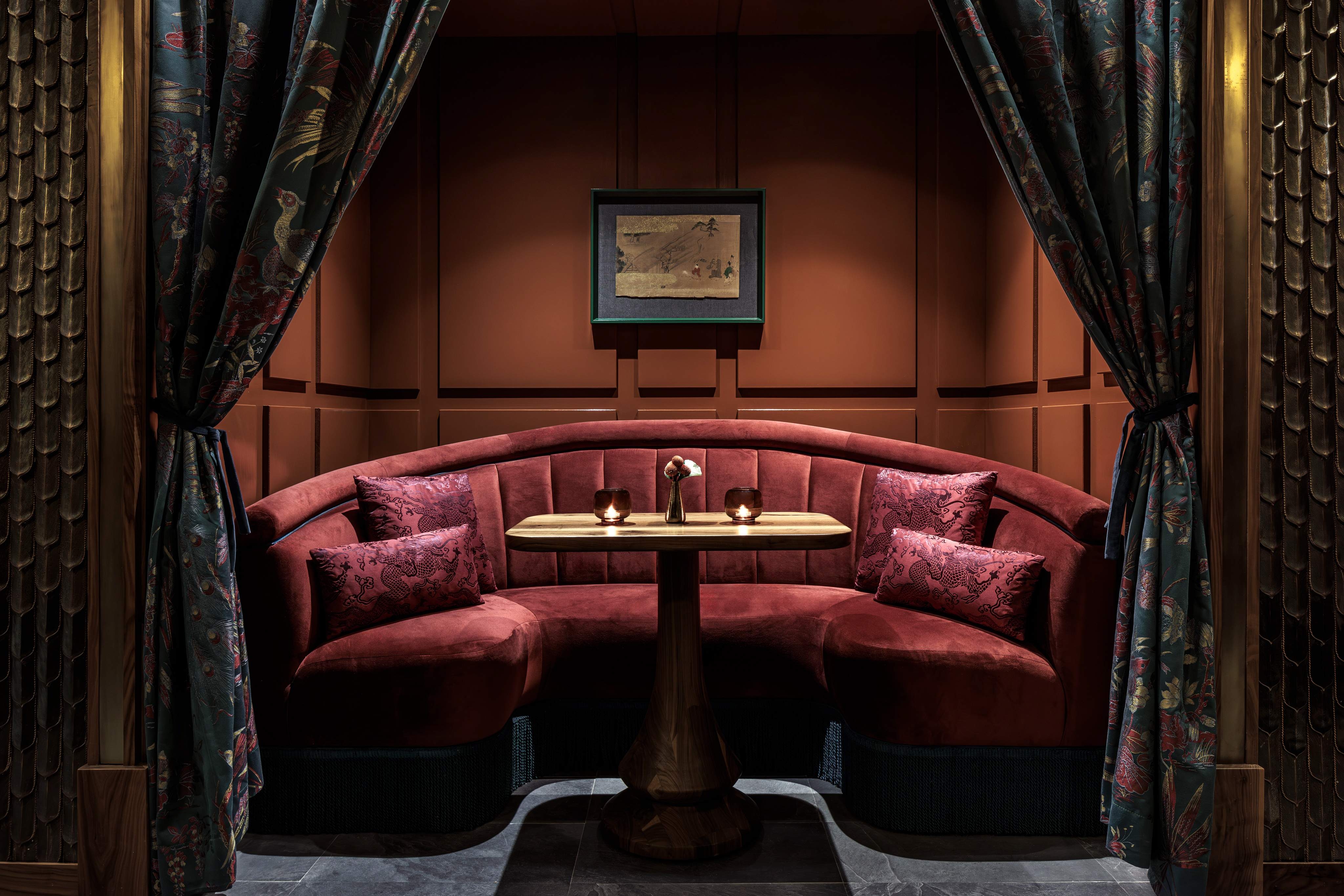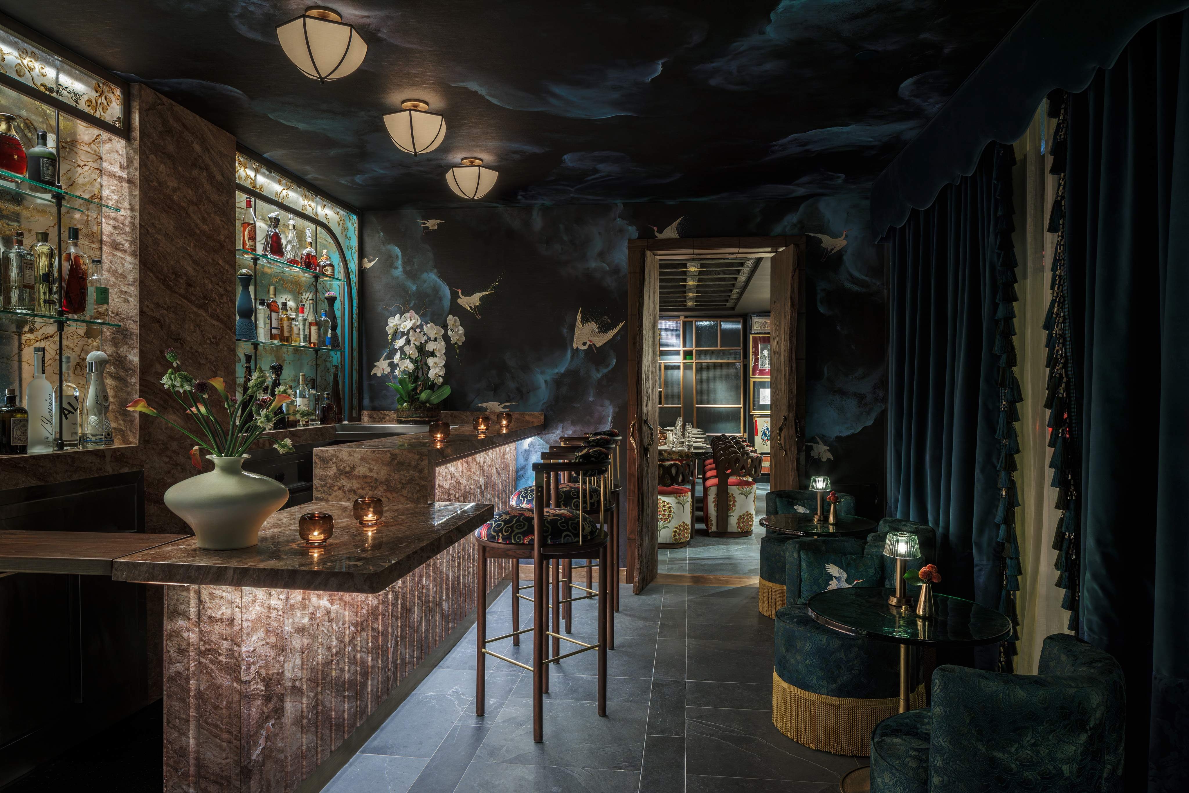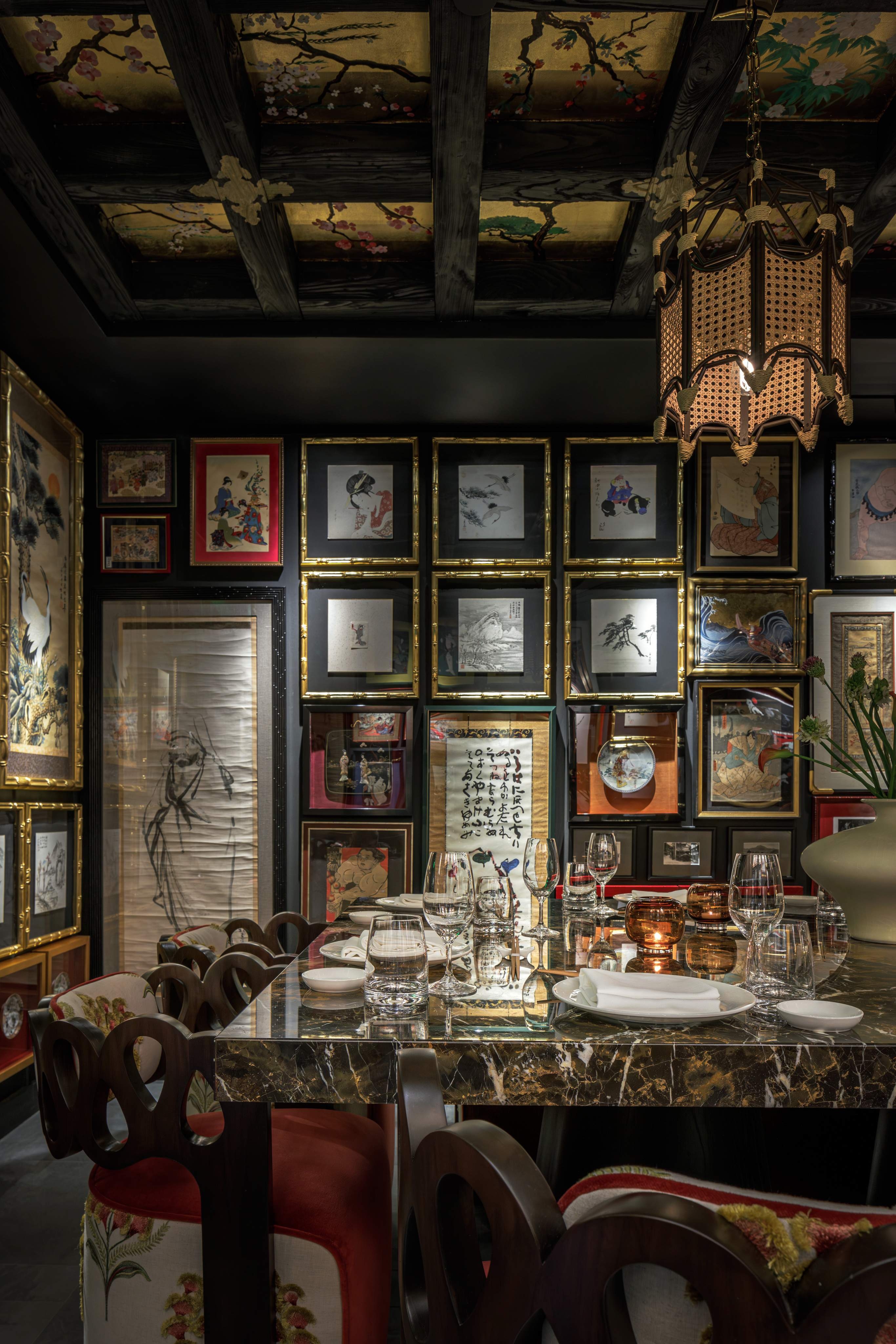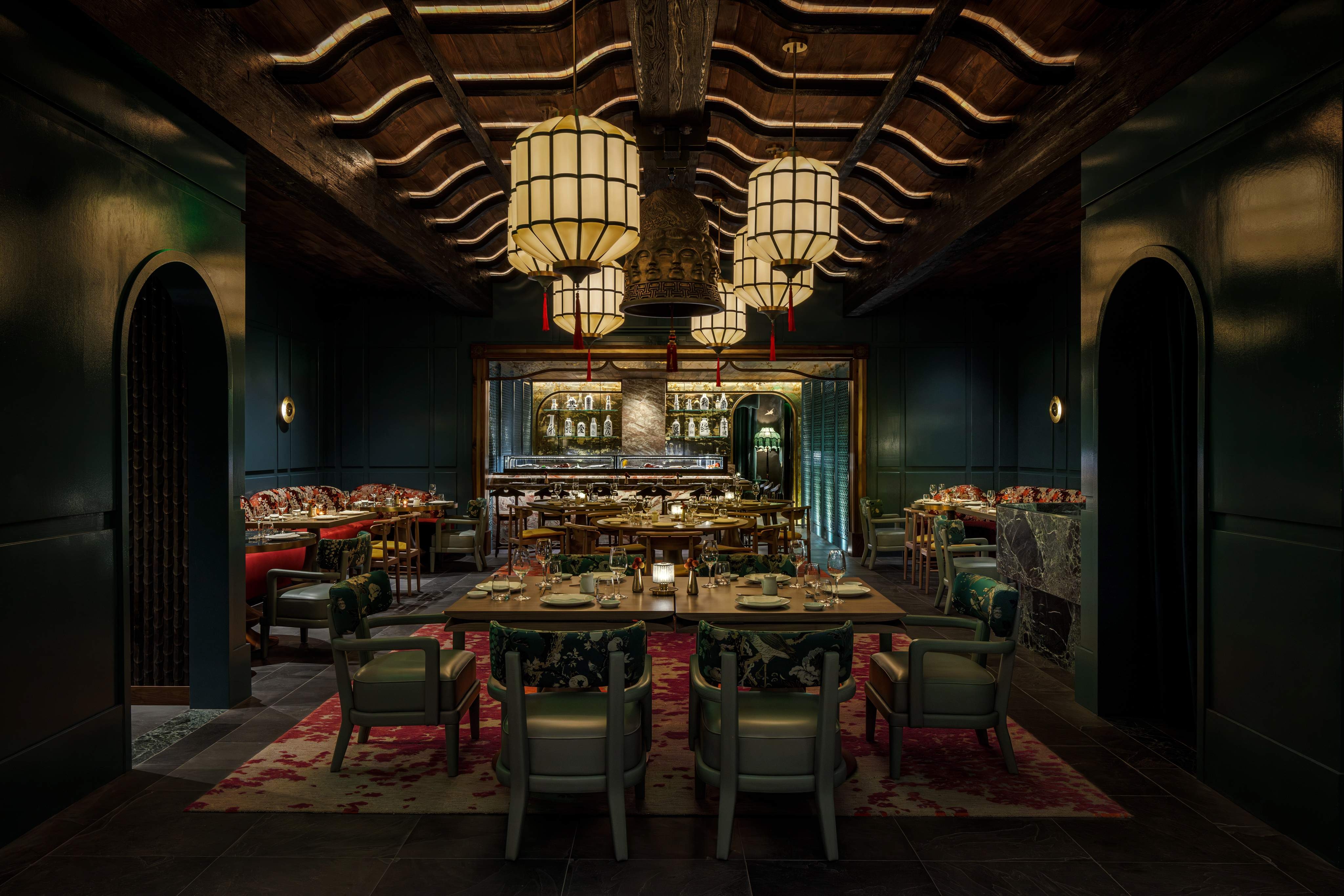 Manifesting its wings lives a mosaic crane at the entrance, where she greets you and envelops you in her embrace. She represents elegance and a natural beauty in this culture. The design consists of wall to ceiling feather tiles that frame said crane as she watches the beautiful scenery. From the scenery of the mosaic the color pallet of the rest of the restaurant emerges. The greenish blue hand painted glossy paneling talks to the modern elements of Japan while the patters, ceiling (which references the old temples), lighting, and textures represent the past. The motif of the crane continues to fly through the space as the fabrics reference the florals and scenery they have seen. As well as the hand painted gold foiled glass mural that draws you to the sea food display, private bar, and private dining room. The private bar is adorned with elaborate marble ribs and crane mural wallpaper. There are many modern twists on the furniture and lighting which brings a fresh view on the Asian culture. Japon is not just a restaurant it’s the elegance, traditions, hand crafted details of the passage through time.