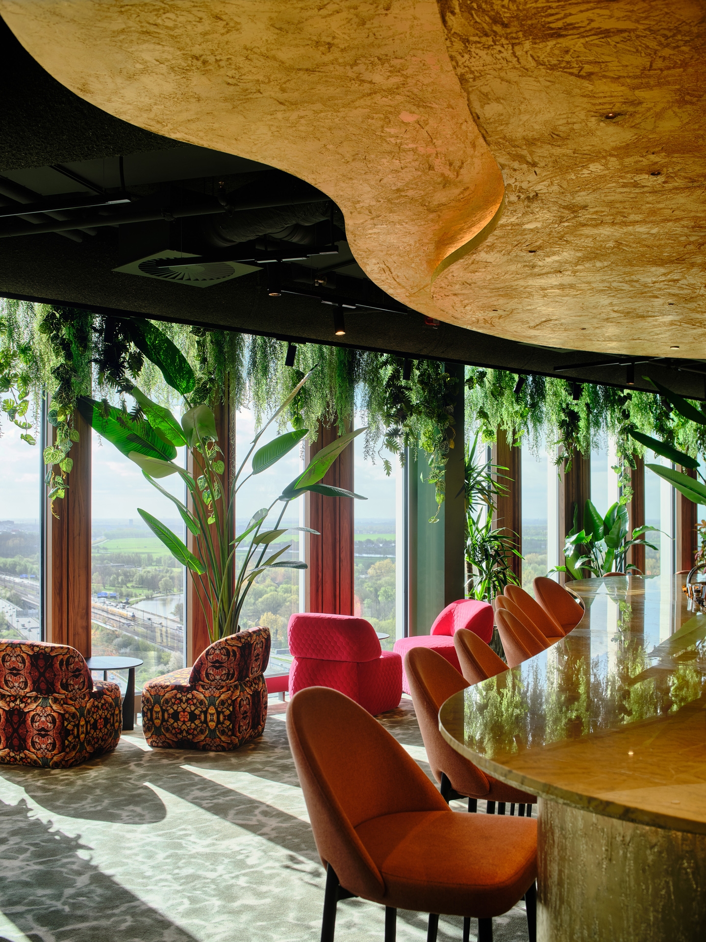 The triangular, compact space has stunning views of Amsterdam's new outskirts, thanks to an impressive floor-to-ceiling glass façade designed by OMA studio.