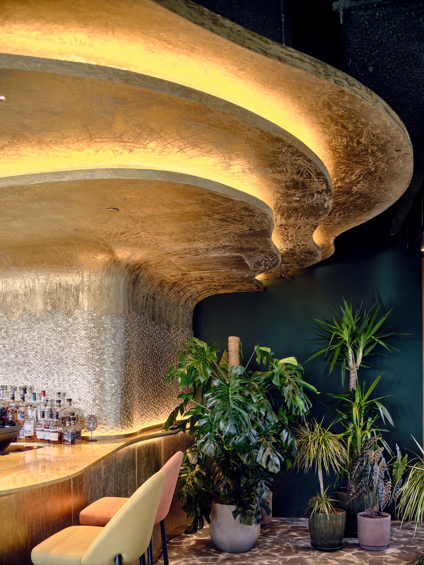 The cocktail bar's gleaming golden finish stretches to the ceiling, evoking pre-Columbian gold figures and the "El Dorado" legend.