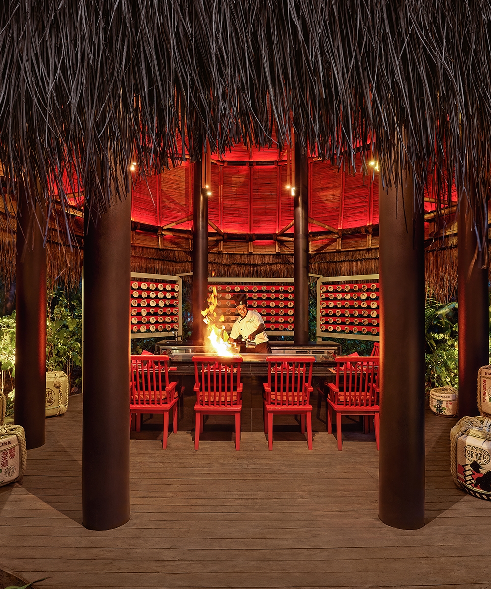 Nest at offers a unique and immersive dining experience nestled in the heart of a tropical forest. Elevated among the treetops, this destination redefines Asian Fine Dining cuisine through a perfect fusion of nature, innovative design, and culinary artistry. Combining luxury with sustainability, Nest provides guests with an experience that is both adventurous and indulgent. The experience begins with a stroll along the meandering boardwalk through the jungle’s overgrown vines. The magic of Nest then reveals itself under the canopy of a banyan tree decades in the making. On the ground floor, thatched-roof huts centre around the showcase teppanyaki, where fiery flavours await. Alternatively, guests can ascend the spiral staircase, then cross the bridge to their dining platform suspended six metres in the air.