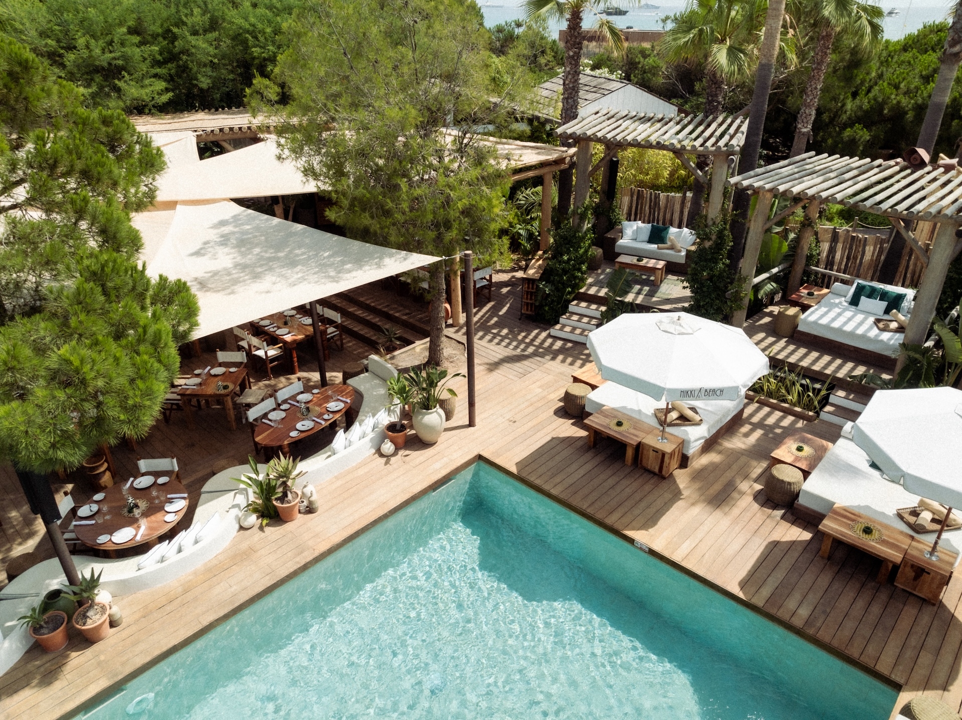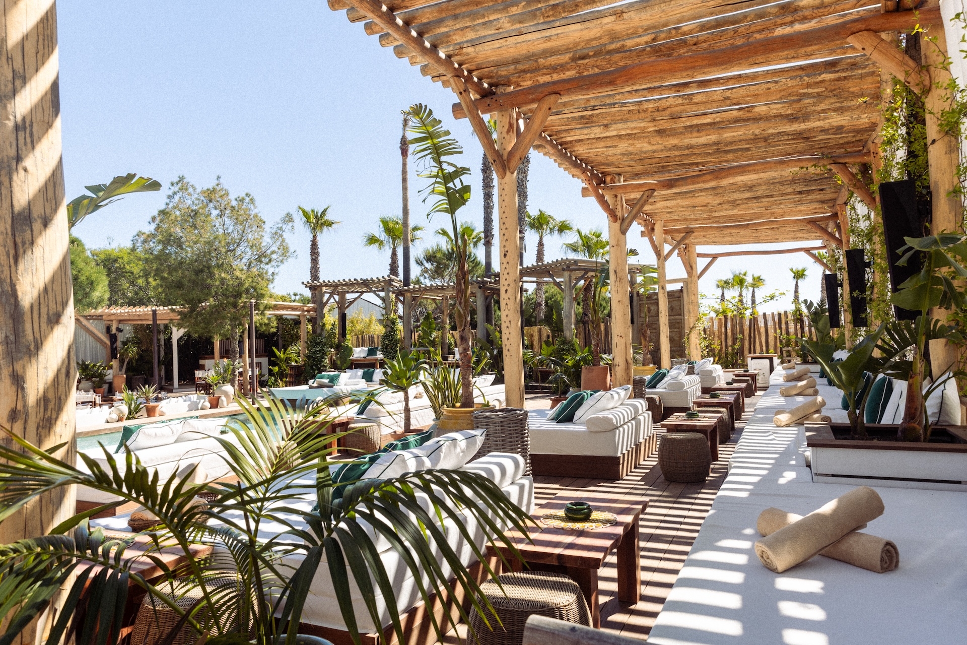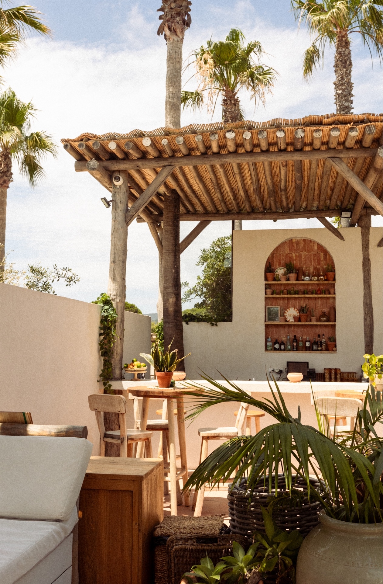 The Mediterranean-inspired bar, with its arched shelving crafted from organic materials, exudes timeless artistry. Just steps away, the pool area is a haven of relaxation, featuring soft daybeds shaded by wooden pergolas, creating a lavish retreat for sunseekers.